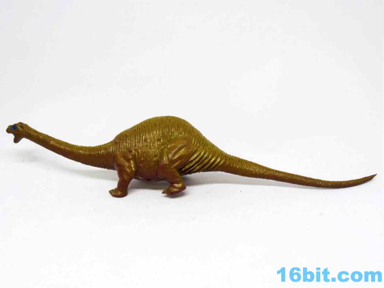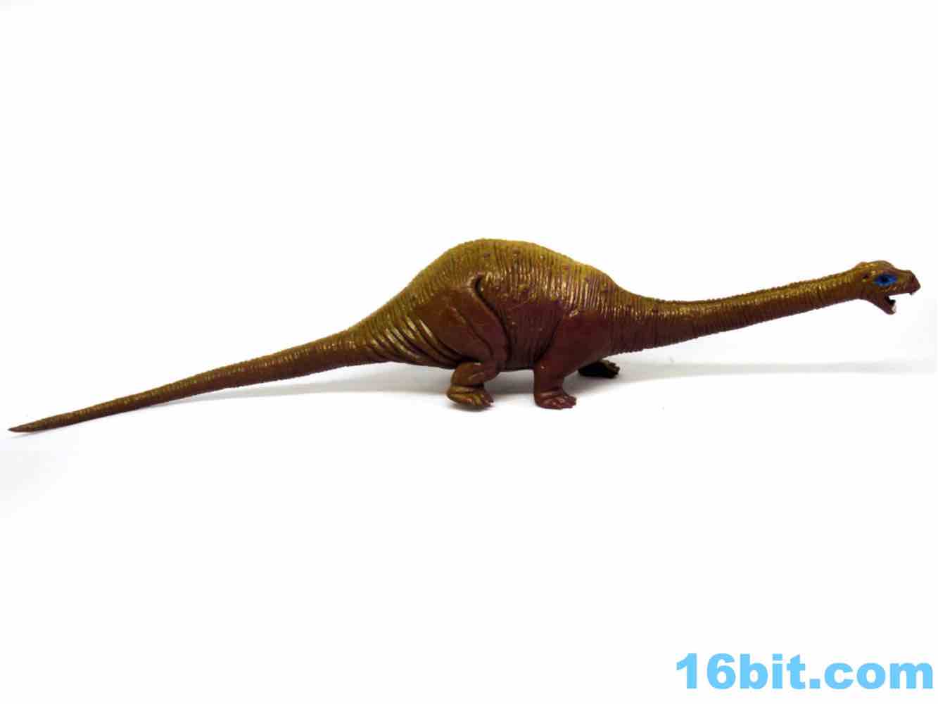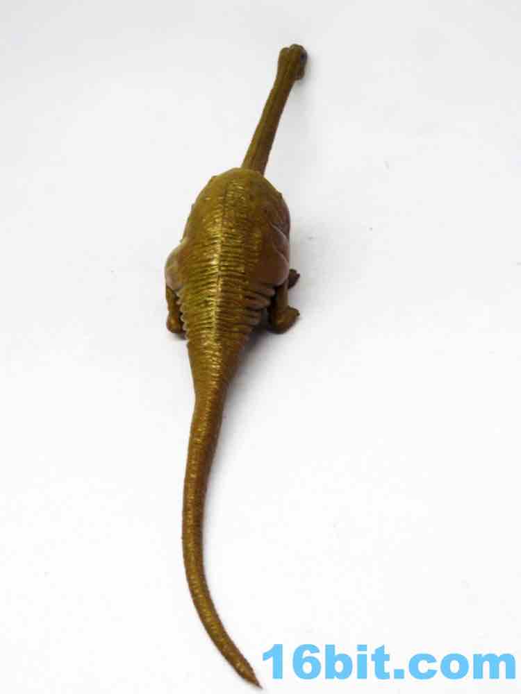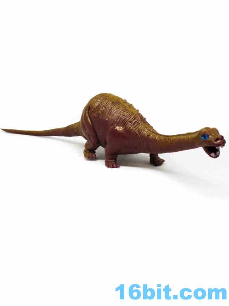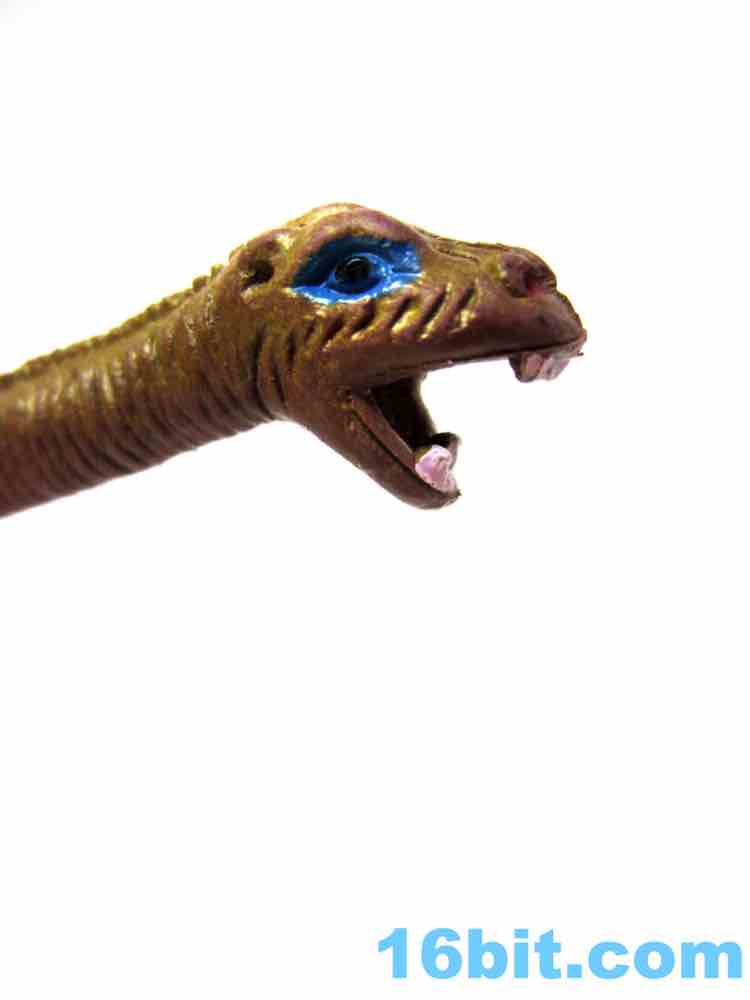 The 11-inch long sauropod could just as easily be a brontosaurus or something else - but how can you tell? The big bulky belly has a long, thin neck and tail. At the end of the tail is a nice point. At the end of the neck is a rodent-like face with four horrifying teeth, black eyes covered in blue eye shadow. Rarely do these kinds of dinosaurs look anything but serene or majestic, so to see one looking like it's going to fight, or scream, or roar, or get a drink in Gasoline Alley.