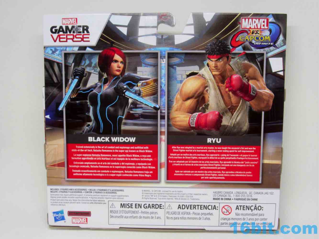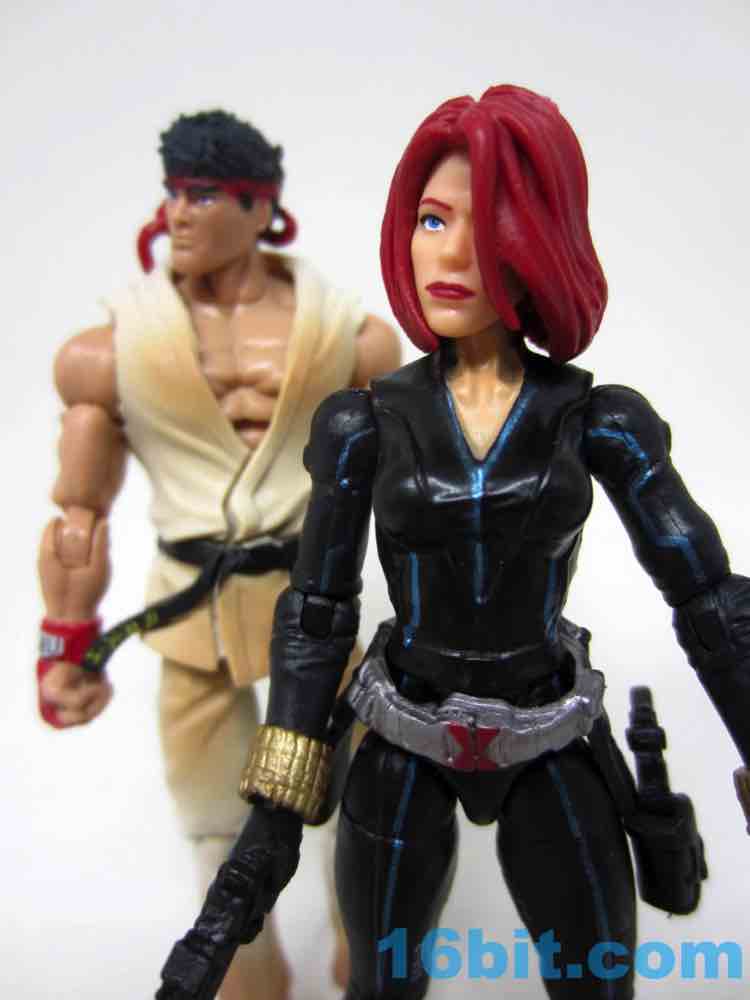 Each figure is about 4-inches tall, loaded with articulation. This is sometimes good and sometimes not. Ryu is built similarly to Hasbro's better Marvel and G.I. Joe figures, with preposterous quantities of joints and swappable fists - and a decent, but not great, head sculpt. Black Widow is typical Hasbro Marvel fare, down to one of the most perpetual, irritating, and I dare say easily fixed unforgivable design decisions that put me off collecting this line in its entirety early on. I like it, mostly, but having the date stamp and SKU visible on the front of the right thigh is this horrible thing Hasbro did a lot around 2009-2011 and I thought we would never see again. Well, I was wrong.