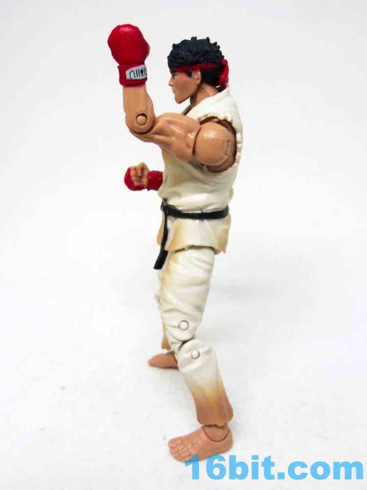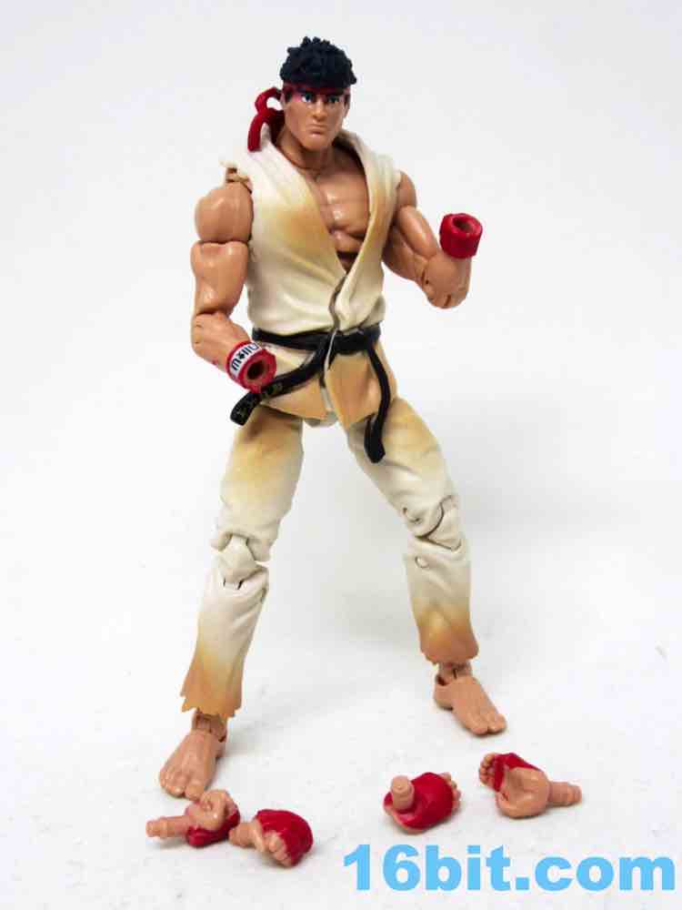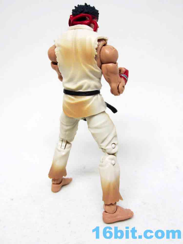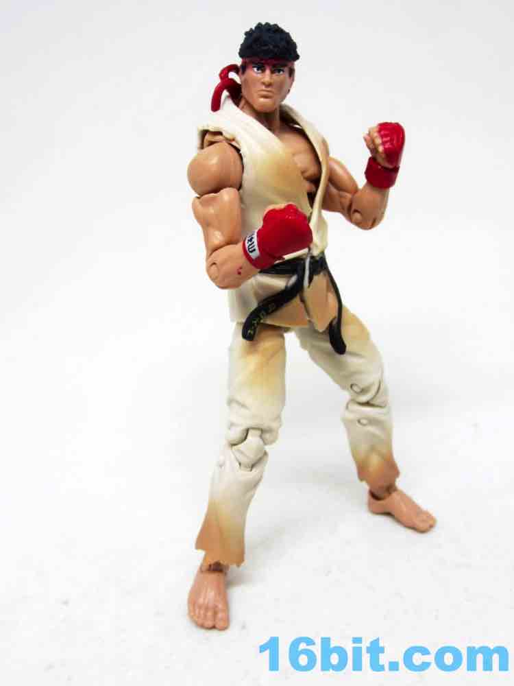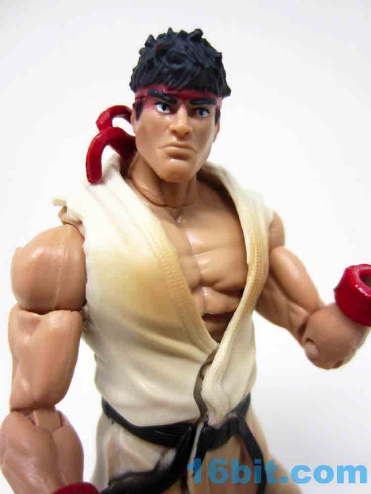 Ryu sports 24 points of meaningful articulation and waist joints 100% hindered by his rubber gi. If this figure does repurpose parts from another toy, I don't recognize them - I think it's an all-new sculpt, complete with swappable fists and "hadouken" hands that stick in the wrists nicely thanks to thick pegs. The arms have a good range of motion but lack double-jointed elbows, which is forgivable given Ryu is usually shown throwing punches and not contorting himself. What's less lovely is that he can't move his arms in over his chest very much thanks to the gi, so getting that perfect fireball pose is a real tricky thing to do. Other poses work well if you have a small doll stand handy. I like the sculpting, and the headband shows real improvement on tiny head detailing that we haven't seen before.