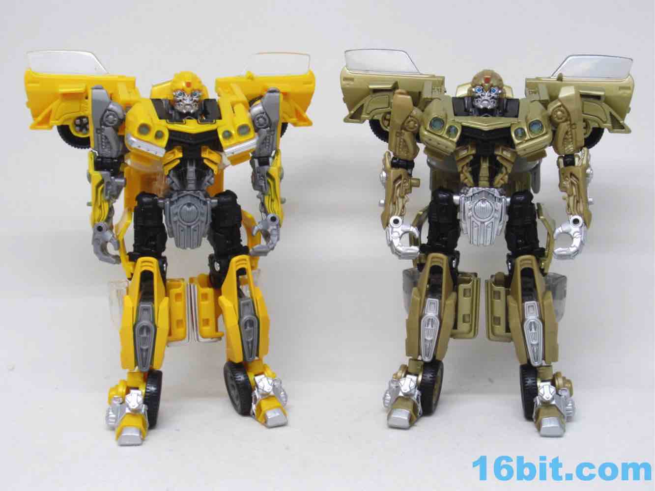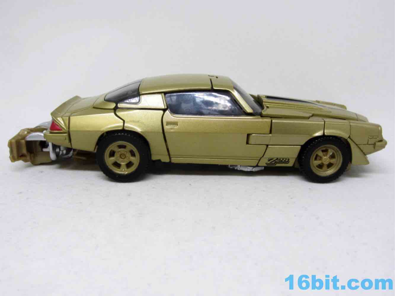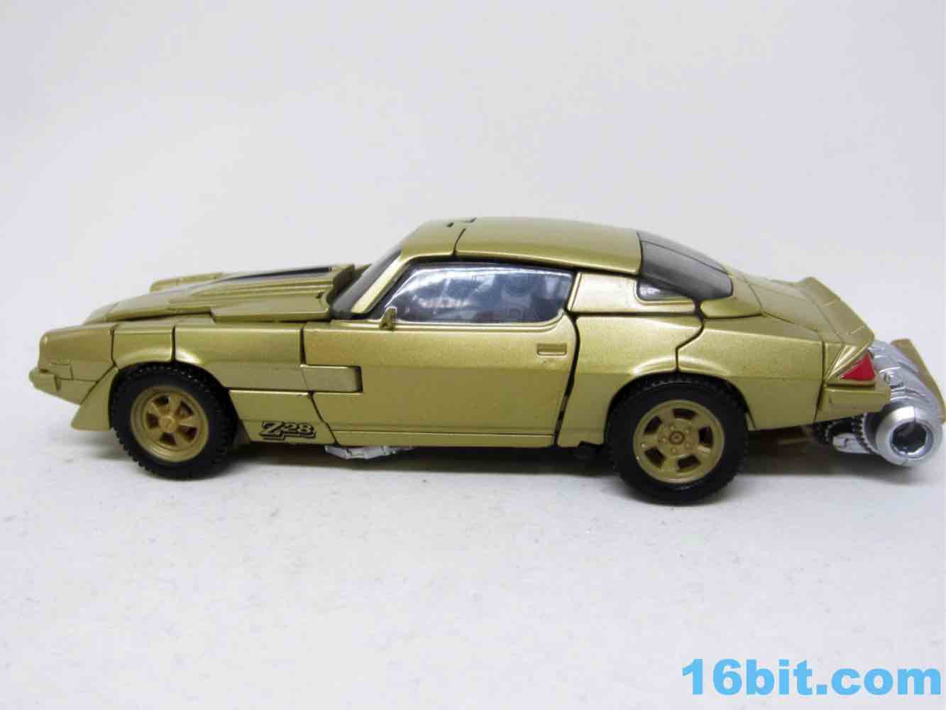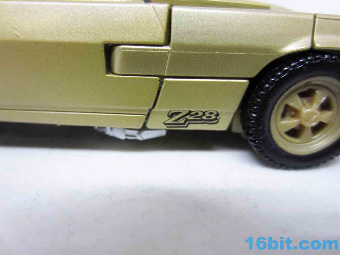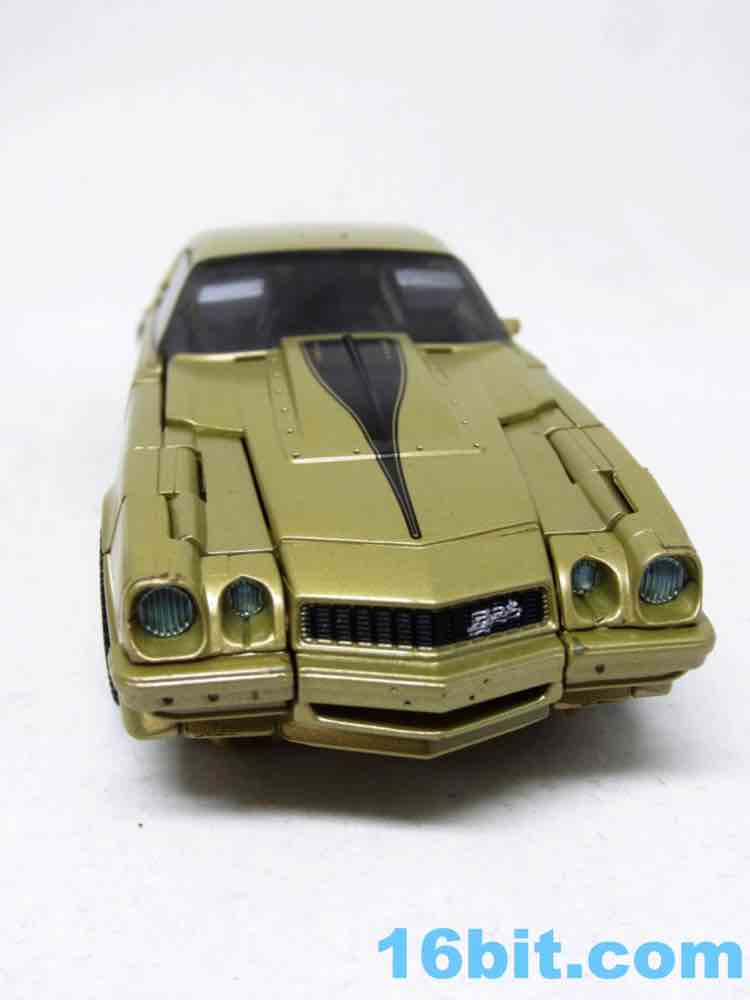 Bumblebee is a bit more than just a palette swap. The car detailing is noticeably different, with added details and words painted on the car that you don't normally see on the yellow version."Z28" and "Bumblebee"'s movie logo with a stinger appear on the body of the vehicle, but are generally hidden in the golden robot mode. The toy is slathered in paint, but the unpainted gold bits look good too. There's a lot more bright silver rather than just dull grey, offering a nice contrast to the first release of the mold [FOTD #1,947]. I find the figure pops apart a lot more easily and is more finicky, but perhaps yours will be less of a pain in the neck. The gold and silver go together nicely and in person it's quite gorgeous - but it's thoroughly inessential to having a complete Studio Series scale collection since so many versions of this Bumblebee exist. Heck, the Autobot makes up about 1/3 of the line so far.