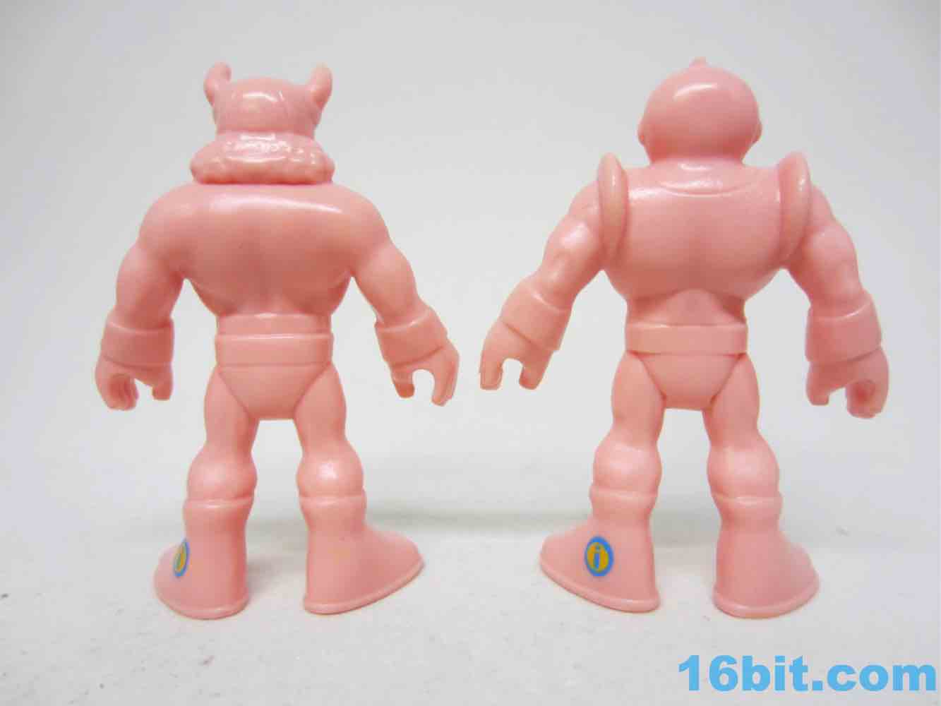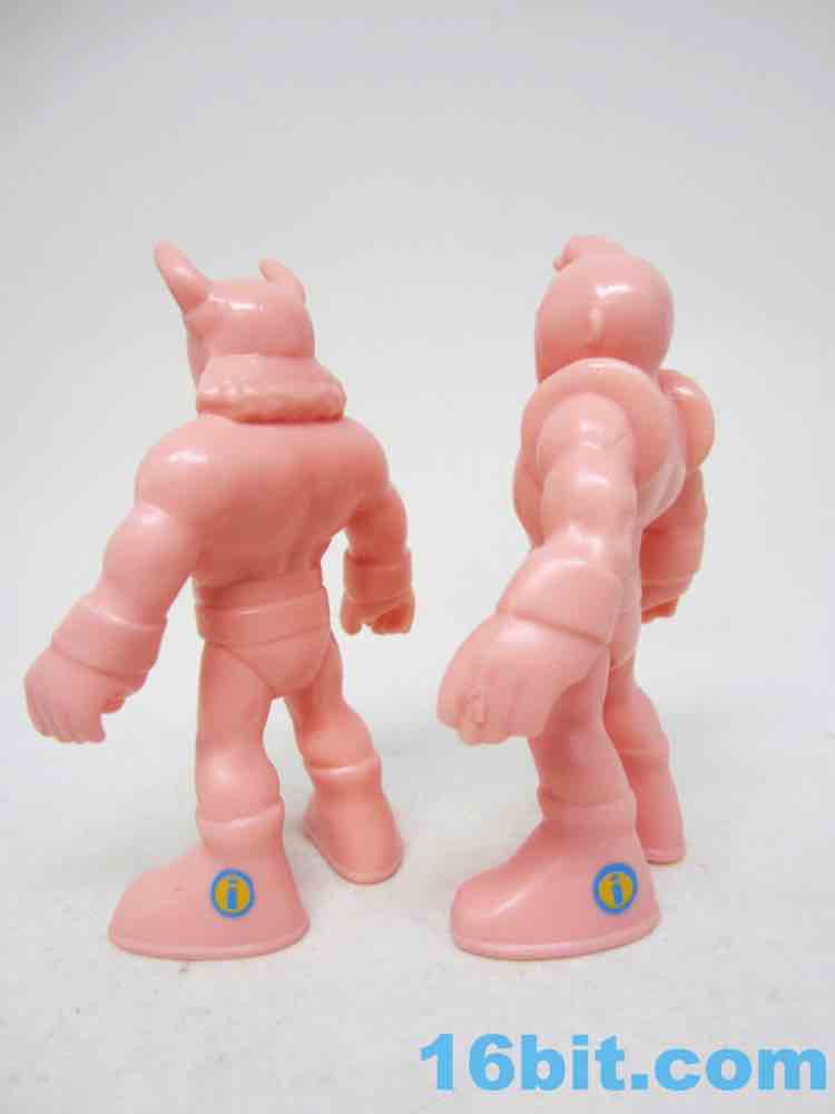 Each 3-inch figure is a weird rubbery texture that's flexible, not unlike the original figures. The pink is different, and for all I know is scientifically impossible to replicate since nobody is getting it right. The two new figures have added painted face details rather than relying on shadows like the original unpainted wrestlers. They can use the footprints on the playsets, hold accessories in their open hands, and fight one another. But their arms can't move, nor can their legs, nor can their necks. It's two slug figures, hence why there's no accessories and limited paint. There's an ankle mark with the "I" symbol which matches their belt buckles in style, but not color.