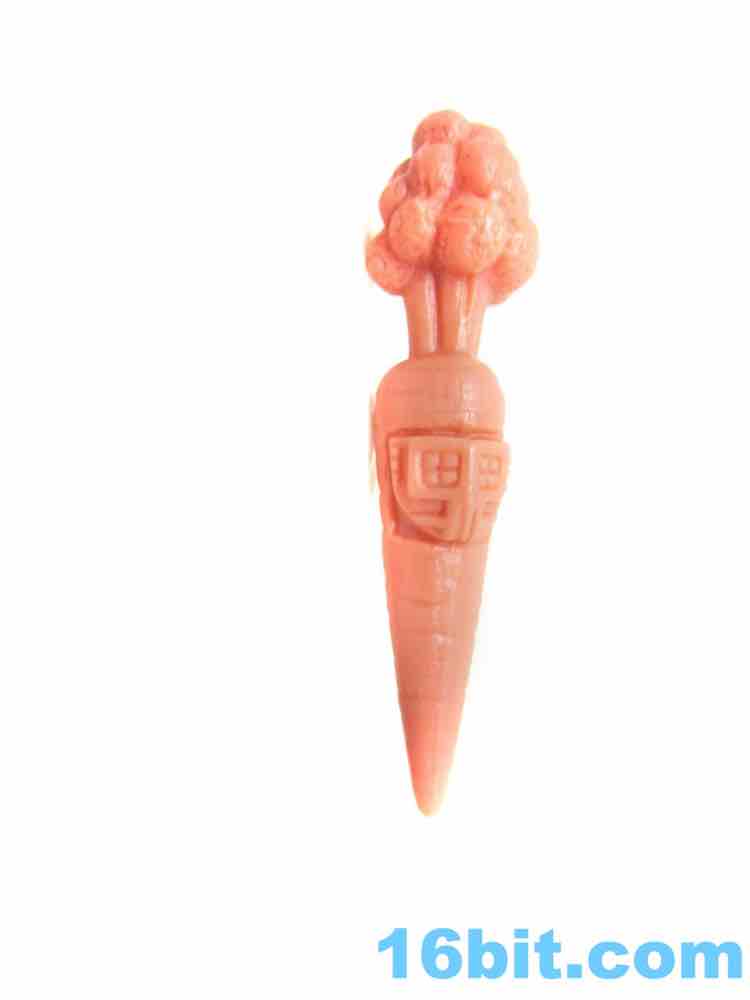 The joke is on you with Bionic Carrot, "The SixDollar Produce Man. The original toy was essentially a Little People body with some tech glued on it and a green stem out top. The mini-figure is a full carrot based on that premise, meaning it can't stand since it has no feet or other flat element. It just lays there, and makes you sad you can't do anything with it other than use it as an accessory with other, bigger figures. The sculpting is good - it's just not a lot you can enjoy beyond letting it flop on a lat surface.