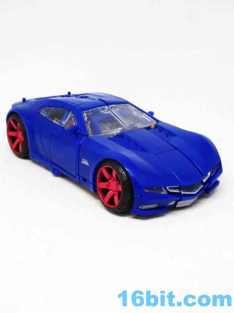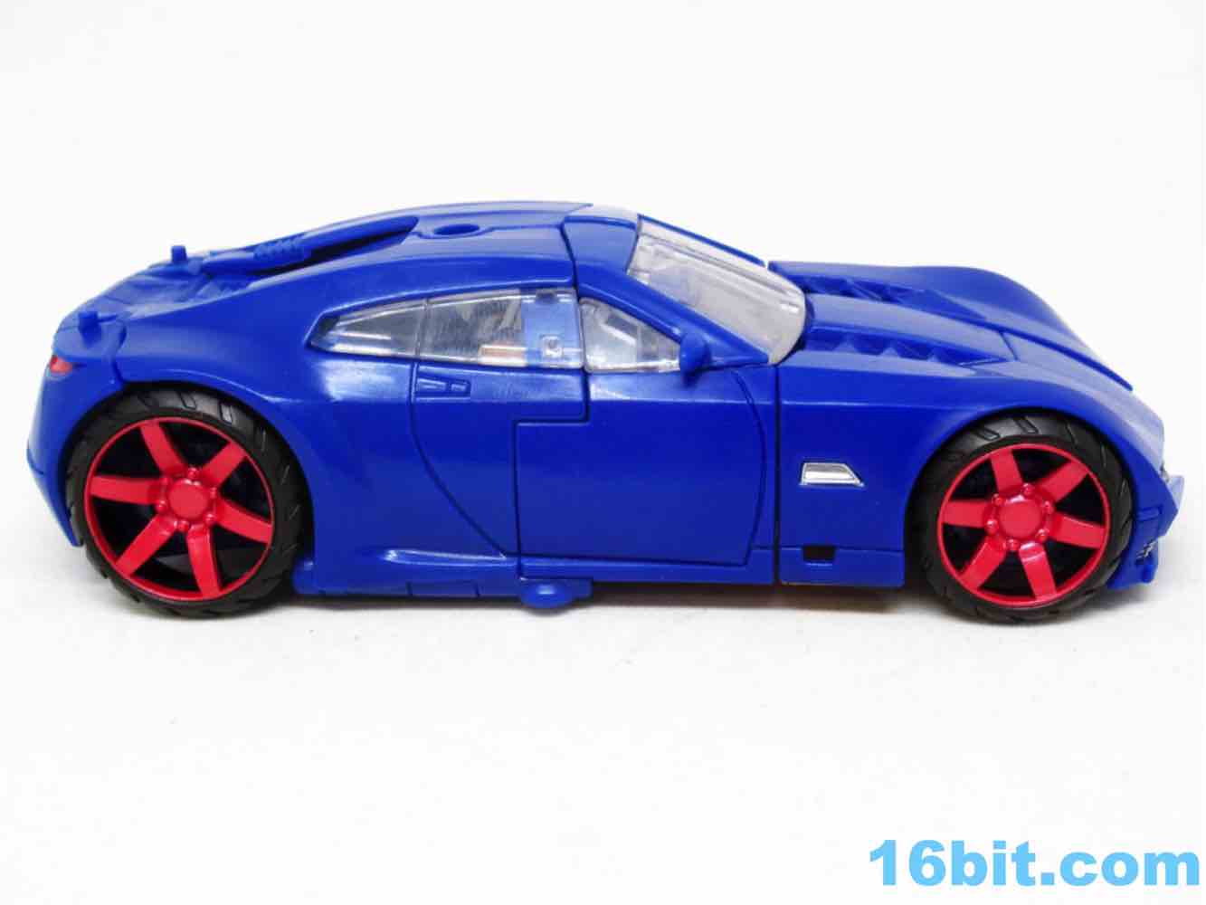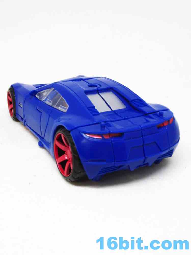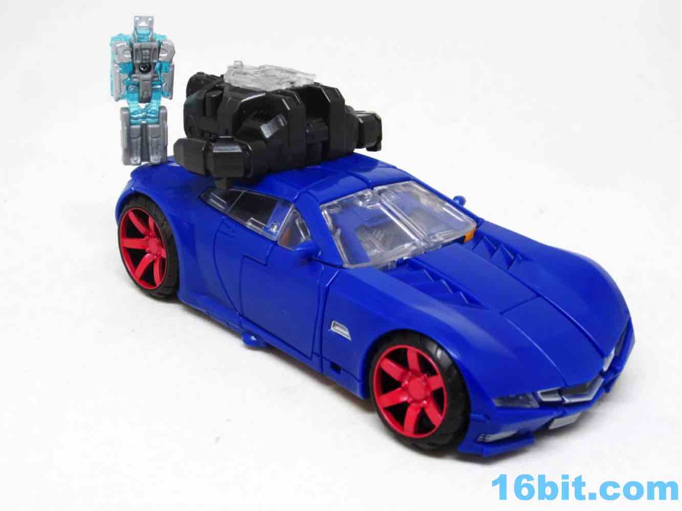 The car looks as good as or better than most of the other cars as of late. You get clear windows (minus the rear window), painted red wheels, and... admittedly, not much other deco outside the bumpers. The real car covers up some fake car kibble with a Decepticon symbol, giving you a fine blue car that's of not particular make or model. It's a delightful little car, but as always it doesn't do much. You'll find tiny pegs on the back for your Prime Masters and Titan Masters, plus a 5mm port on the roof for the Prime Armor fist or a gun or whatever. It's a car. What were you expecting?