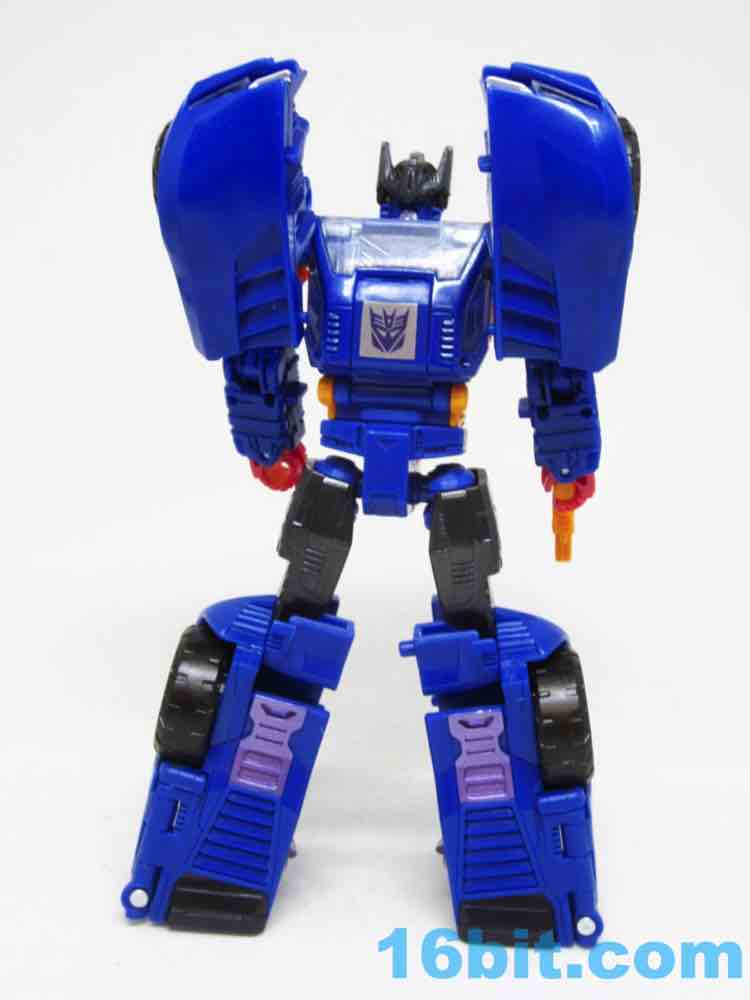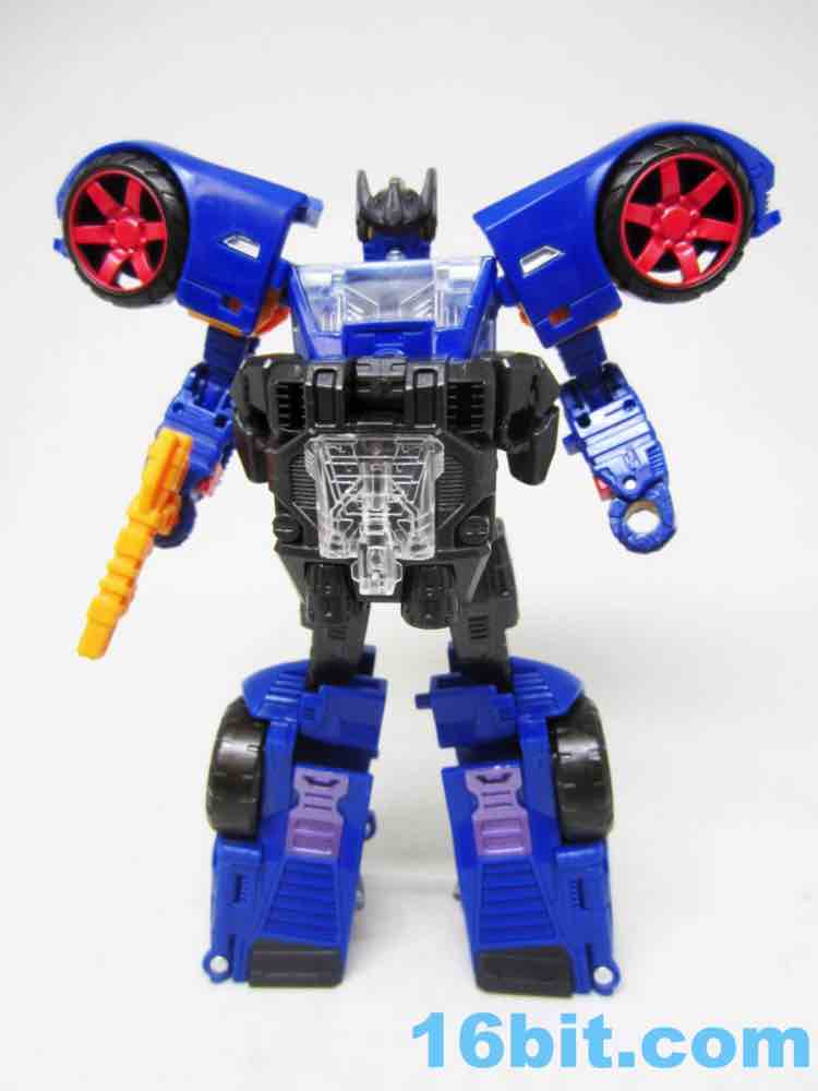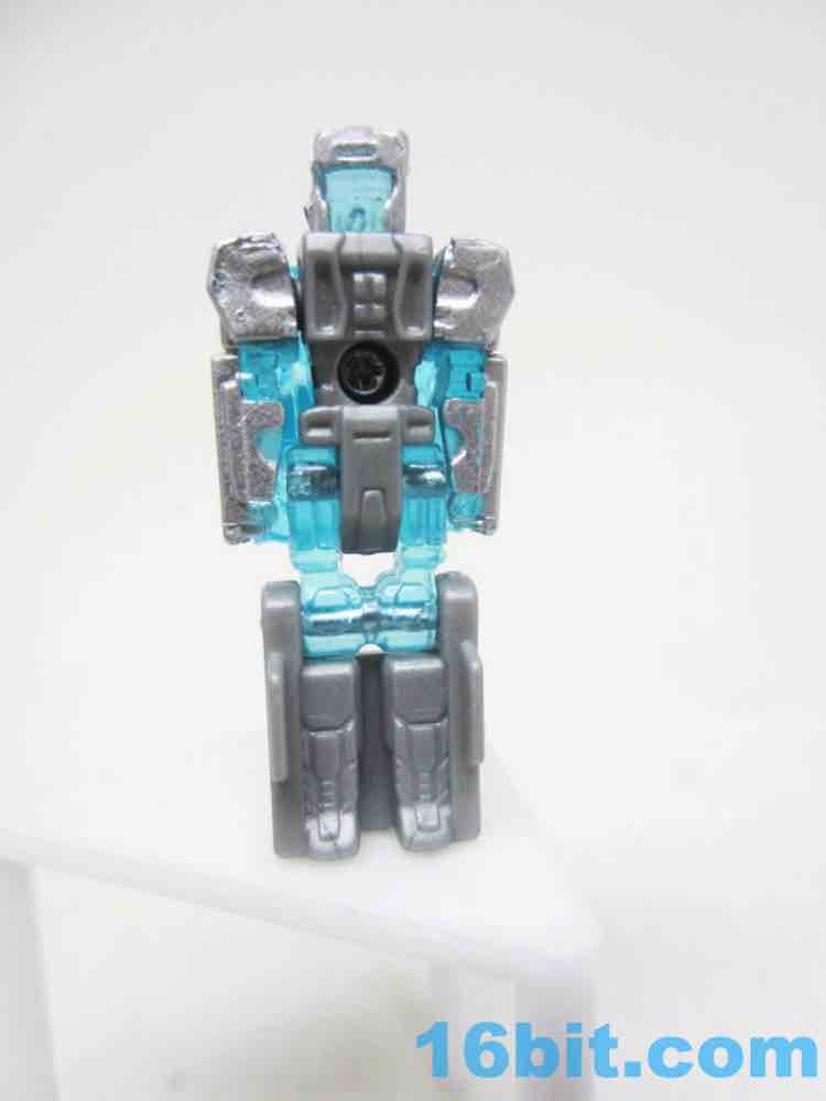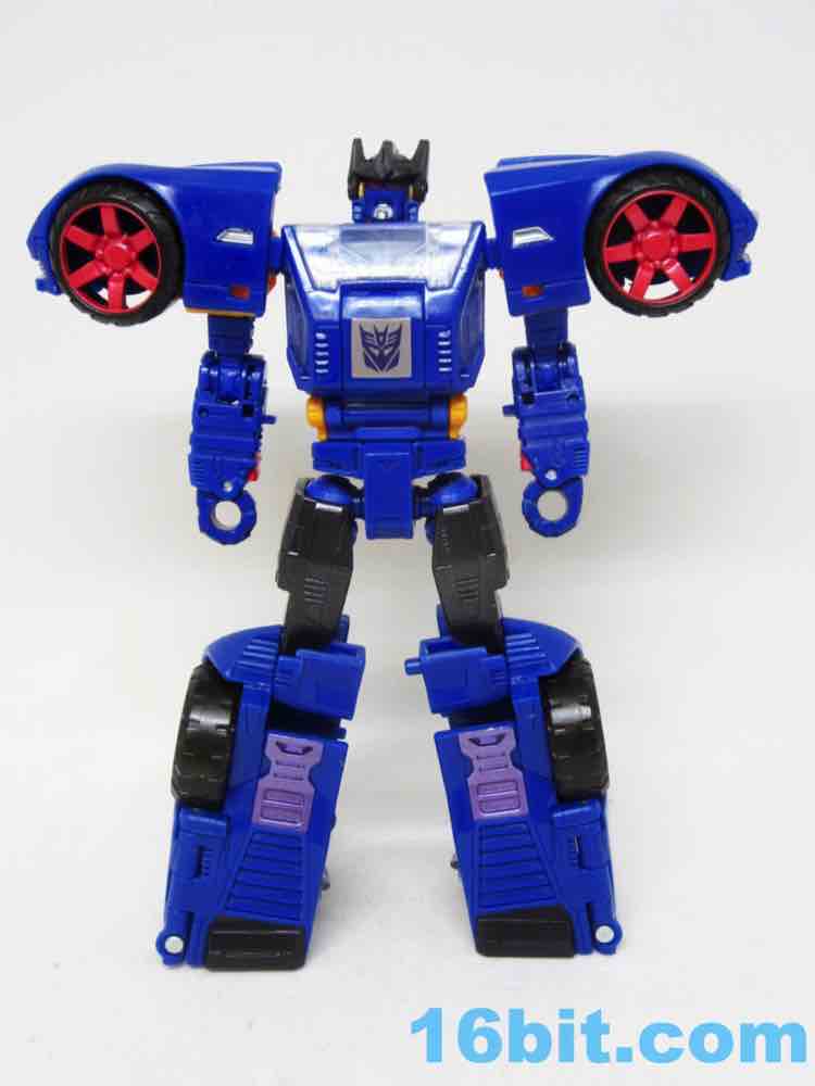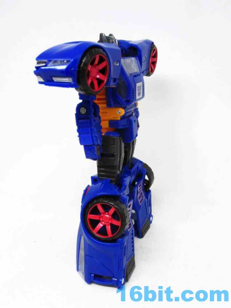 The car looks as good as or better than most of the other cars as of late. You get clear windows (minus the rear window), painted red wheels, and... admittedly, not much other deco outside the bumpers. The real car covers up some fake car kibble with a Decepticon symbol, giving you a fine blue car that's of not particular make or model. It's a delightful little car, but as always it doesn't do much. You'll find tiny pegs on the back for your Prime Masters and Titan Masters, plus a 5mm port on the roof for the Prime Armor fist or a gun or whatever. It's a car. What were you expecting?