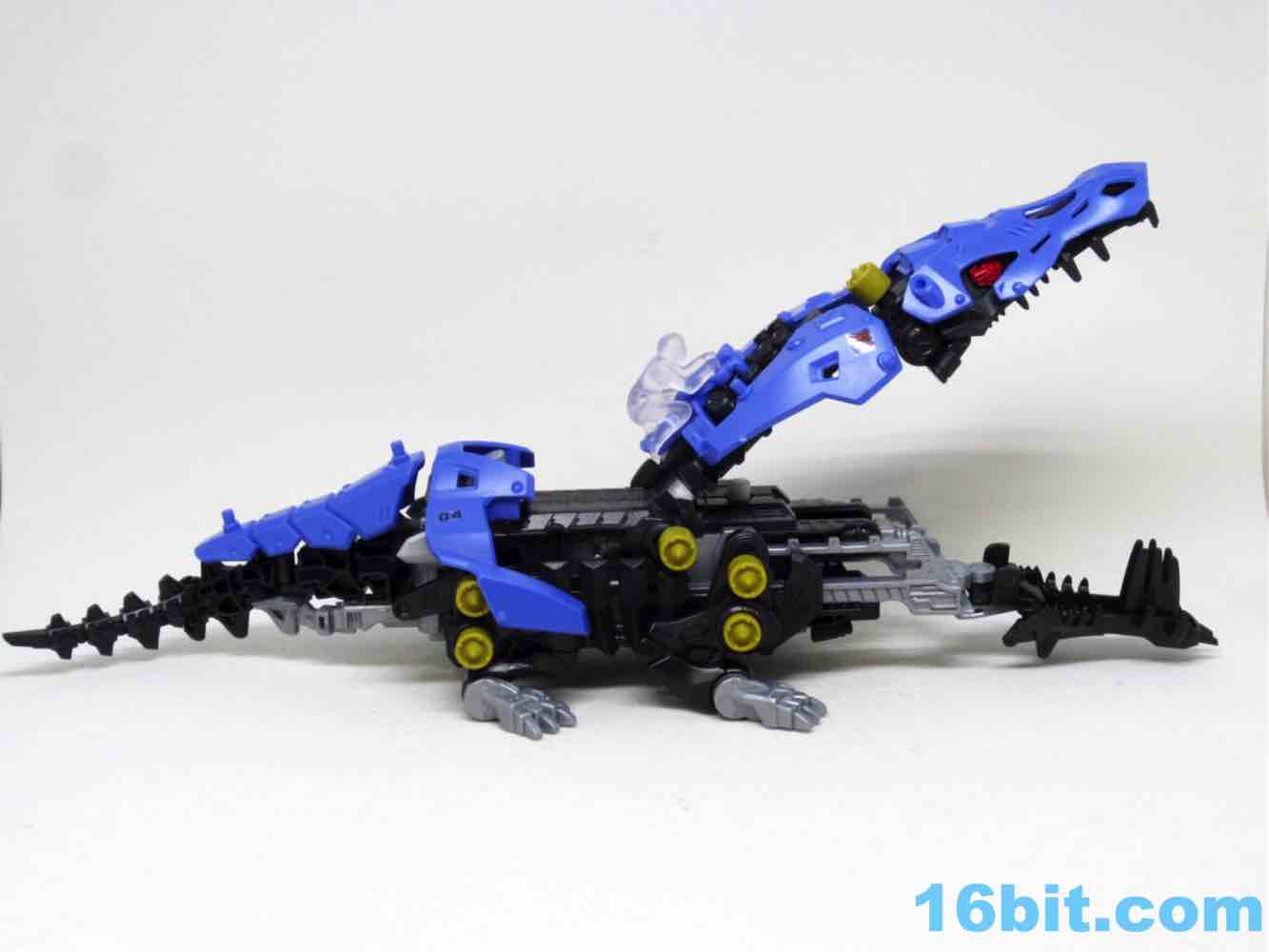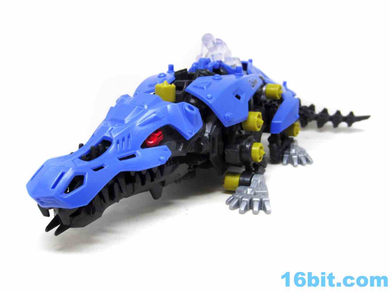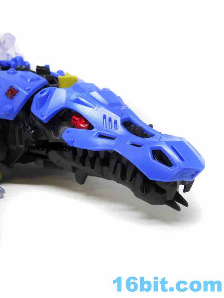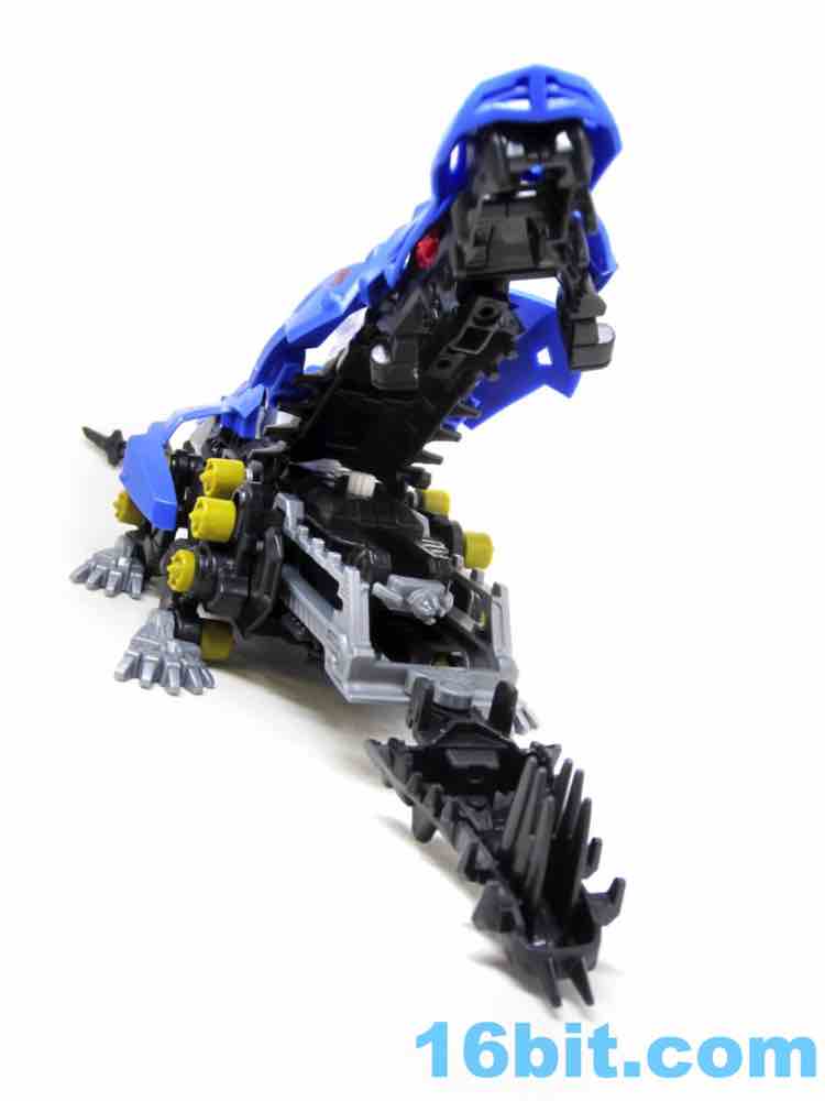 I like the overall design a lot, and it seems this was designed with crazy customization and expansion possibilities in mind. 3mm pegs and holes dot the surface of this reptilian robot, providing places to mount weapons if and when they release expansion kits (or if you steal them from old kits.) The feet are silver, and the bulk of the toy is fairly evenly colored. One feature I especially love are that the creature's blade-like teeth are so long, they jut through the top of the snout - that's a heck of a dental problem.