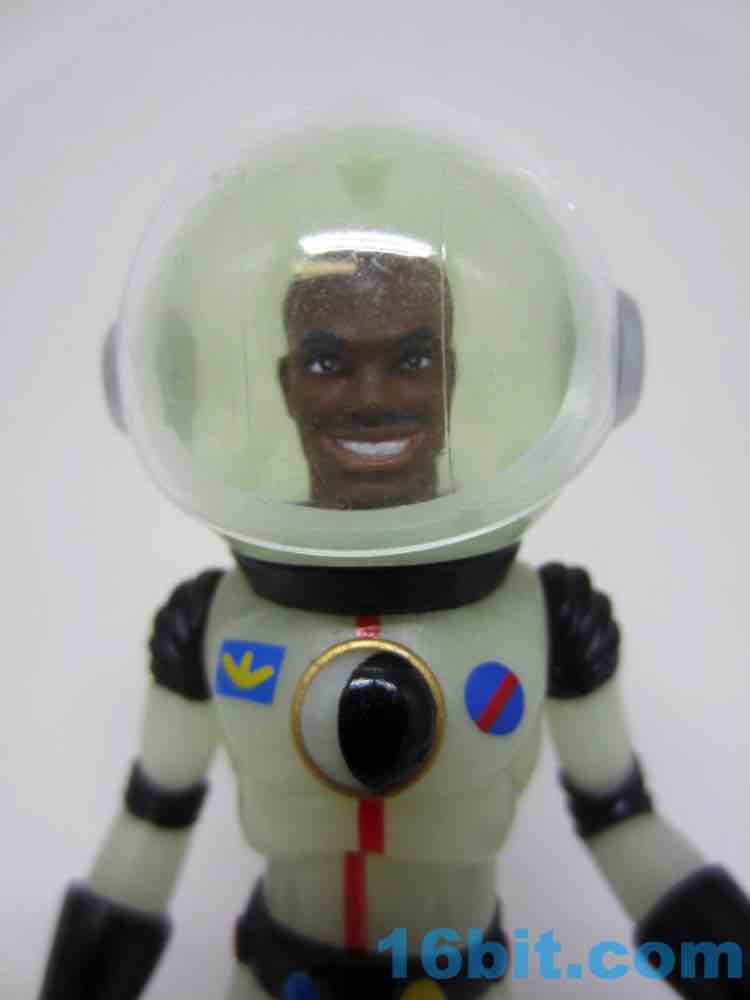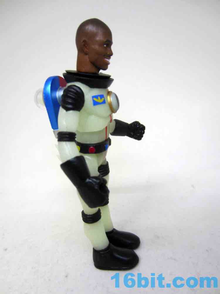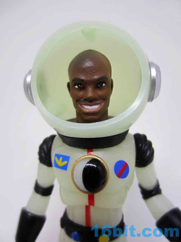 Our 4-inch hero stands tall with his removable helmet, complete with flip-up visor. It popped open as I removed the figure from his plastic prison, surprising me with a level of detail on the head I had not anticipated. The eyes are utterly perfect - bright, lively, and similar to the other humans (and Venusians) in this action figure line with some of the best detail I've ever seen at this scale. He has a big grin and painted teeth, painted lips, a mustache, dynamite eyebrows, and he is one of very few figures with a shaved head that shows painted detail of the remaining fuzz. There's a hint of black hair on his dome, with the head cast in white PVC. The rest of the figural parts are glow PVC.