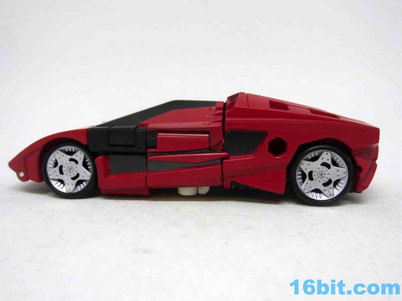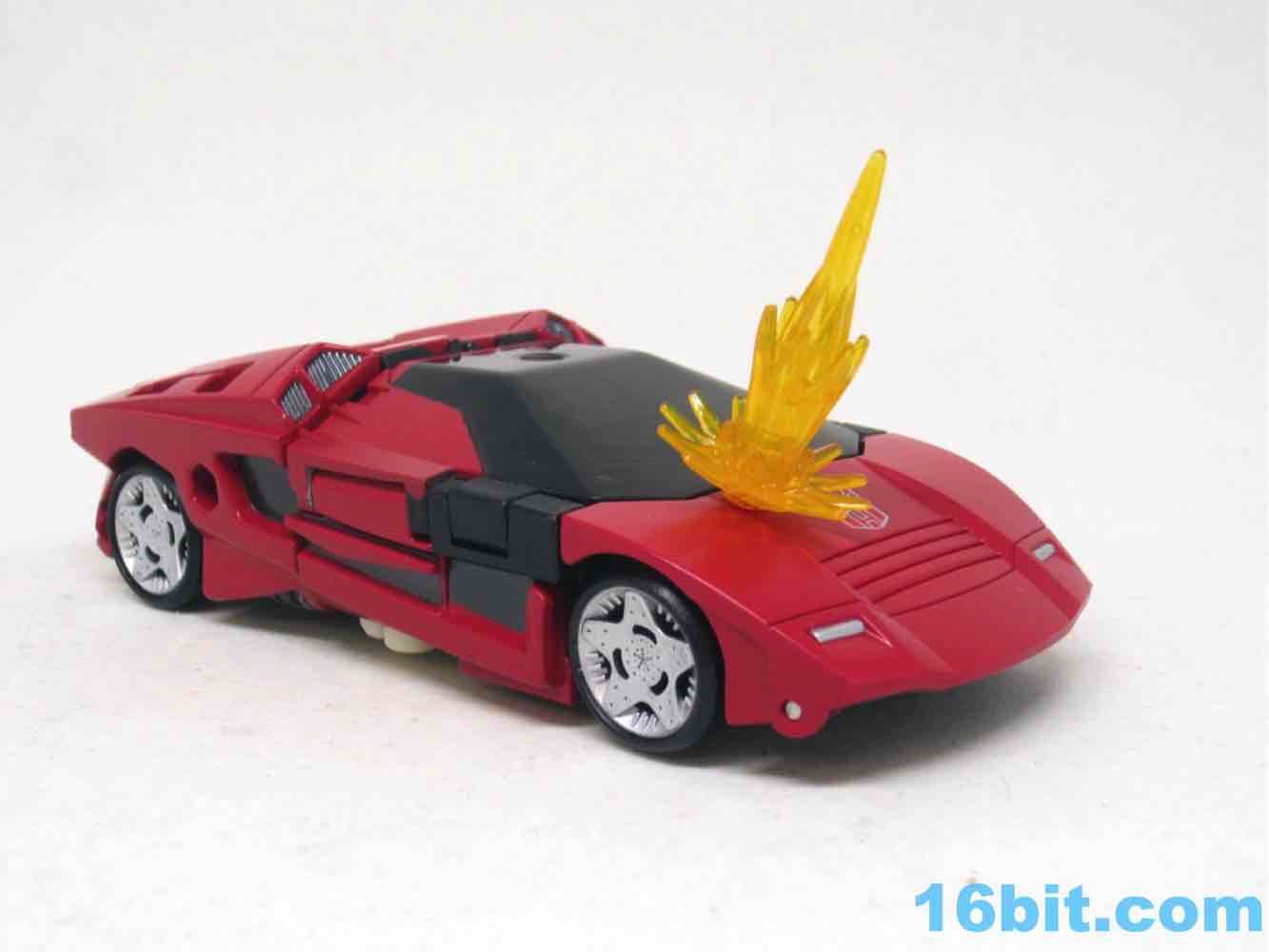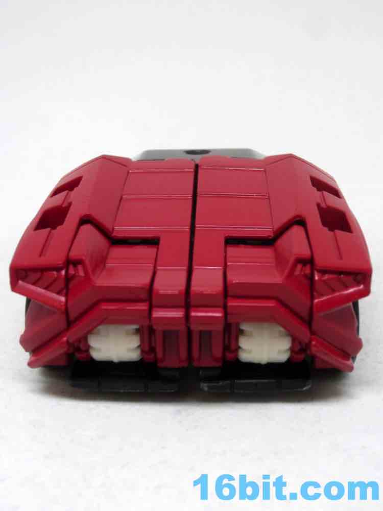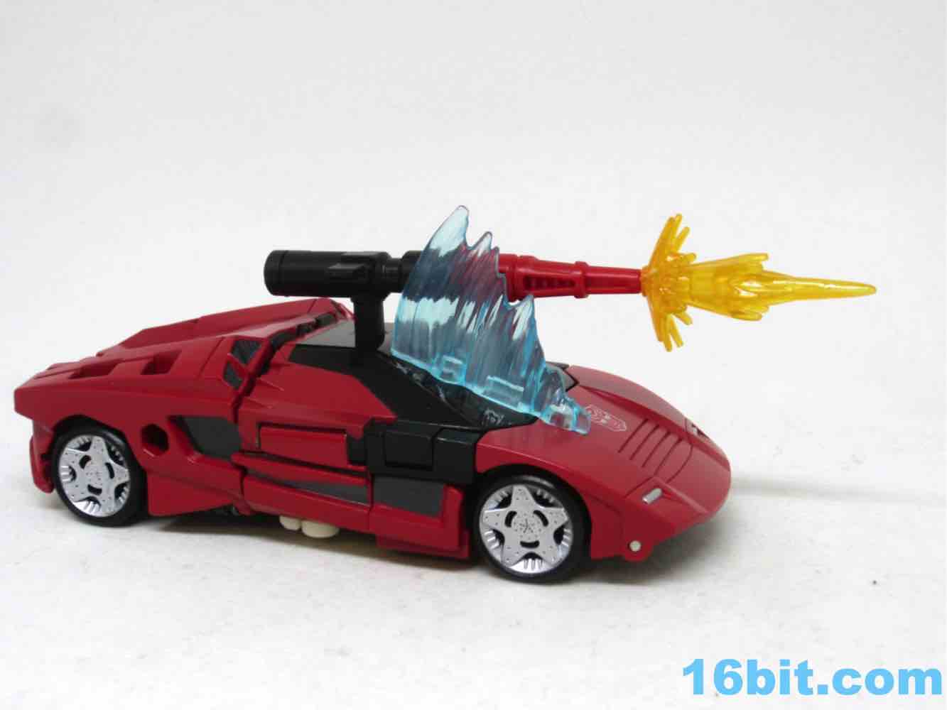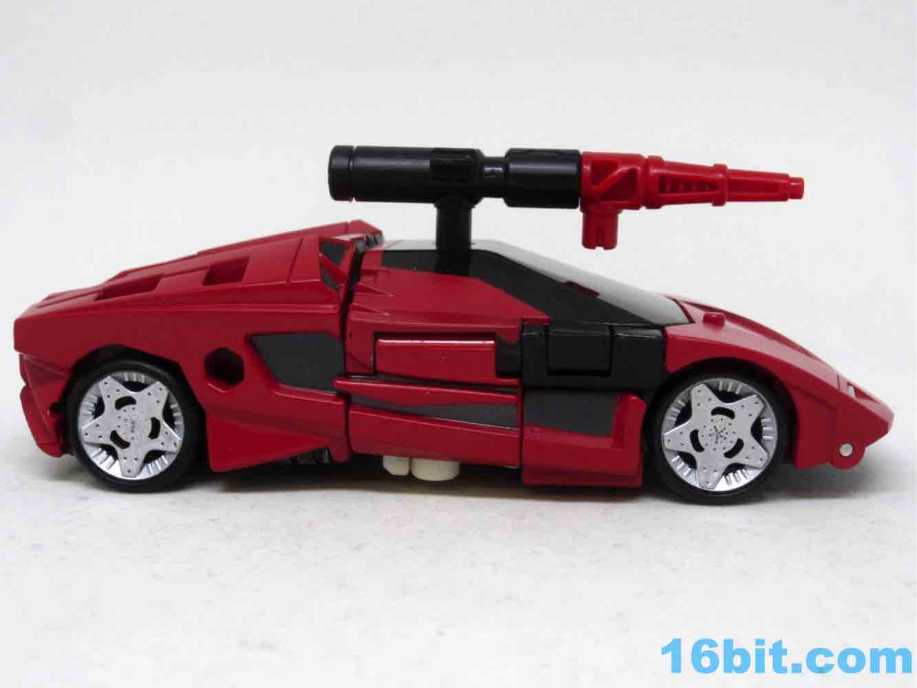 The former Lambo now turns into either a Cybertronian or off-model Earth car. Take your pick. It has an even red finish and painted hubcaps, a rarity. The windshield is clear, but has little technical lines in it for some reason - this gives it a slightly alien look. The roof has a 5mm hole for mounting the cannon, were you so inclined. It's a nice car - and it looks like it could easily be remolded into Hot Rod later. We already know that a Red Alert is in the works.