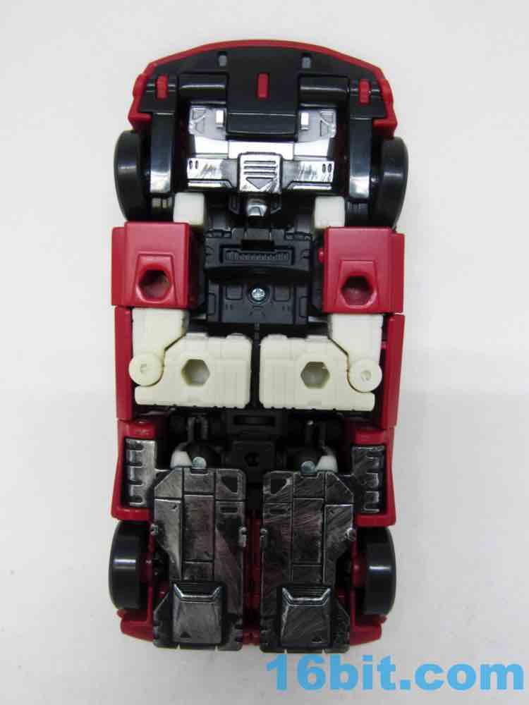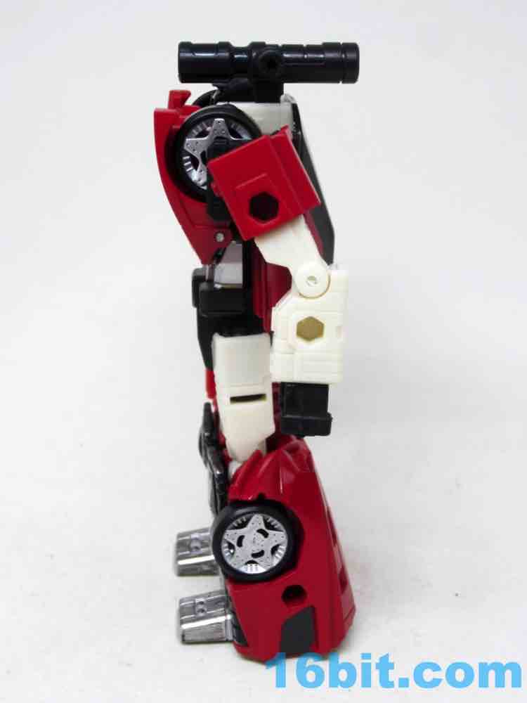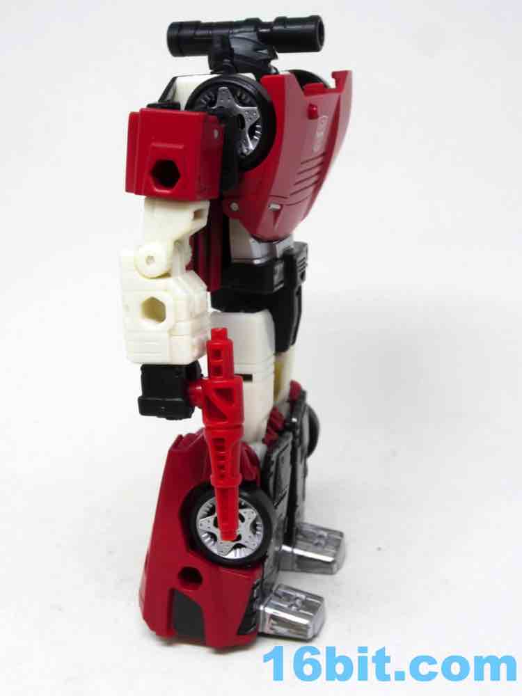 The 5-inch robot is kind of short for a deluxe, but he's fairly sturdy. The joints have a lot more in the way of moving parts and pins, and the sculpting is some of the best we've seen out of Hasbro/Takara-Tomy. I love the on-mode head. I dig that the robot mode looks like a good pastiche of most previous 1980s-style Sideswipe toys, animation models, and promotional artwork. He has about 18 meaningful points of articulation, which includes rocker ankles and a neck that can look up and down. Hasbro has clearly been taking notes from its action figure division, giving these figures slightly more friction in their joints and enhanced deco. I'd just as soon lose the battle damage - the silver scrapes on the black shins and codpiece look good, but they're strange places to show wear in battle. Only getting hit on your crotch and lower legs seems like you may not be cut out for battle.
