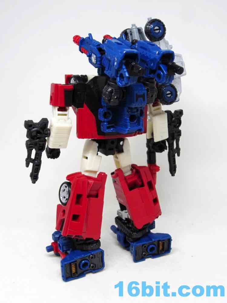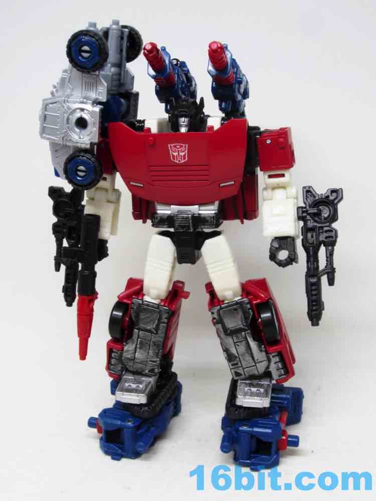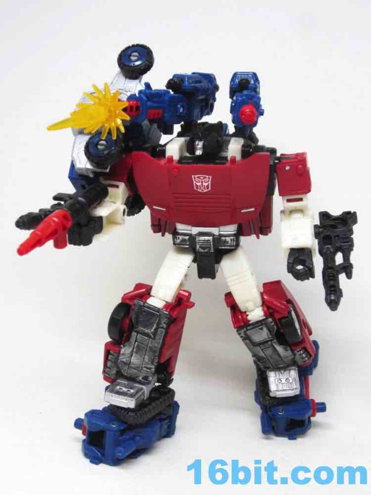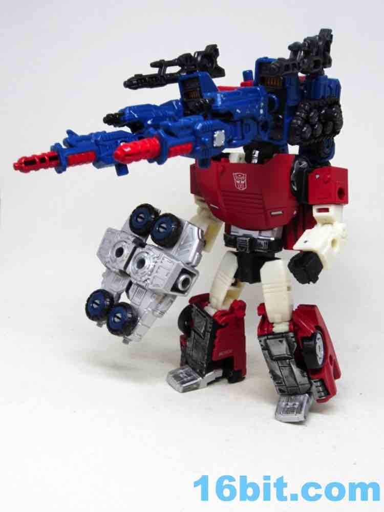 If that weren't enough, the figure's able to "bulk up" with Six-Gun, Brunt, or Cog figures sold separately. Each one can be dismembered to be weapons, backpacks, armor, and lifts for Deluxe or Voyager-class figures. It's a neat idea, and makes the relative nobodies into something fun and interesting - but a nobody like Cog plus a nobody like Sideswipe may not be enticing for everybody. It feels like some unlicensed toy fever dream, and it adds play value to a figure that's otherwise perfectly good but not exactly packed with action features. Even the original 1984 toy had working launchers. This one's claim to fame for weapons is a 3mm tip on the red blaster's barrel - you can mount another blast effect there if you like.
