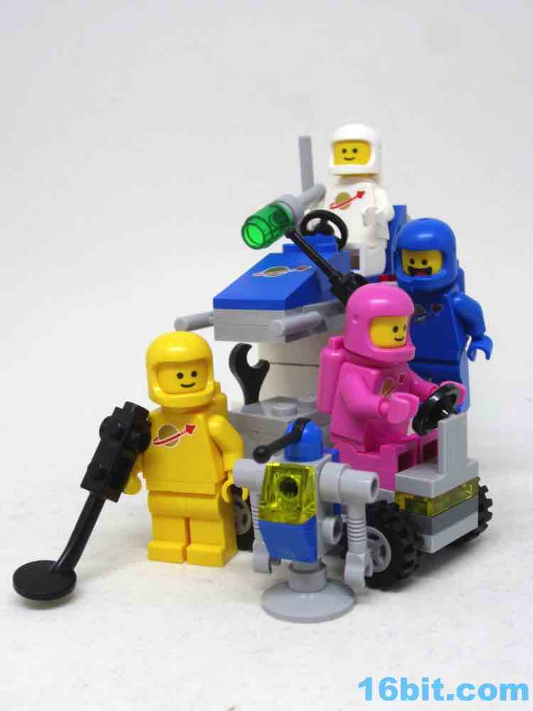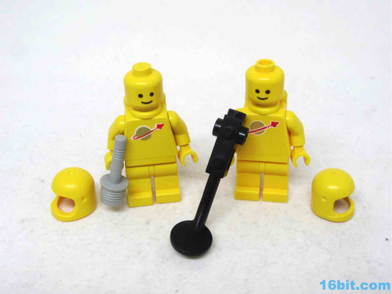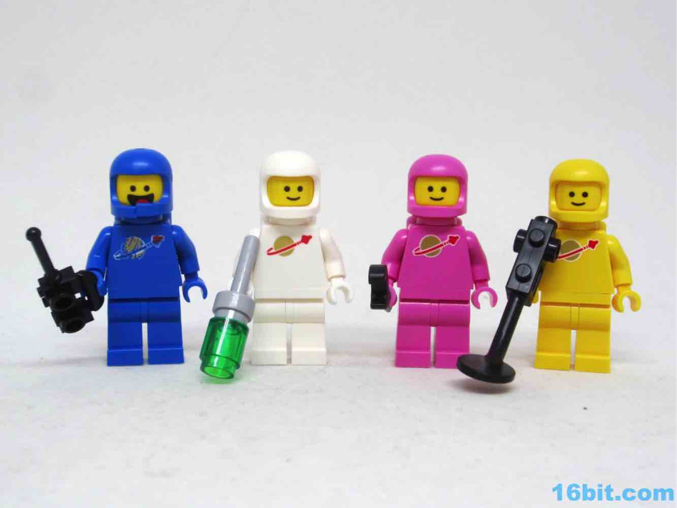 If you had these as a kid, you're no doubt looking for differences in the figures. Each astronaut is a little bit different than the old ones. The old helmets had some slightly different looks, with most of my vintage ones being more or less aligned in the brow and the chin department. These new ones have a bit of an underbite, although not as large as the modified visor-era helmets you'd get with Futron, Blacktron, and so forth. There's also a tiny indentation on the tops of these new helmets, so a side-by-side comparison with an original lets you know that these new ones are imposters, and not Crater Plate contemporaries. The figure heads have indentations - they're not filled in like the studs on the originals - but the faces and chest logos are pretty close to the originals for Kenny, Jenny, and Lenny. In a display, the only one that would stand out as not being an original (from a reasonable distance) is the pink Lenny. The others are dang close replicas.