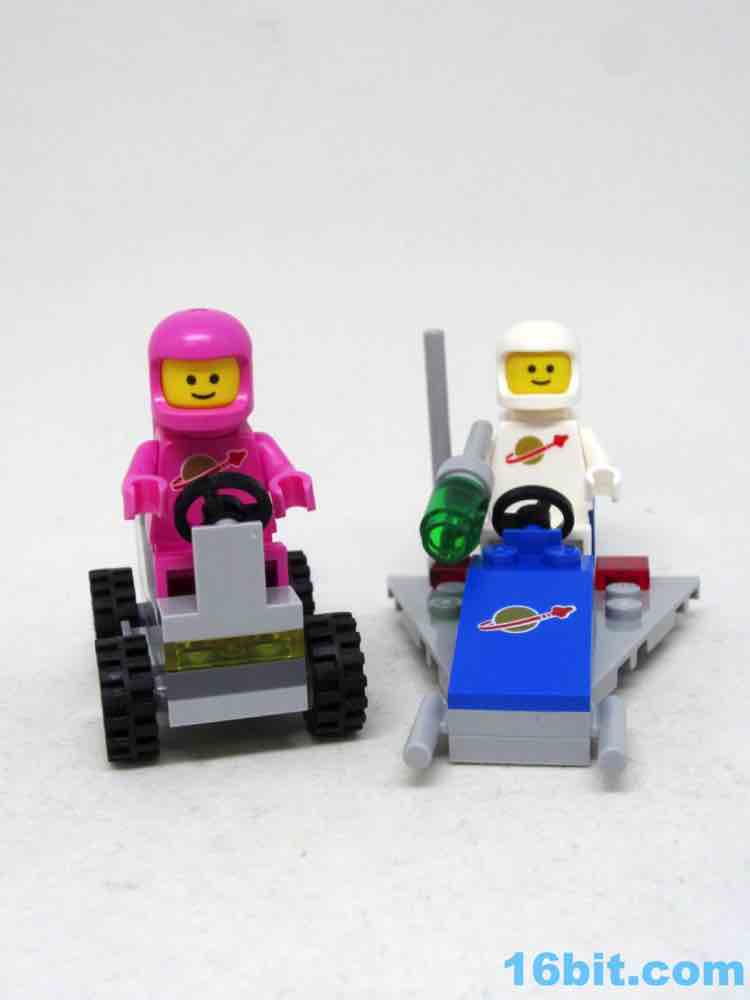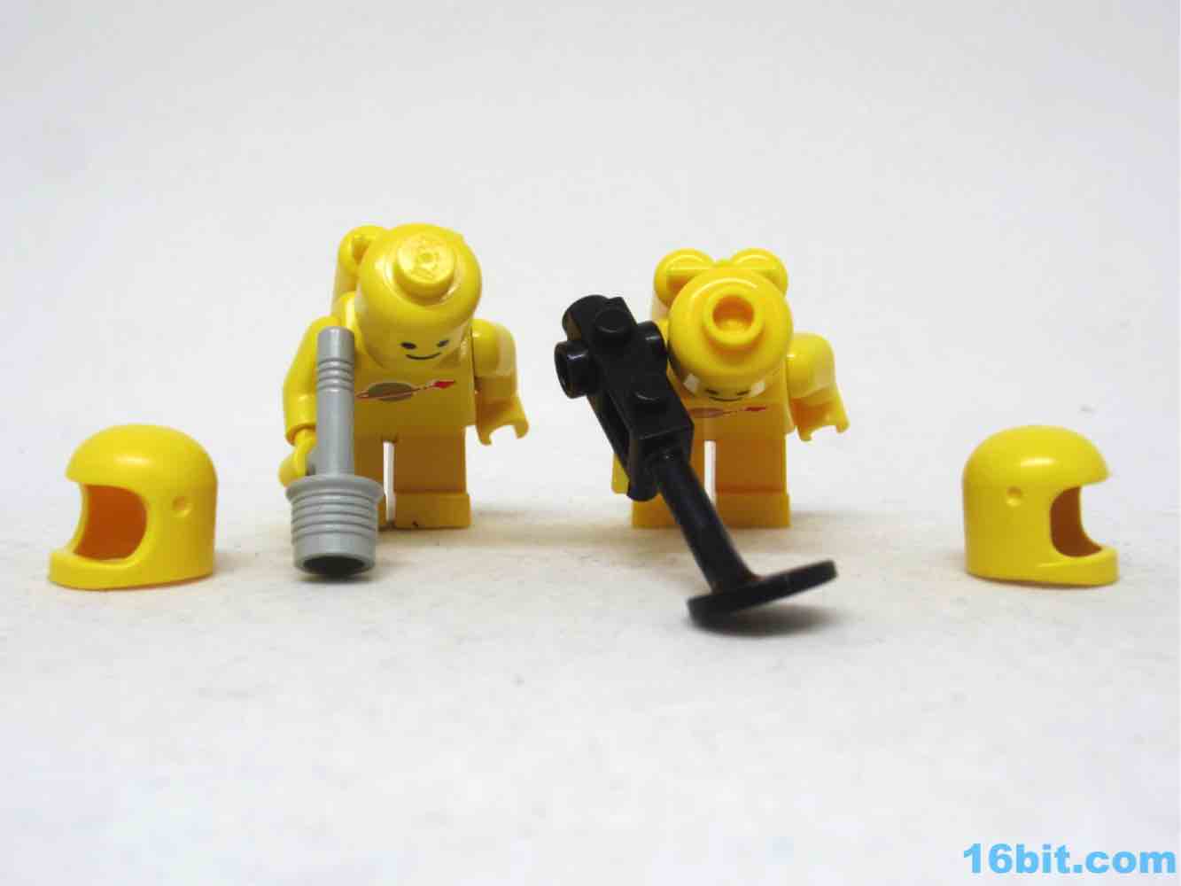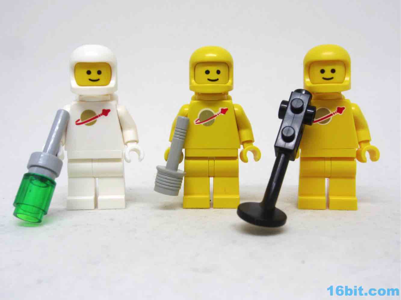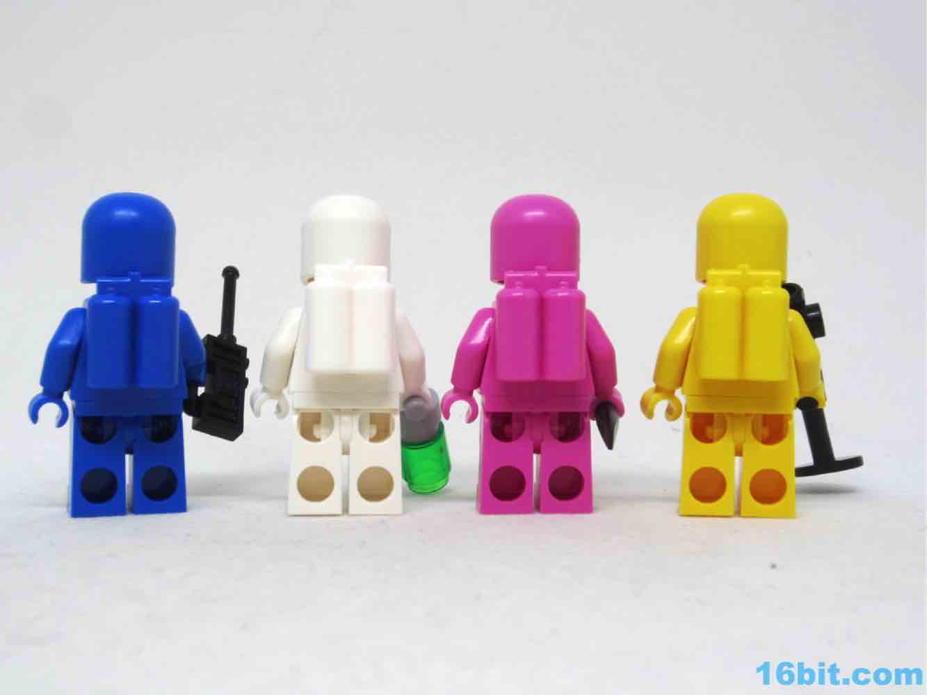 If you had these as a kid, you're no doubt looking for differences in the figures. Each astronaut is a little bit different than the old ones. The old helmets had some slightly different looks, with most of my vintage ones being more or less aligned in the brow and the chin department. These new ones have a bit of an underbite, although not as large as the modified visor-era helmets you'd get with Futron, Blacktron, and so forth. There's also a tiny indentation on the tops of these new helmets, so a side-by-side comparison with an original lets you know that these new ones are imposters, and not Crater Plate contemporaries. The figure heads have indentations - they're not filled in like the studs on the originals - but the faces and chest logos are pretty close to the originals for Kenny, Jenny, and Lenny. In a display, the only one that would stand out as not being an original (from a reasonable distance) is the pink Lenny. The others are dang close replicas.