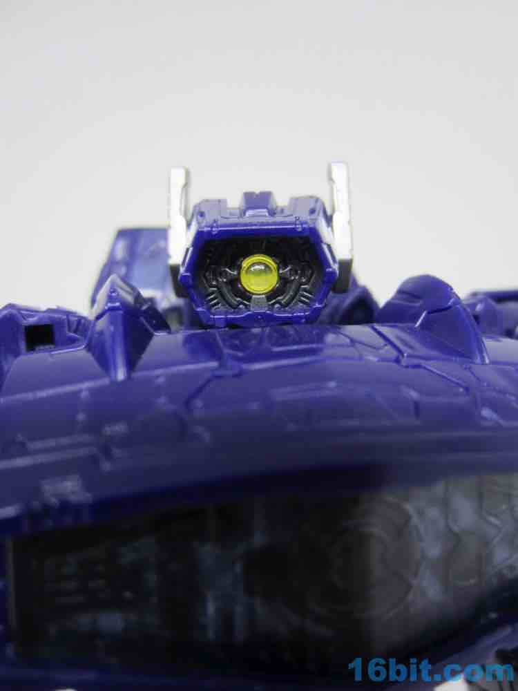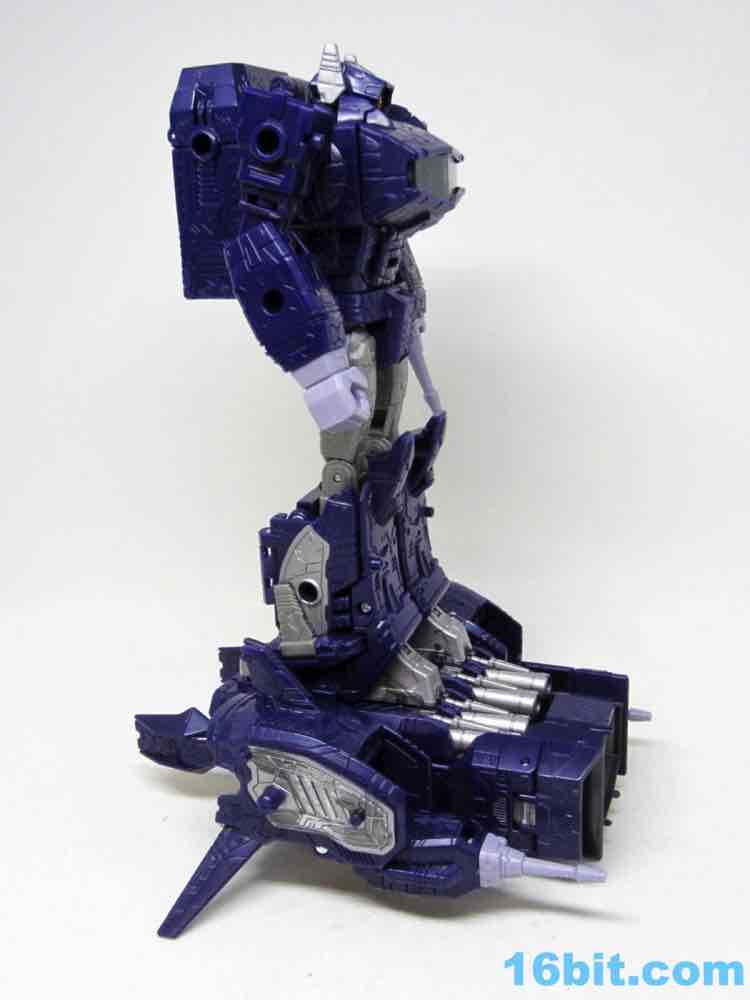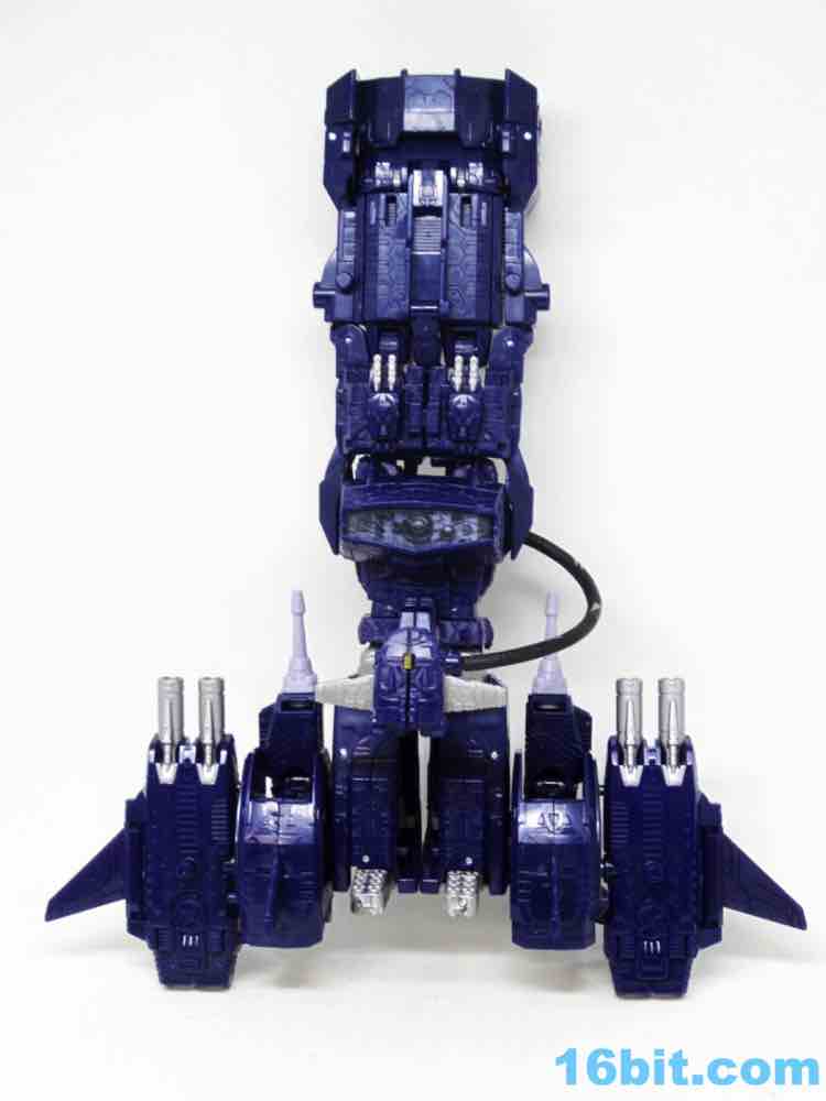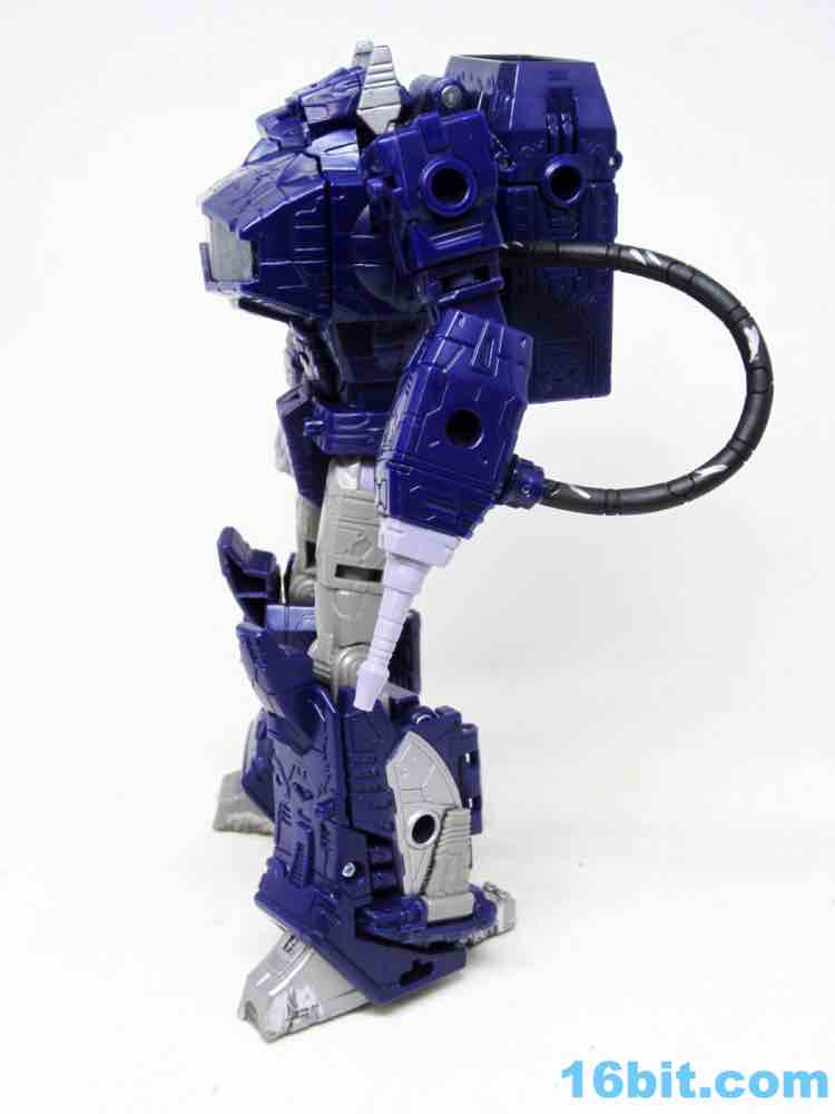The inner Voyager-sized robot is perfect to menace Megatron. The light-up eyeport works better than any I've seen in ages, with a tiny clear window on the back of the head lighting up the unusually dark purple plastic perfectly. It's really wonderful, and the toy's articulation is some of the best we've seen on a non-Masterpiece Shockwave toy. The cyclops head is good, the Decepticon symbols are nice, and there are tons of places to plug in the power-up gear. Fans of Centurions Power Xtreme toy line will no doubt appreciate how Siege has power-ups of their own.