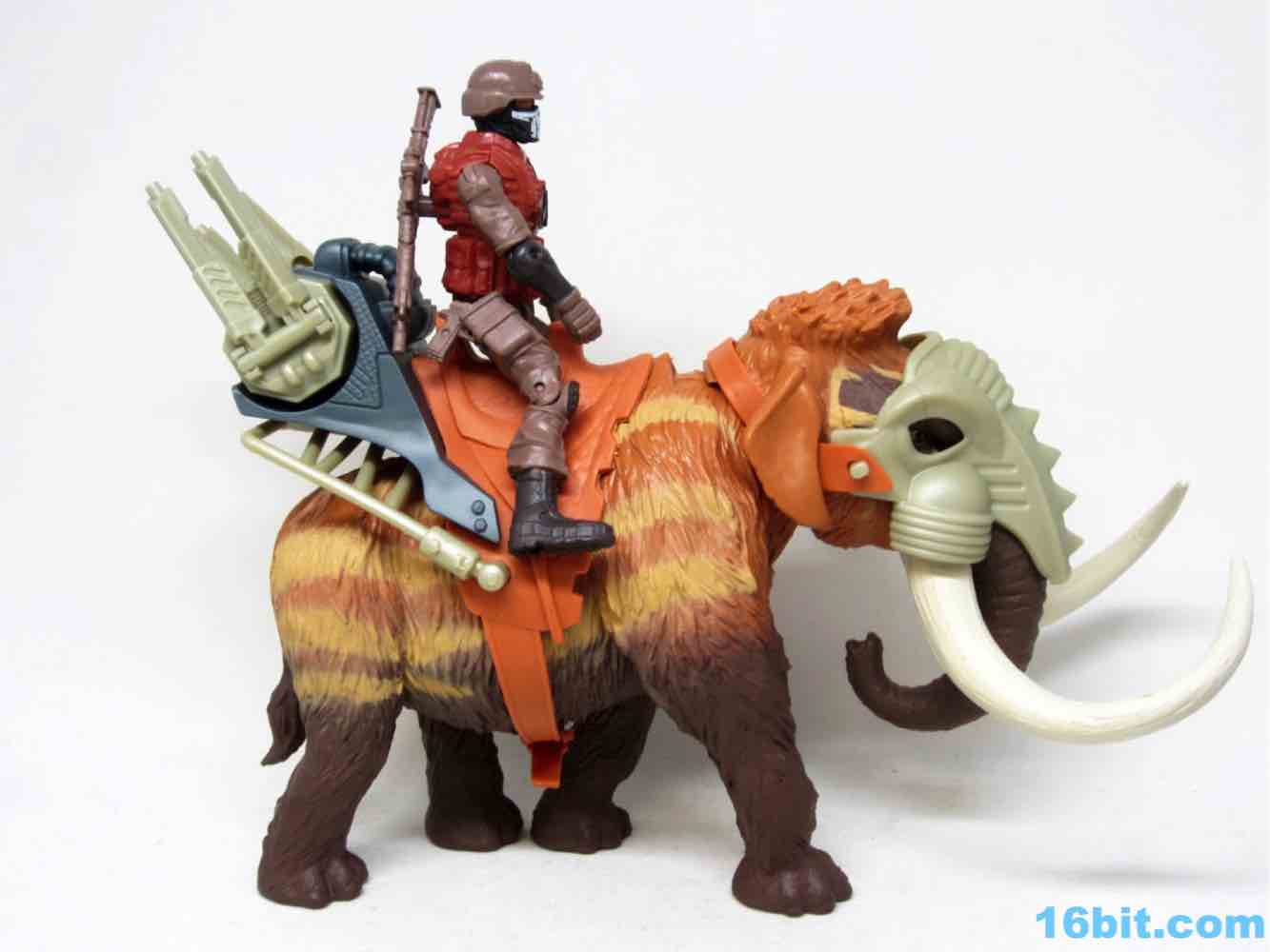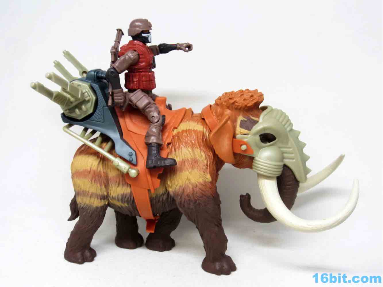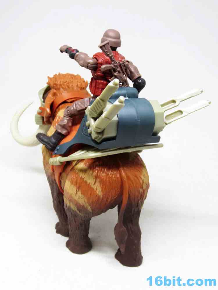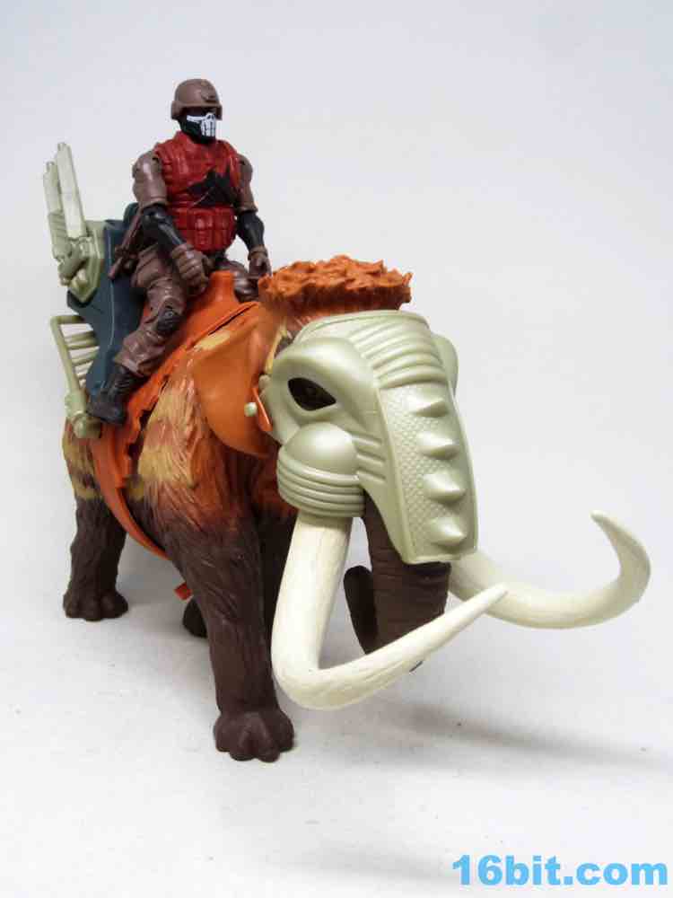 The figure is pretty neat - a skull-masked Shrapnel figure has a surprising range of articulation. It's also been sold several times before, so you might have it. You get 14 pretty great points of articulation, with a range of motion similar to the 1980s 3 3/4-inch G.I. Joe line. Maybe it's closer tot he 2002 relaunch - there's no O-ring, but you do get ball-jointed hips. It straddles the saddle nicely, but not perfectly - also there's nowhere for his hands to go. However, he has a rifle that plugs in his back and a pistol that fits in a holster, and I think that's just superb. Everything basically works together nicely, and why I need an evil military villain riding an extinct elephant I'll never know. But I like it.