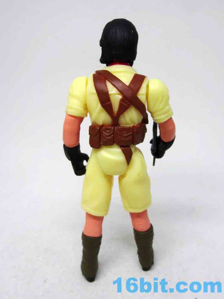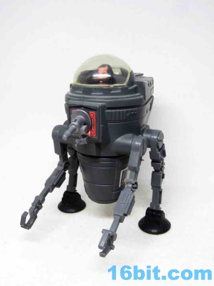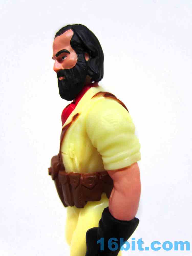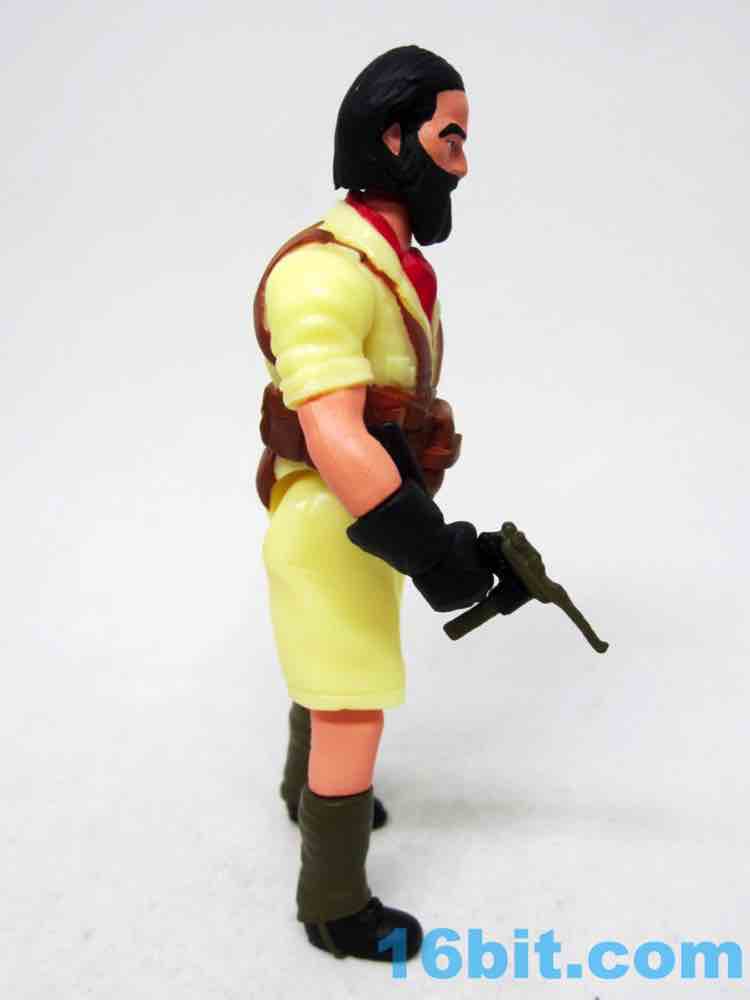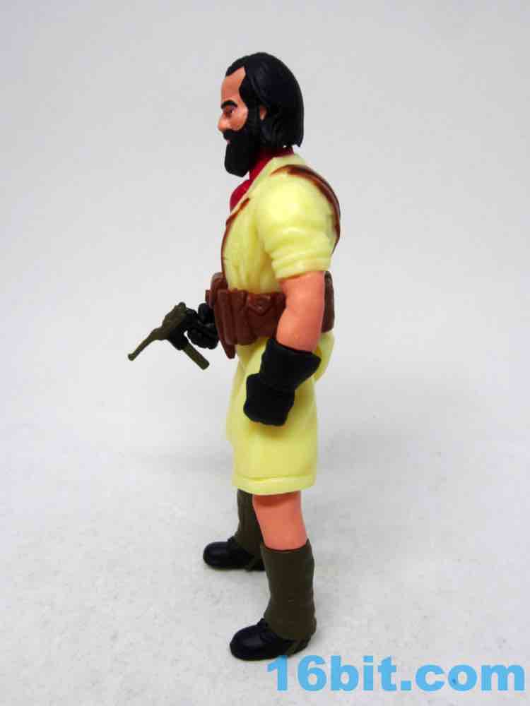 Desert Rat's articulation is really nicely done. I don't mean "he has a ton of joints!" - which he does. The rat has 10 points of articulation, which makes him merely pretty good in the world of Glyos where the debut figure Pheyden has 12 joints. What Desert Rat does well that a number of other action figures won't is sit, stand, and fit in a number of vehicles. The legs don't bend to that perfect 90-degree angle we got on most old Kenner figures, but it's close enough where he's sitting in my Droids Side Gunner without a fuss. The arms are posed tighter toward the body, so he can fit in a lot more of the random vehicles I tested - and I find this to be a bonus on any toy. As of now there are no 3 3/4-inch scale Glyos-specific vehicles, but at least he's at home in and around a lot of old Kenner toys. Also - and this is a weird thing to notice - a lot of the new 3 3/4-inch figures from smaller companies have weird, squared-off butts when the figures sit. (Early ReAction figures are a prime example.) Desert Rat doesn't look like he's smuggling a brick in his butt when he sits, and that's a sign of good design.