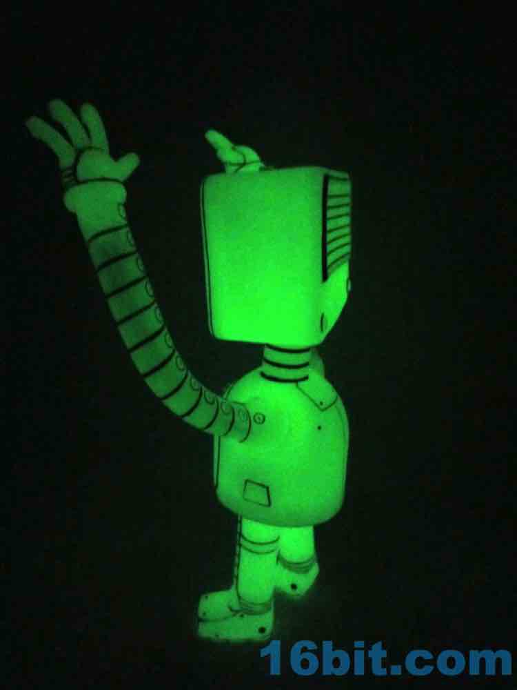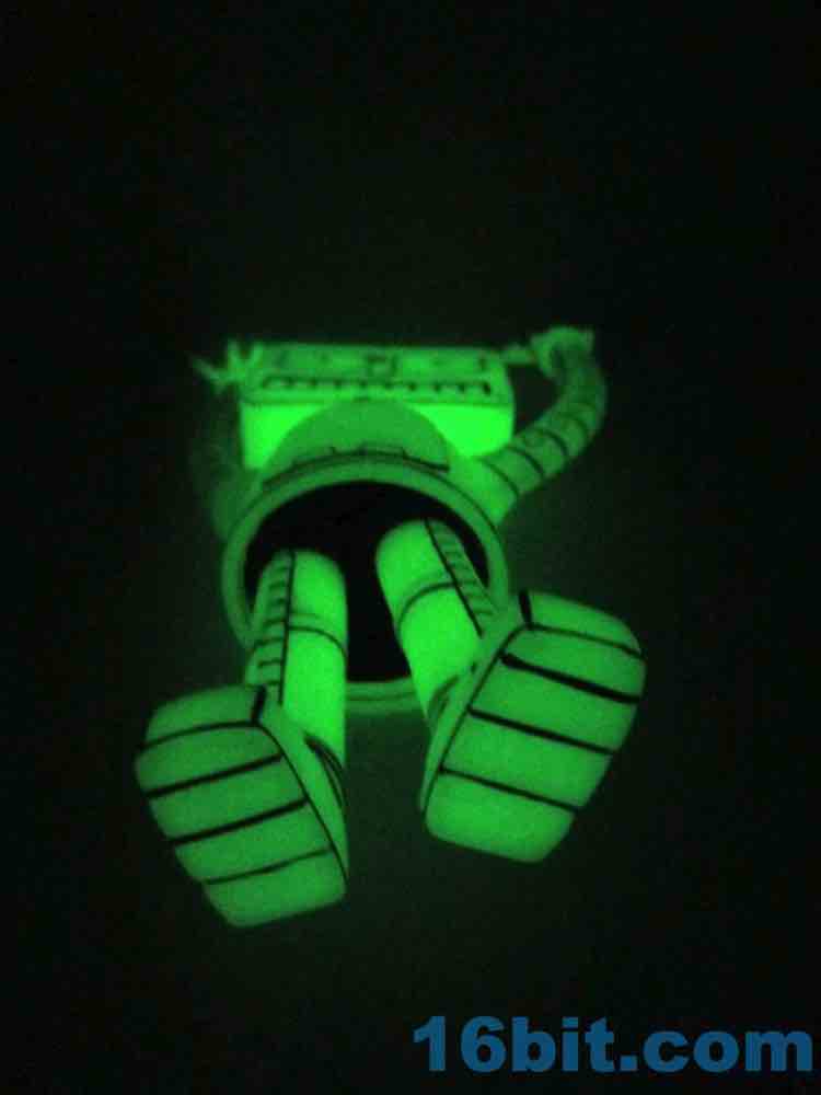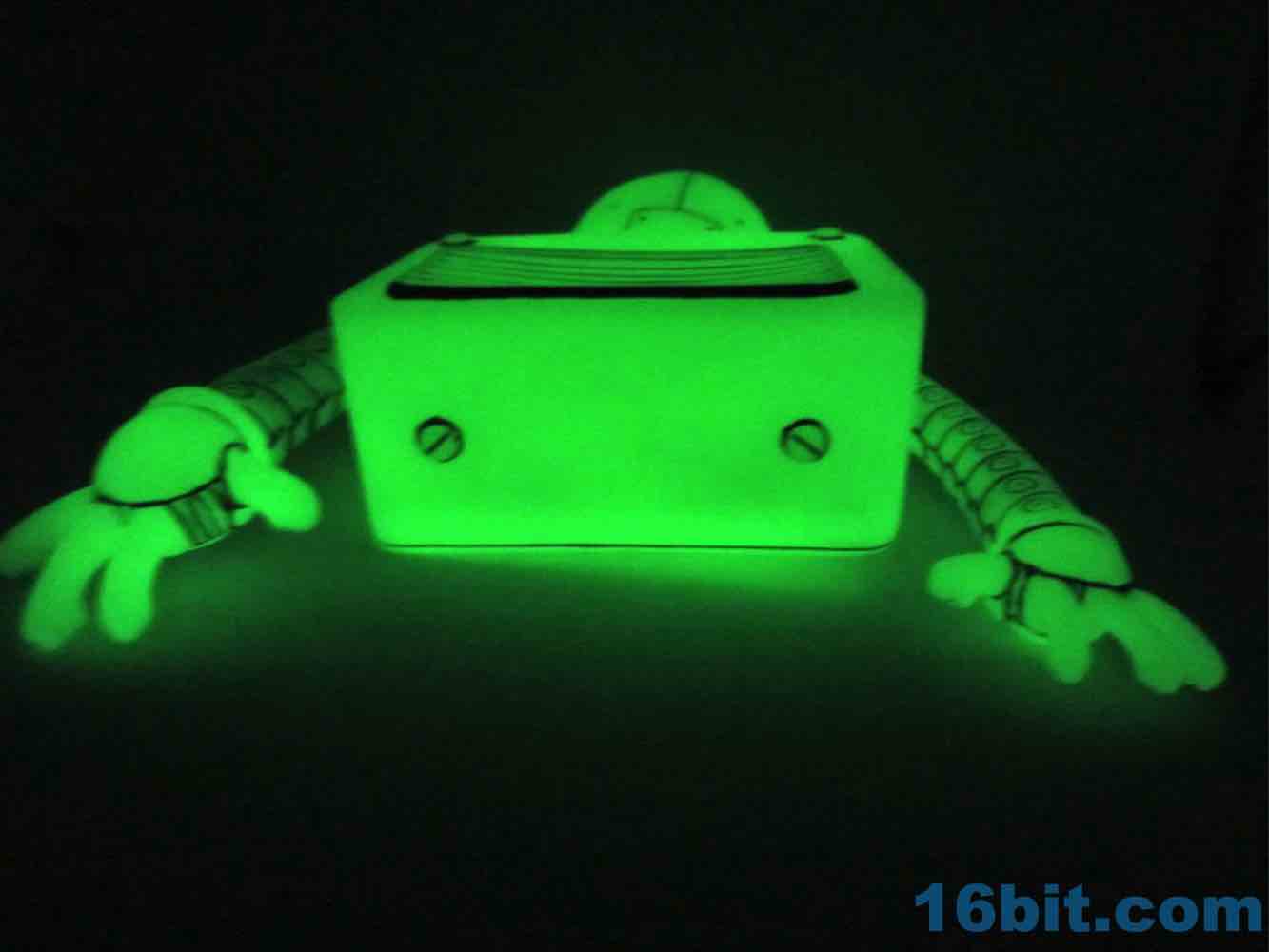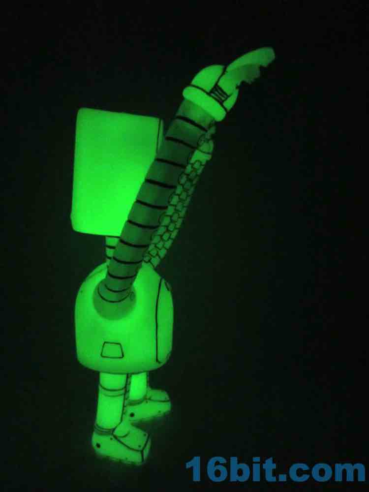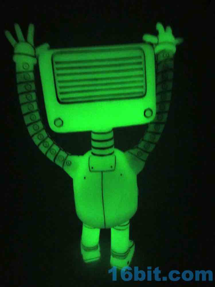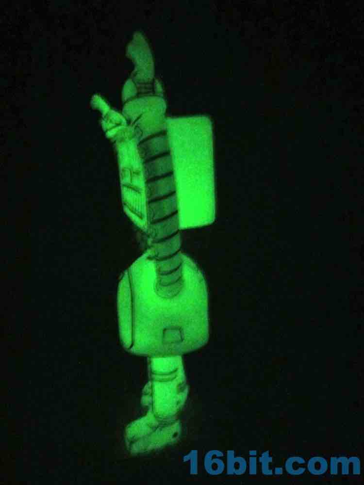 For the last few years, I make a trip to Brooklyn during New York Toy Fair. It's weirdly quiet at night - the streets are usually pretty empty and it's cold. I hop in a number of record stores, including PopFuzz - a toy shop with video games, toys, DVDs, records, and things I wish to see. They worked with ThreeZero to make a mascot toy, and this year I bought their Glow in the Dark The Robot. I saw the silver one in previous years and thought it was pretty neat - but I'm trying to cut down on extraneous purchases. Because it glowed, the 8-inch vinyl toy seemed like a viable purchase.