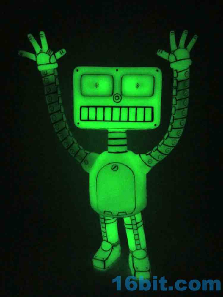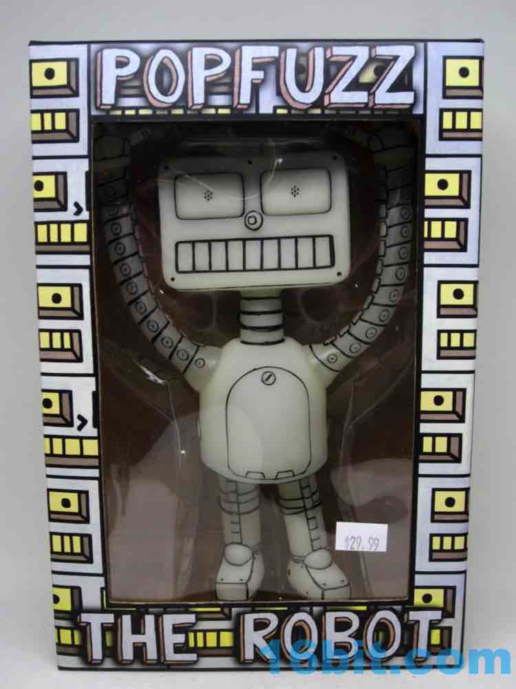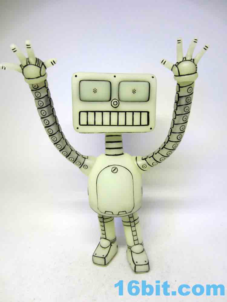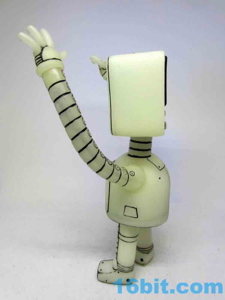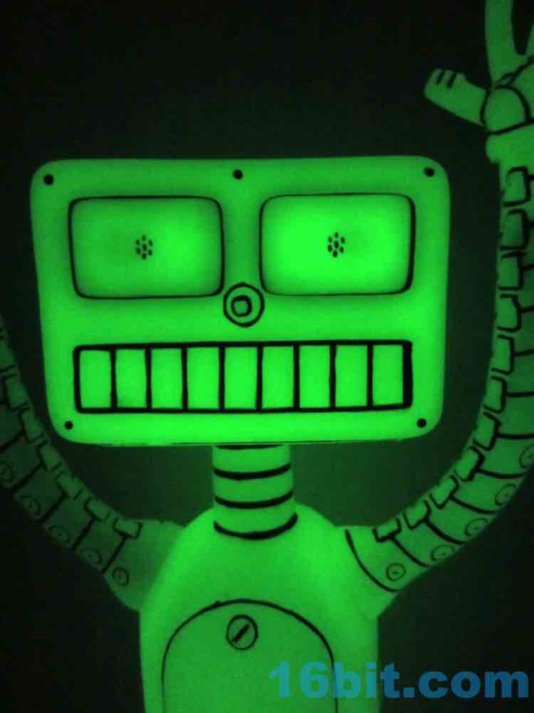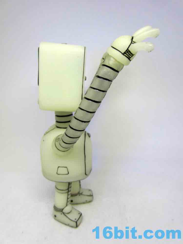 For the last few years, I make a trip to Brooklyn during New York Toy Fair. It's weirdly quiet at night - the streets are usually pretty empty and it's cold. I hop in a number of record stores, including PopFuzz - a toy shop with video games, toys, DVDs, records, and things I wish to see. They worked with ThreeZero to make a mascot toy, and this year I bought their Glow in the Dark The Robot. I saw the silver one in previous years and thought it was pretty neat - but I'm trying to cut down on extraneous purchases. Because it glowed, the 8-inch vinyl toy seemed like a viable purchase.