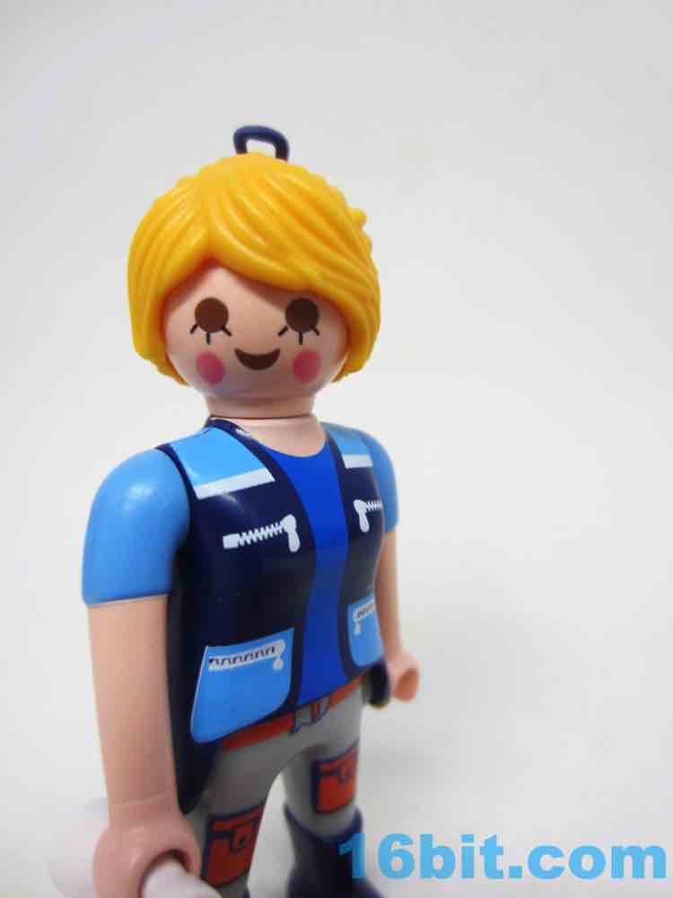 Your human figure is a blonde girl with rosy cheeks and a blue jacket. Her cargo pants have preposterously great orange pockets with blue boots. While there are painted details, it's worth noting Playmobil are brilliant at dual-color injection molding. The boots and pants are two different colors of plastic. The eyes are molded brown and are not painted. This is part of the reason these guys hold up so well - common paint scrapes can't happen if there's no paint to scrape.