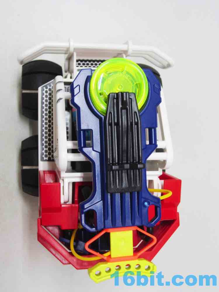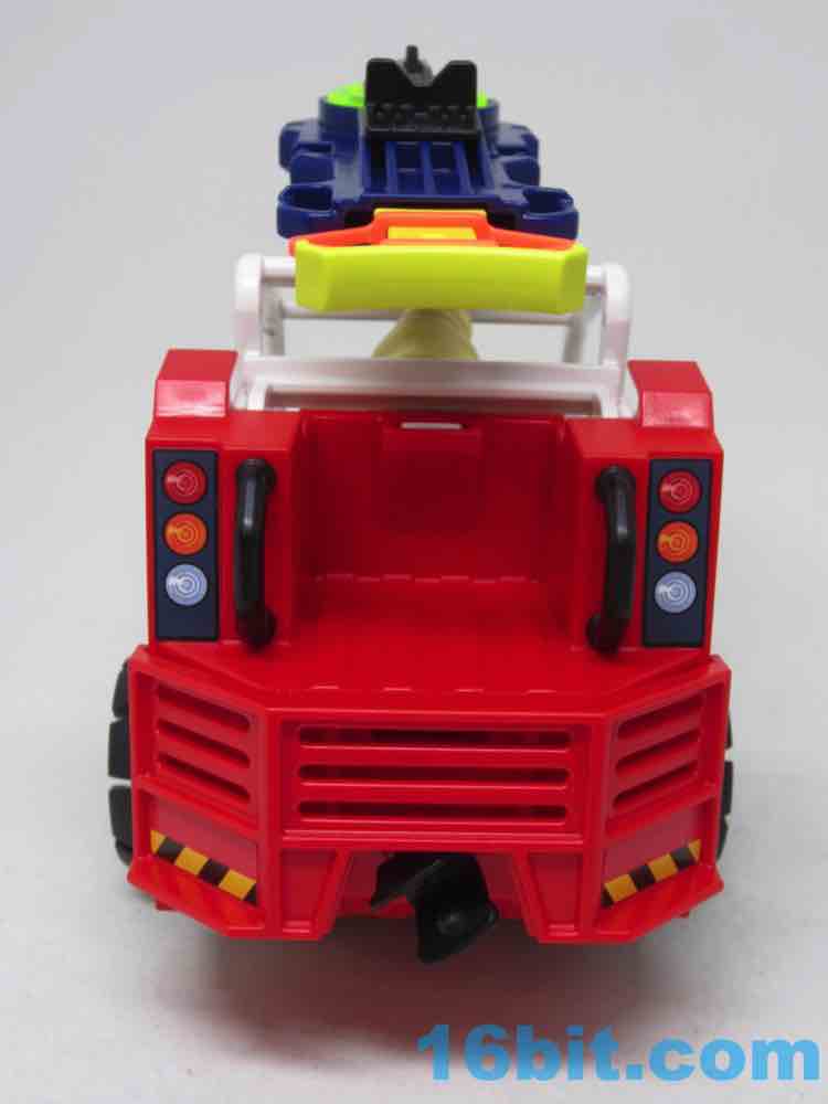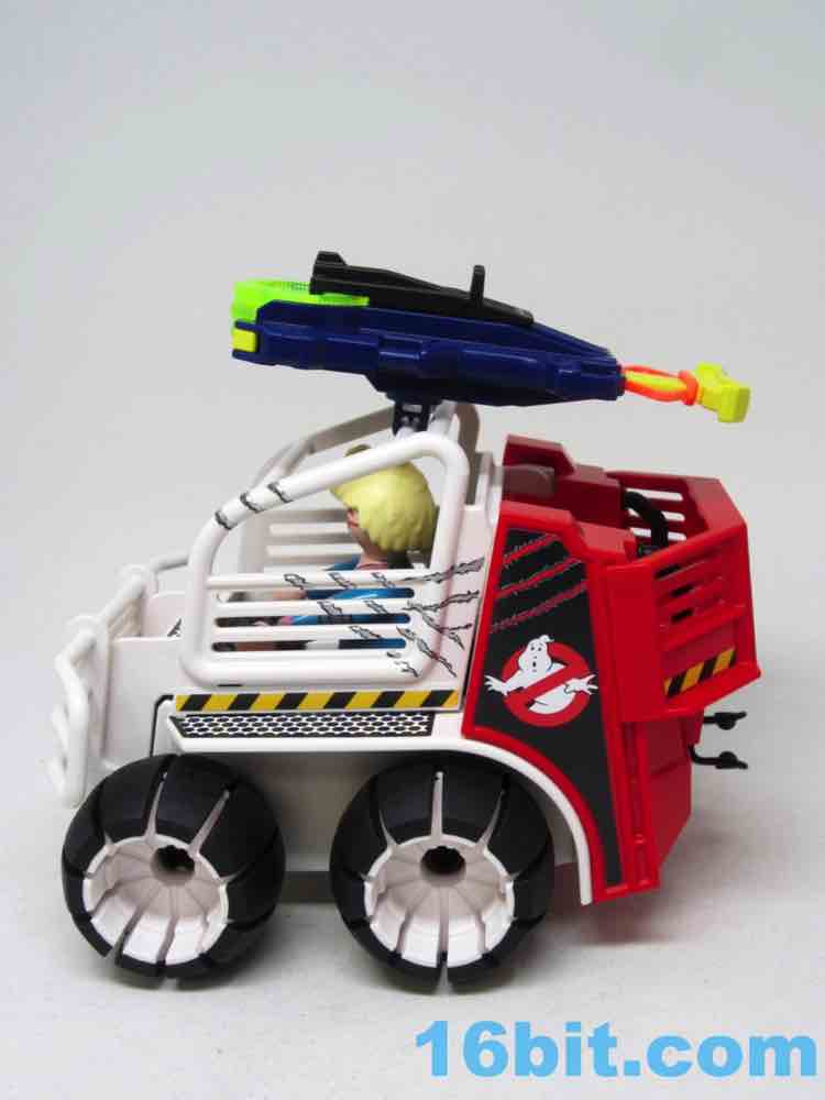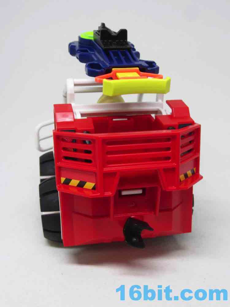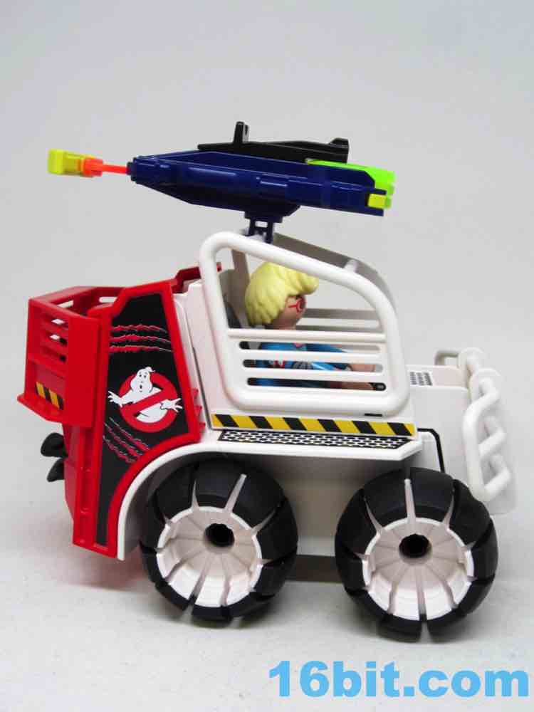 The Cage Car is a vehicle from the Dino sub-line, refitted with a disc launcher and colored in Ecto-1 colors. It works! Check out those cool texture visuals on the stickers. Admire the no ghost logos all over the dang place. Fear the giant tires that seem ideally suited to roll over craters on the moon. Also don't deny the nifty storage unit in red on the back - that gate can be lifted up and down to get your stuff in there. I was particularly pleased to see all of these vehicles exhibit pre-painted signs of supernatural damage. In this case, the claws from the ghost slashed the left-hand side of the driver's cage, with some excellent silver outlined in grey to give it a damaged appearance. While the set isn't cheap, it does feel like it's worth the asking price thanks to the license and the considerable heft of the vehicle with its above-average compliment of deco and gear.