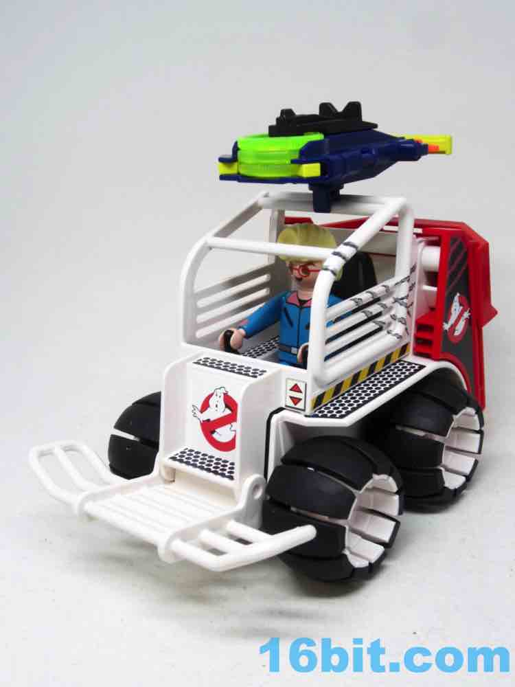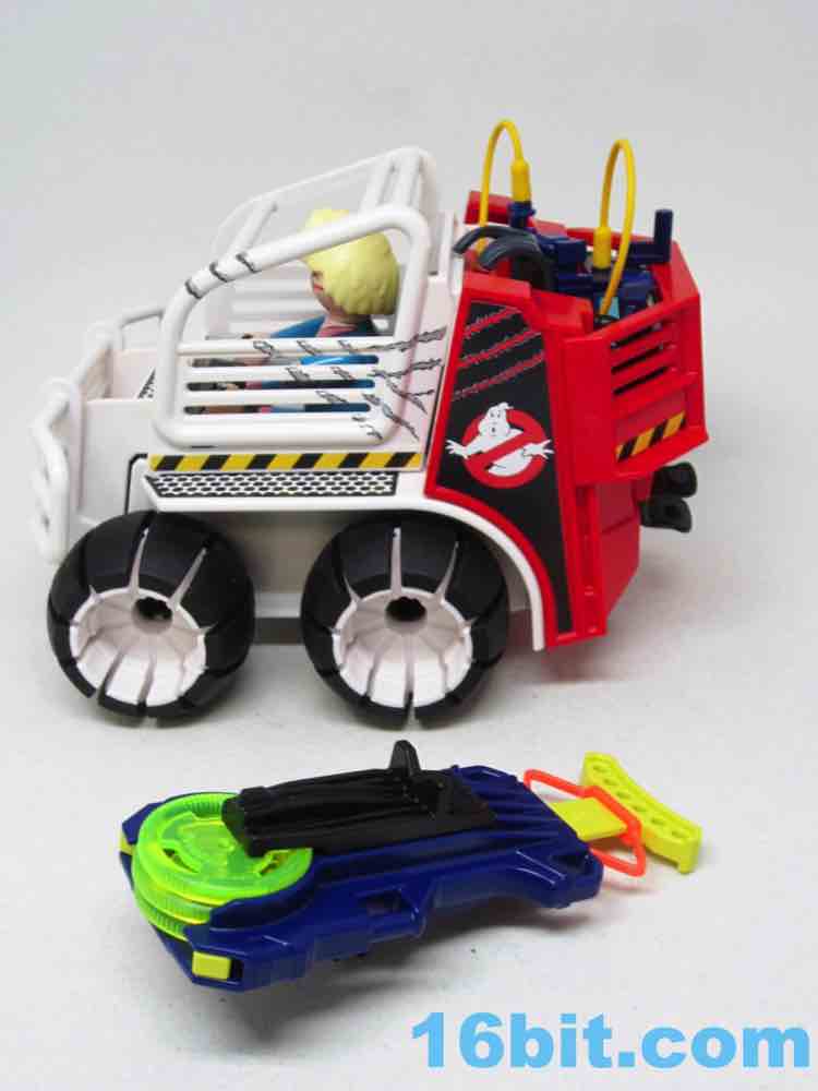 What's more, it has Kenner blue ghost gear - a proton pack, PKE meter, wand, and ghost trap. Other than the stickers, it all assembles in seconds and you'll probably dig what is one of the most 1980s toys on the market today. It's more colorful and sturdier than real 1980s Playmobil or The Real Ghostbusters toys, none of which were a slouch, with one exception. The disc launcher clamps on top of a bar on the car, and it comes off fairly easily. It rotates well and fires a decent distance, so it's a heck of a nice bonus to have here. If you love Egon, bizarre ghost figures, and hefty little vehicles, don't miss this one.
