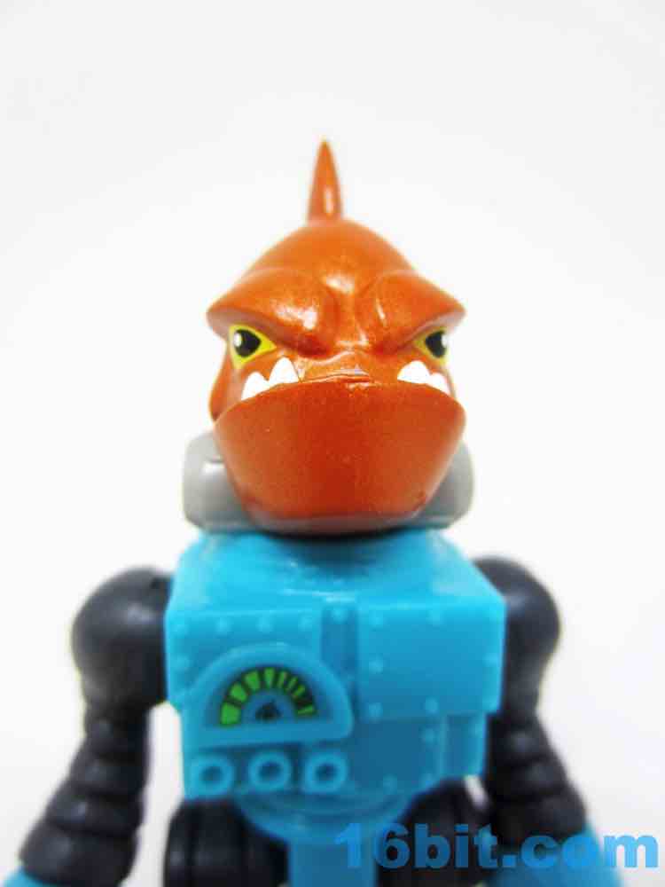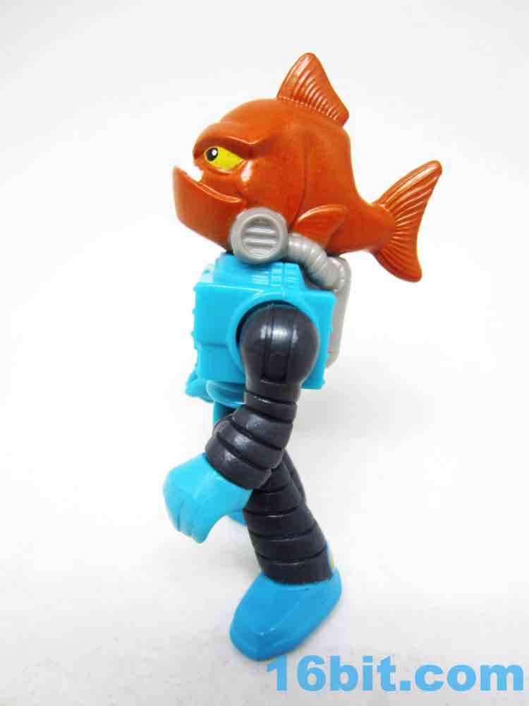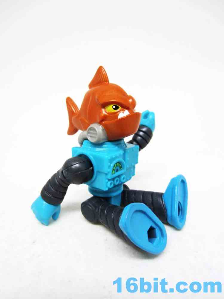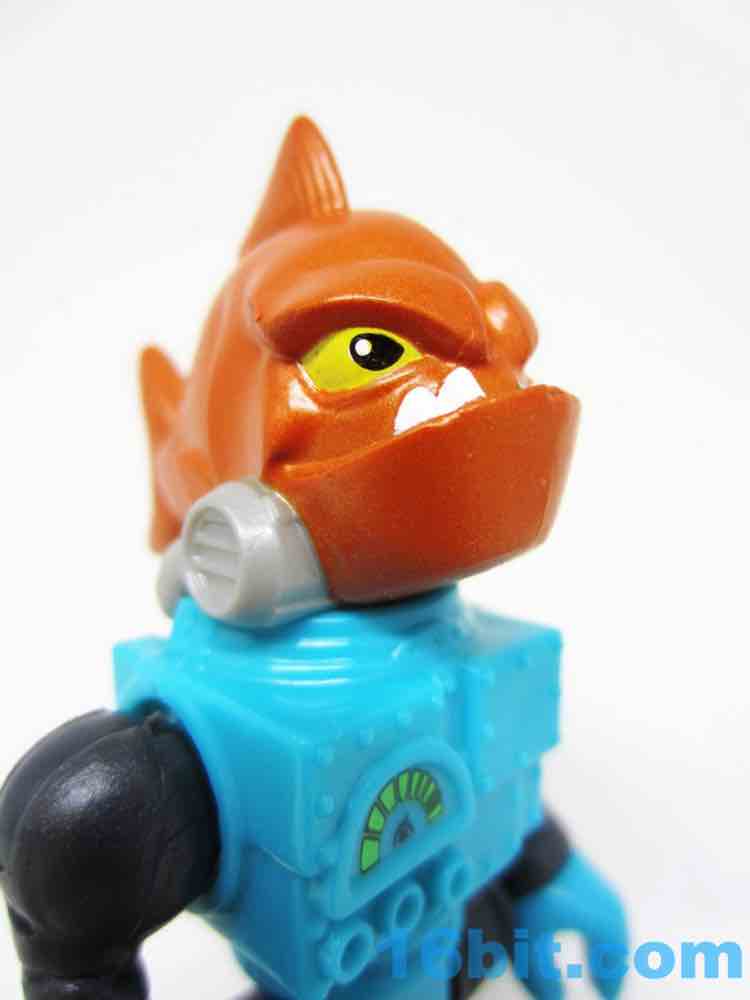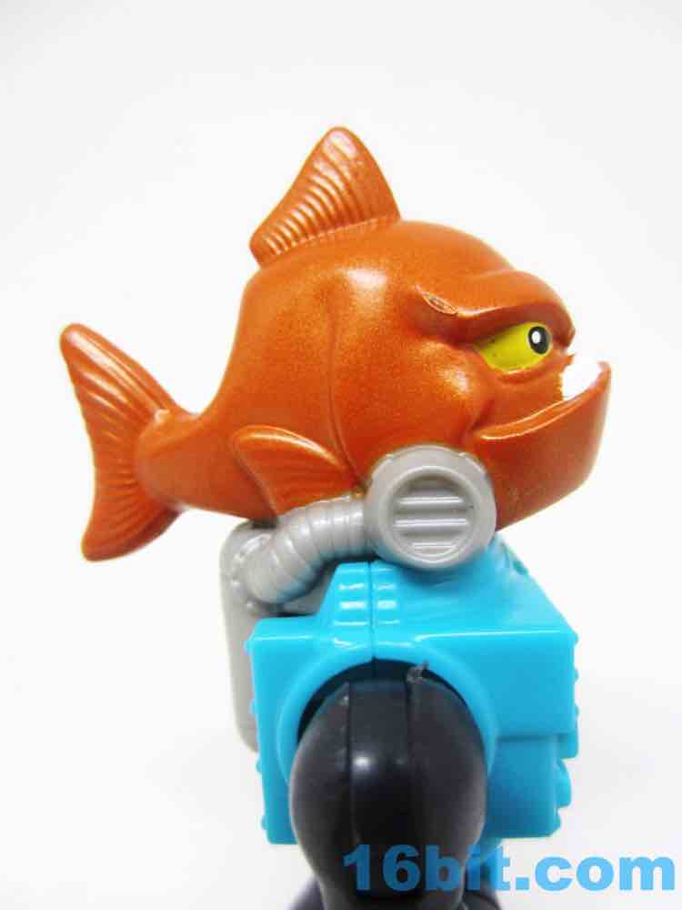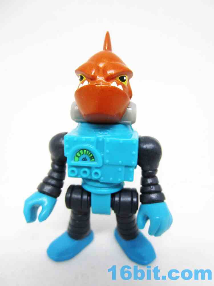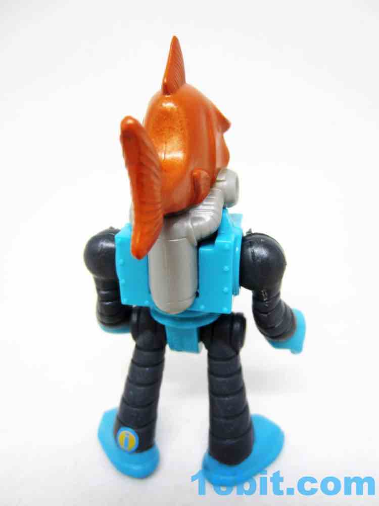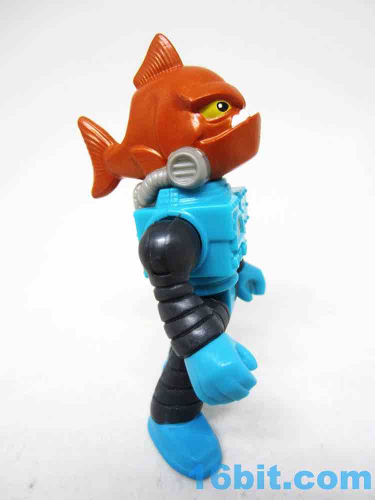 The 3-inch figure has no accessories, but does sport a lot of paint. The head is a whole fish body, painted in metallic orange with yellow eyes and an underbite to kill for. There are mechanisms keeping the gills covered from the robot suit, which also has a meter of some sort to read something. It's blocky with various rivets and joints, giving you the standard Imaginext articulation - shoulders, wrists, hips. The neck does not move on this particular figure.