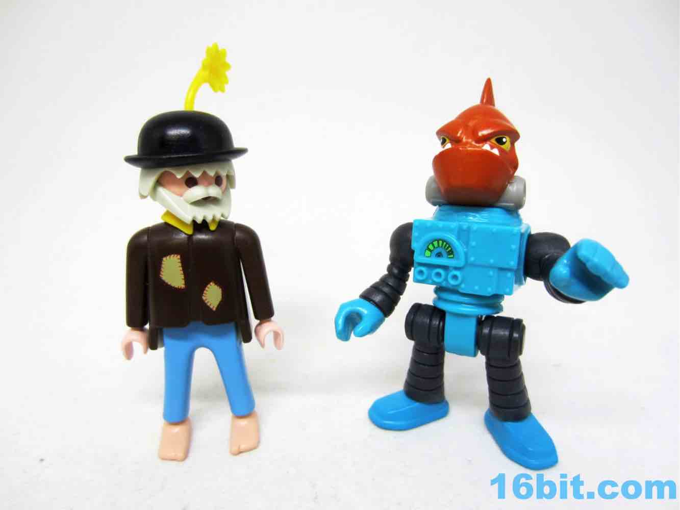 For the asking price of about three dollars, you get what may well be a trickle-down effect from the fashionable part of the toy industry. This feels like it borrows slightly from the world of designer vinyl figures, with metallic paint, a whimsical design, and no royalties to pay. I'm surprised we didn't get a goldfish bowl helmet, but not at all disappointed. I find these figures to be a real joy, although I am jealous of kids who are young enough to really get in to playing with the playsets. They could use him as a Batman villain, or a space alien, or just about anything. To me, it's just another awesome figure on my small Imaginext shelf - I love it, I'll keep it as long as life allows, but I do feel a sting of the pain that it'll never go on the same kinds of adventures my Adventure People Alpha Star astronaut, robot, and alien experienced 35 years ago. This figure and indeed the whole of series 11 comes strongly recommended.