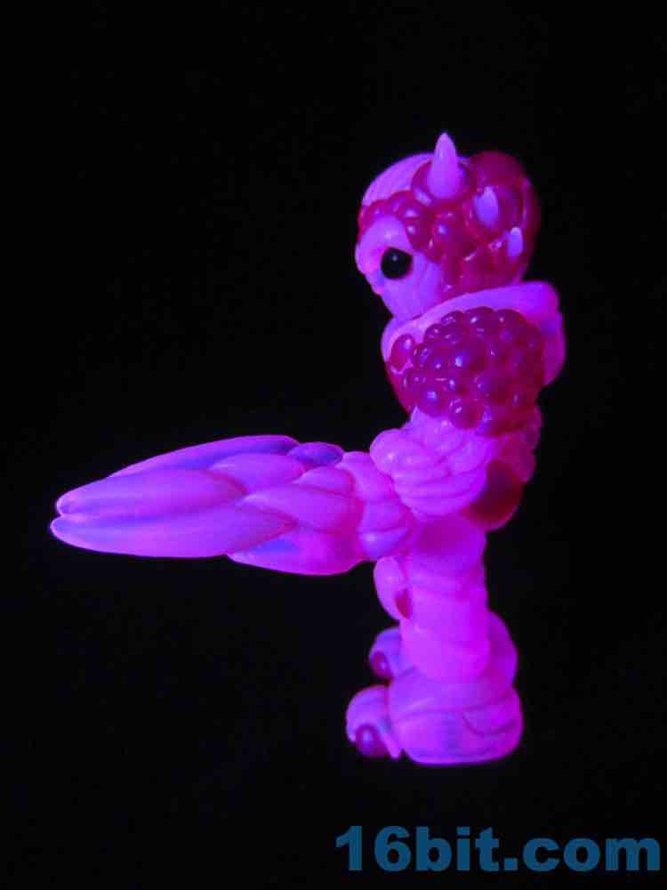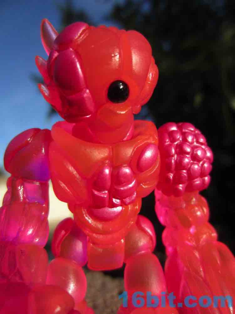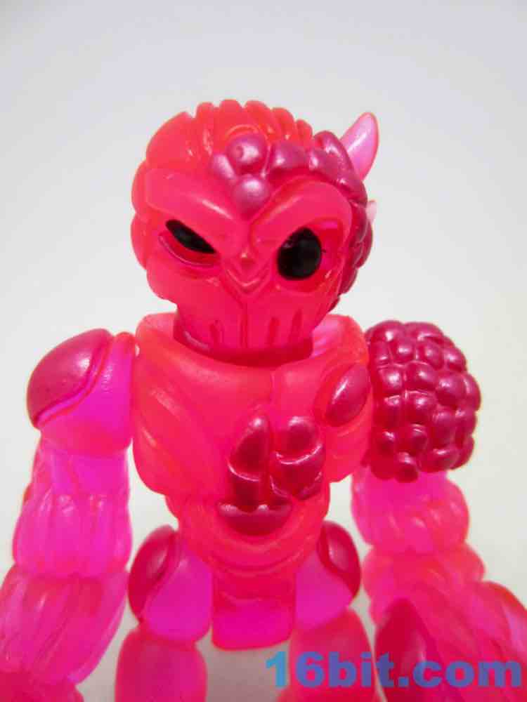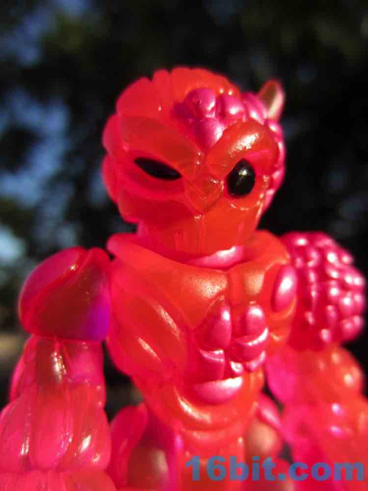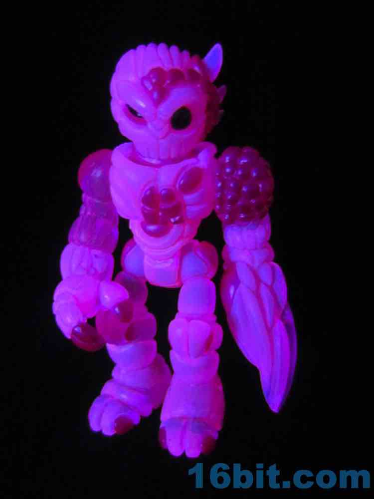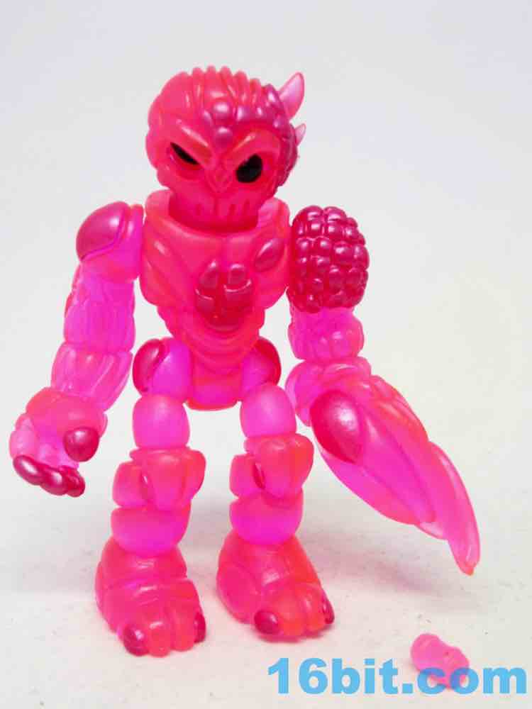 If the 2 3/4-inch Mutant Evolver Pheyaos Hyper Mordireus Fusion looks familiar, it should! Onell Design and RealxHead have been conspiring together on figures for years, most of which sell out in 30 seconds and I've never really had a shot at them. The default head matches Pheyaos Mini and Pheyaos Man, with an all-new Glyos-compatible body that really does match the style of the RealxHead soft vinyl figures you missed and can't afford. A bonus face on the back of the head looks a little bit like the Chaos Trooper, but what truly amazed me was the color match of the plastic. If memory serves the first Mordireus Pink figures were sold in the December 12, 2012 drop with the likes of Sarvos and Crayboth and again in September 2013 with