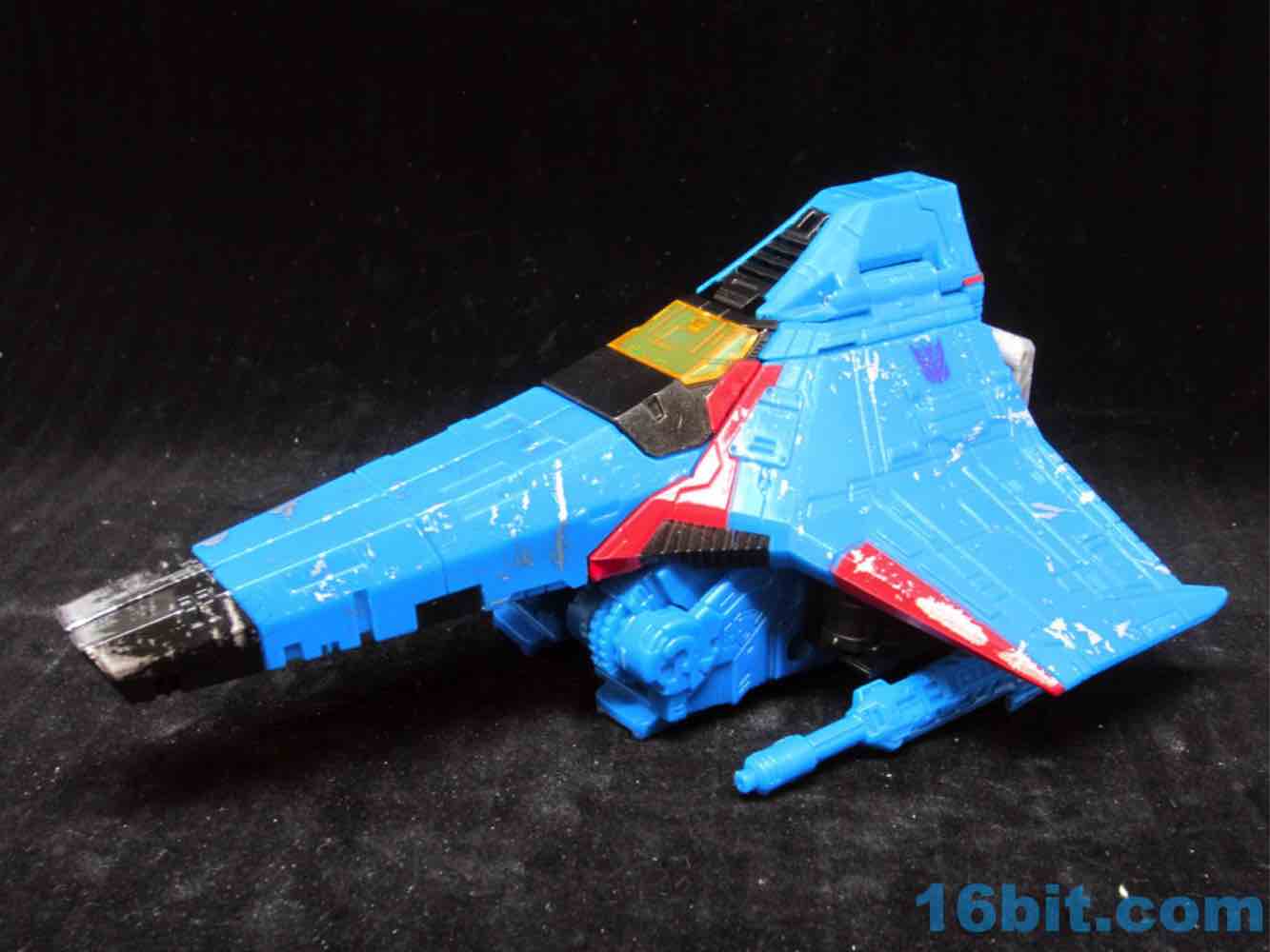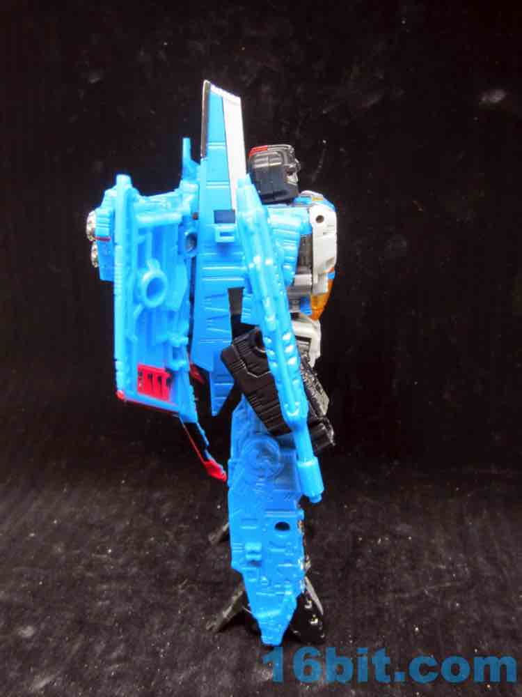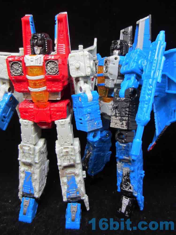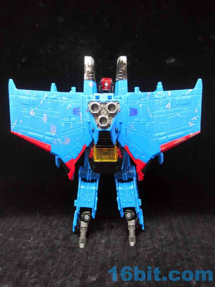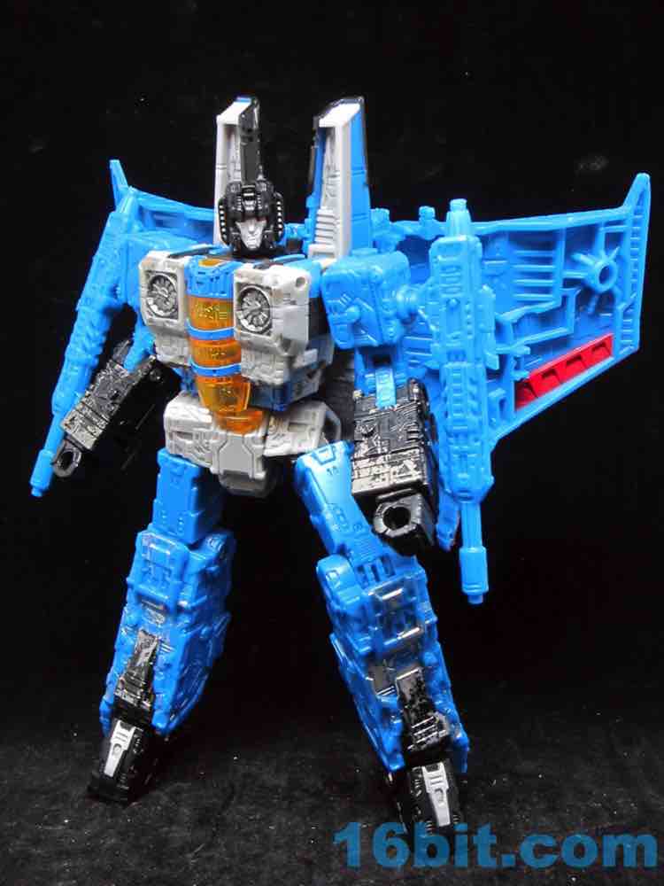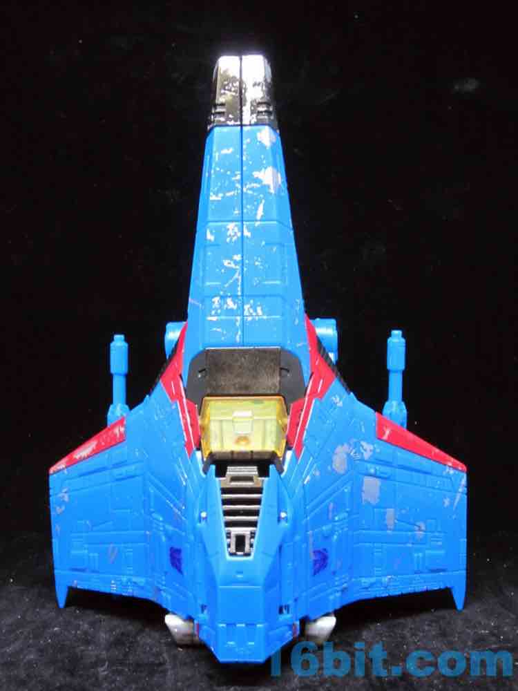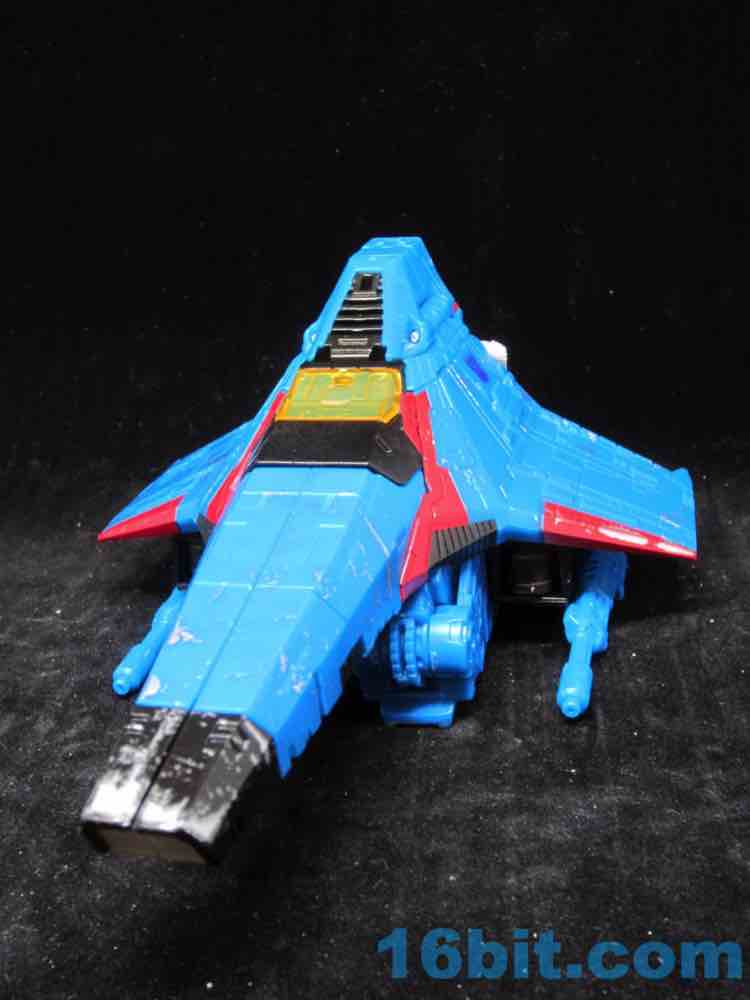 At a hair under 6 1/2-inches tall at the head, the figure is largely the Starscream repaint you expect. I doesn't have the Decepticon symbols on the fronts of the robot wings, but it does have proper G1 symbols on the back (also visible in plane mode.) The coloring looks great, and I'm very fond of the articulation and transformation. Rotating wrists still aren't a given in this line, so having double-jointed elbows and multiple hip and thigh joints makes it a lot of fun to pose. Also it's sturdy. And you get tilt ankles.