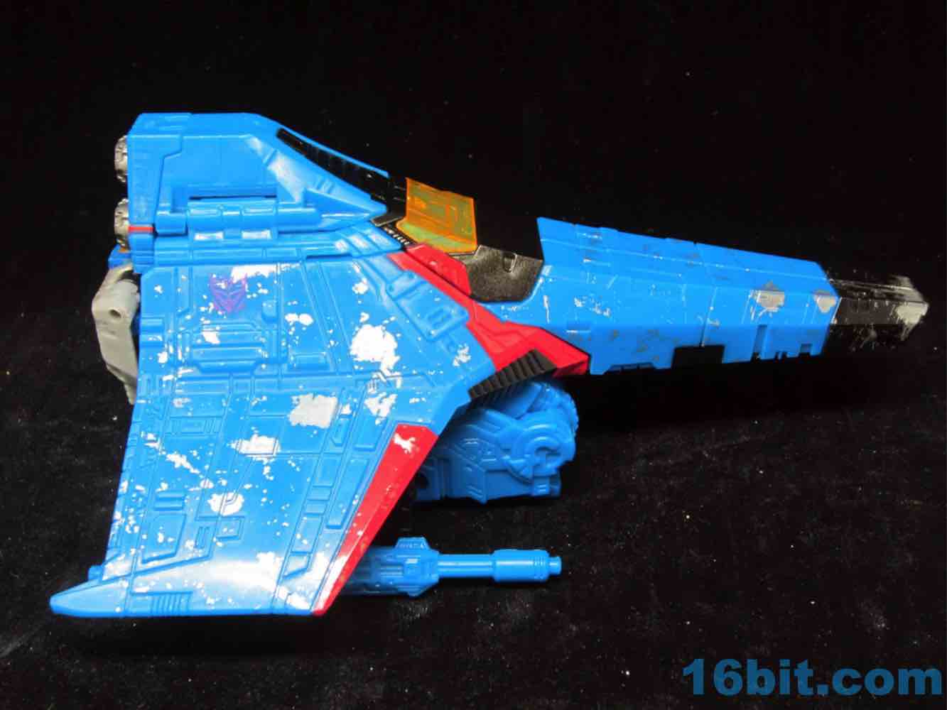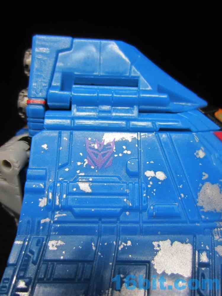 I was not planning on writing up Thundercracker, mostly because Starscream [FOTD #2,081] was a good-but-not-great figure. It looked wonderful, but there were some parts that popped off and I hate that. Hasbro took the same mold - and same battle damage pattern - and largely swapped the colors around to make a few improvements. The mold has two slight changes - the face is now a big ol' smirk, and the chest panel is less likely to pop off (but still does come off during transformation.) It does not have a metal rod in it.