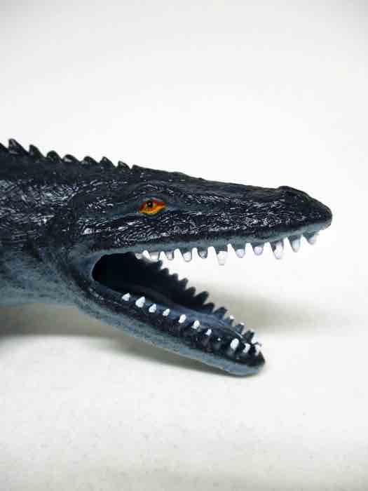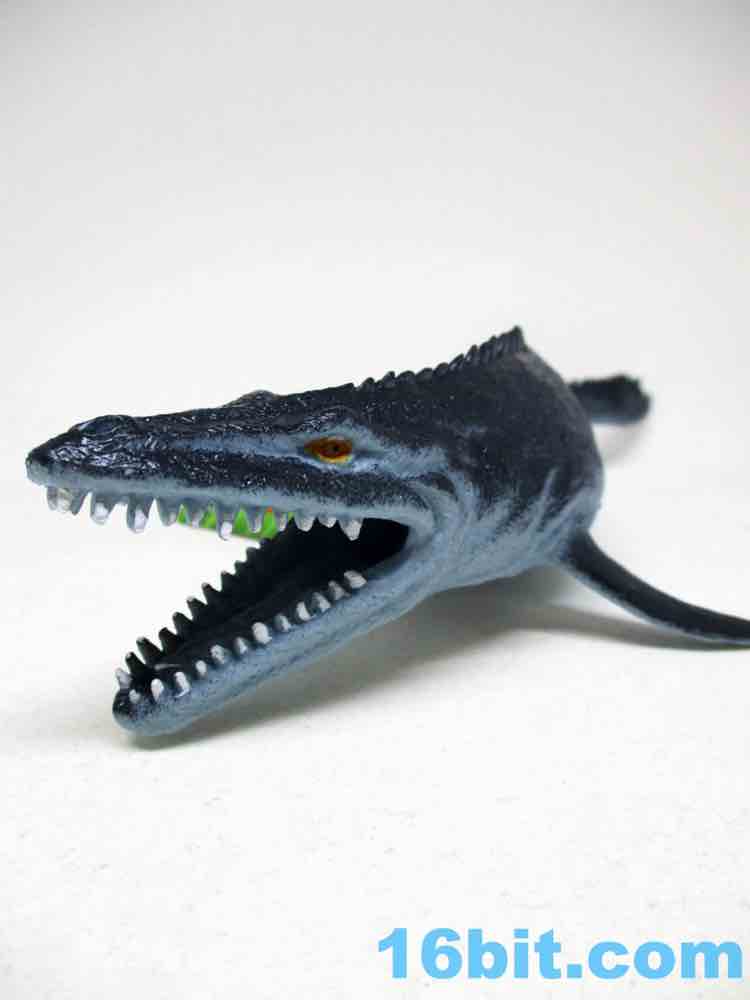 The hollow toy has a permanently open, somewhat grotesque maw with an open cavernous body behind it. You can throw a small micro figure behind the painted white teeth to its doom. It's slathered in paint, with dark blue pigment over the baby blue plastic. The eyes are painted orange, and the detailing is pretty sharp. It's shiny with lots of little scale-like notches, and there's a pretty decent frill down the spine. The tail is in line with the Jurassic movies' interpretation of this creature in that they lack the fluke at the end of the tail. There is much discussion on this topic. When dealing with a $1 figure, you have to deal with "close enough," and this certainly is a pretty decent toy.