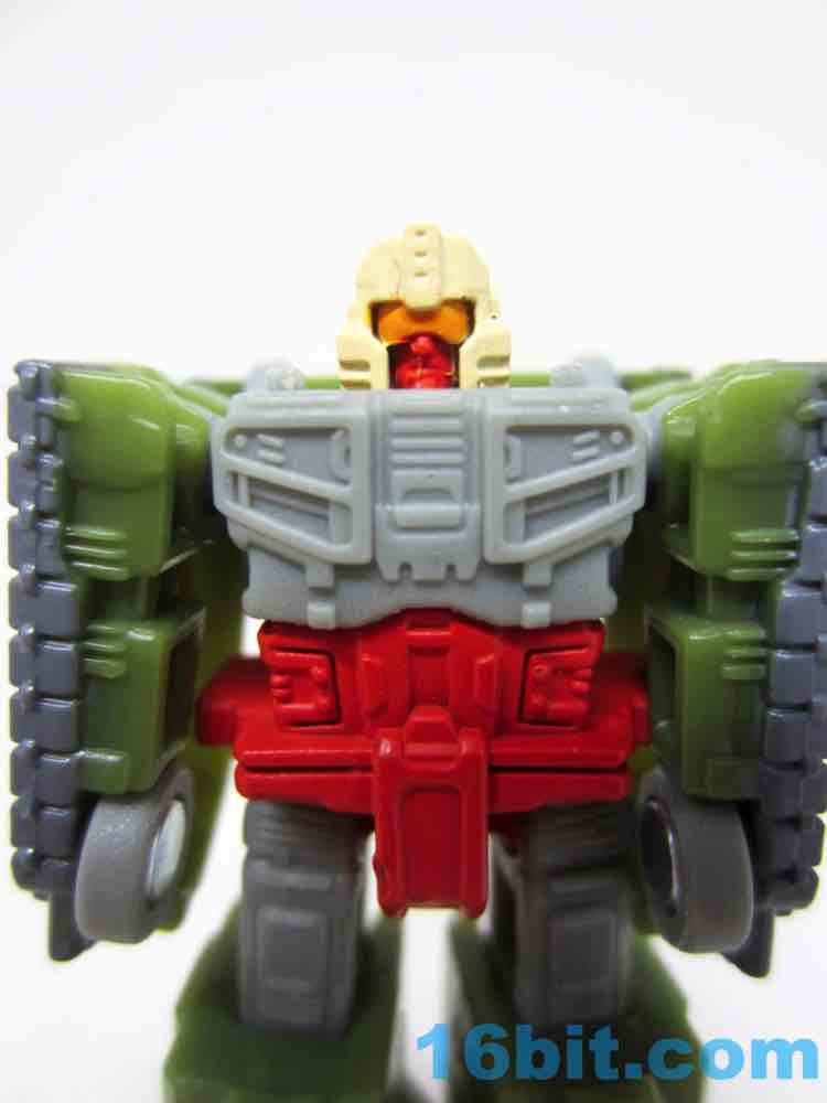 The robot stands about 2-inches tall, with a surprisingly ornate head. There's a painted orange visor, a red face, and a painted cream-colored helmet. The chest is now grey instead of that creamy yellow color, but we have painted treads and a painted Autobot symbol in missile system mode. The wheels turn a little bit, and the launchers are compatible with those fire blast accessories packed with the Battle Masters. It's a neat diorama piece, and it was painted blue as "Cratermaker" as part of a Target exclusive boxed set.