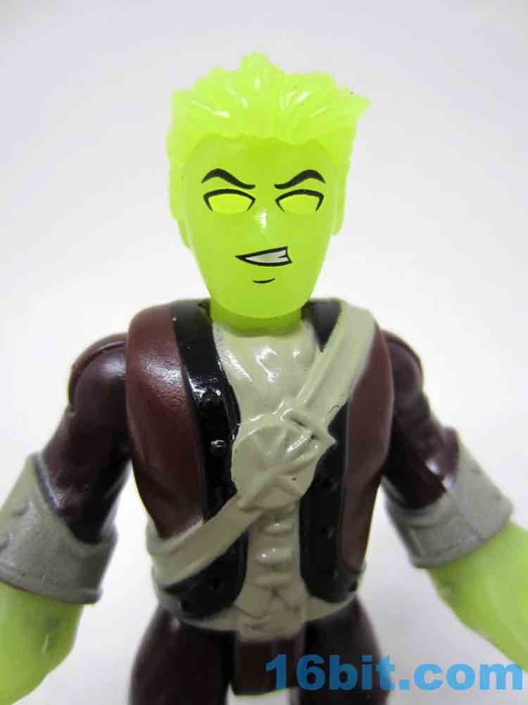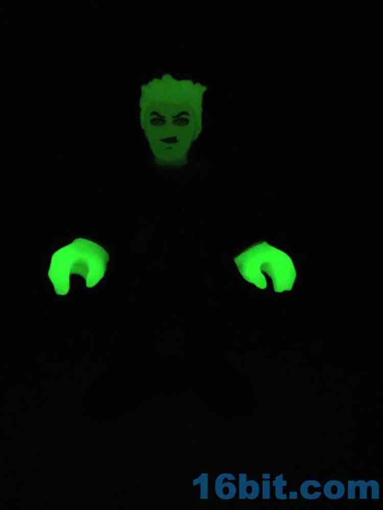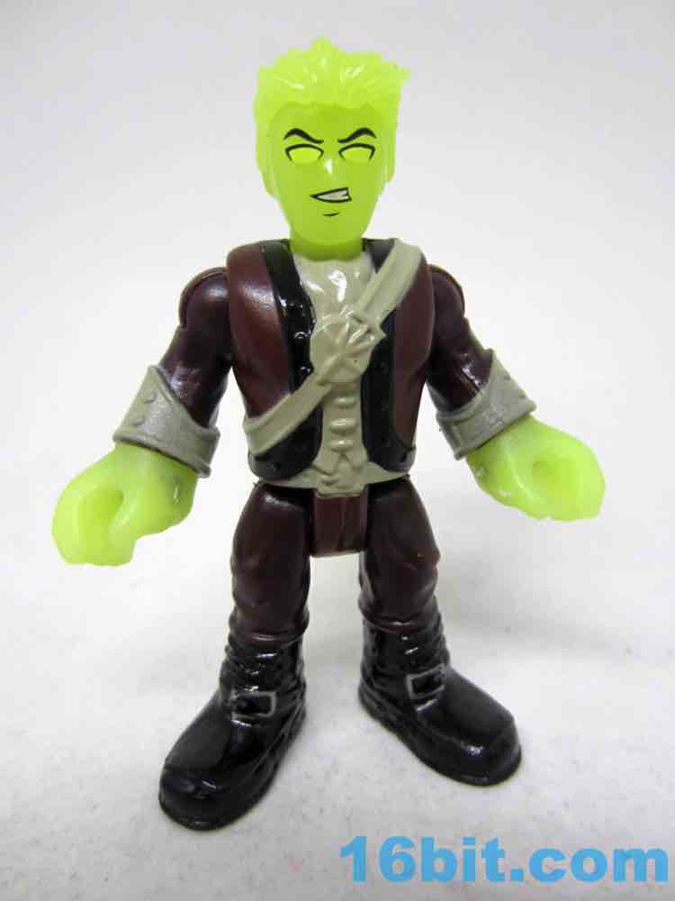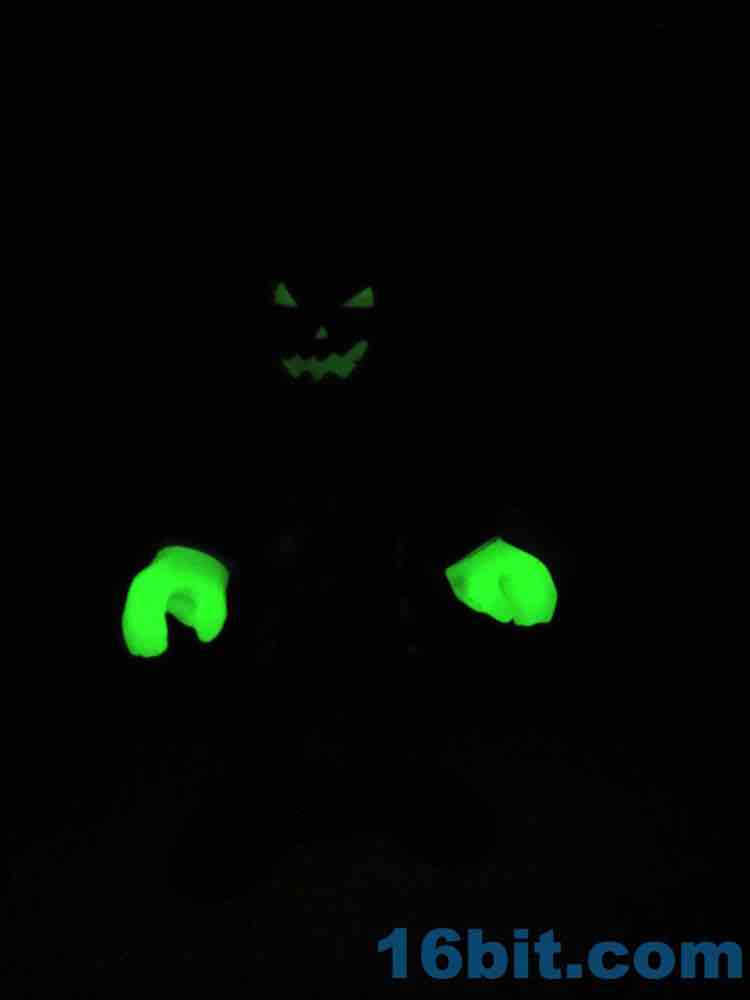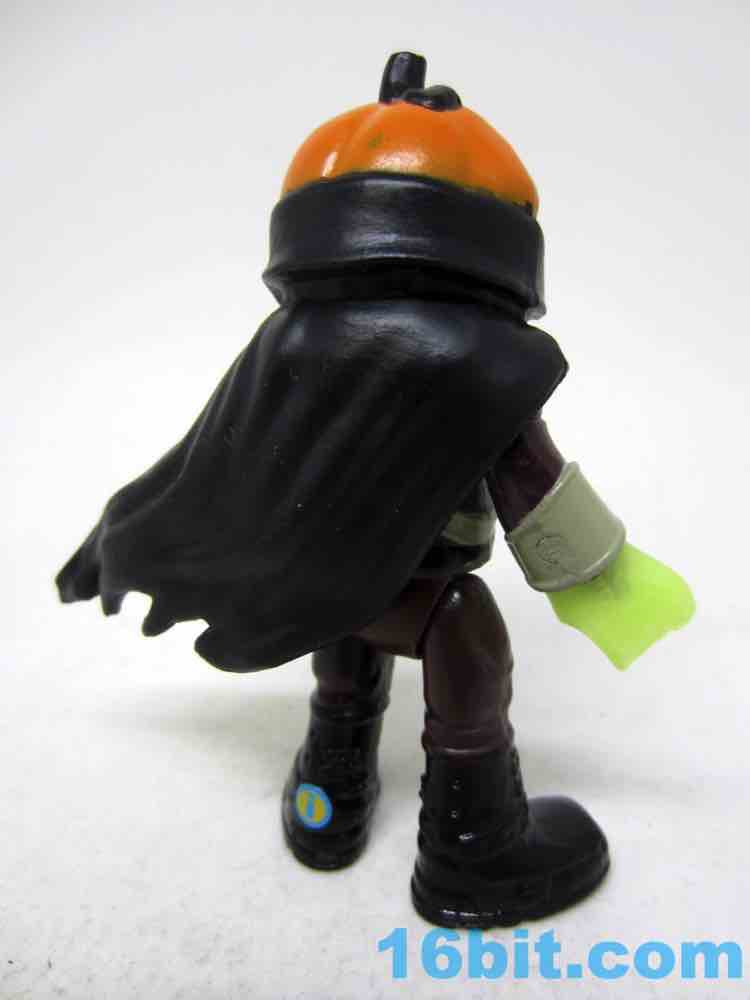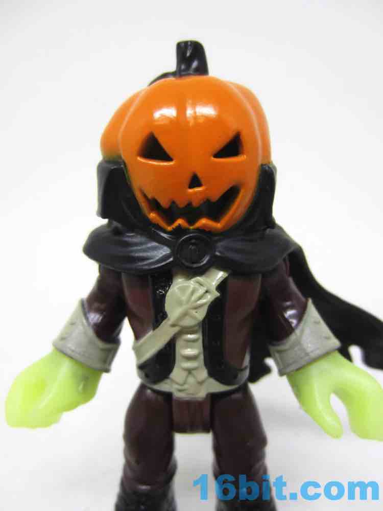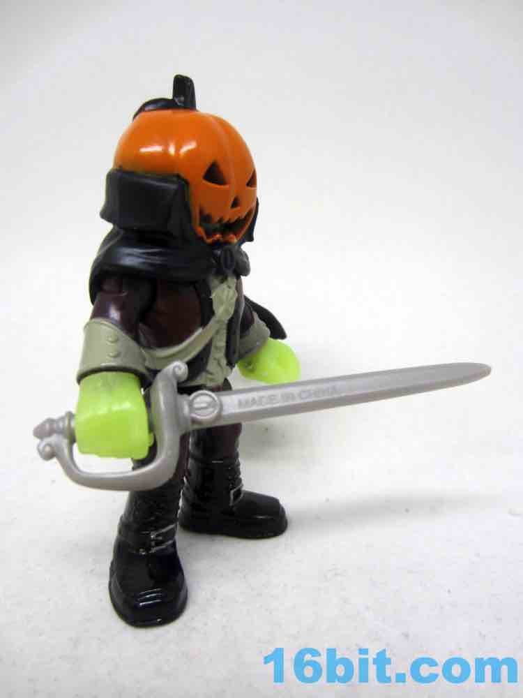 The glowing ghostly face under the mask has a sneer and pale green eyes. The hair is a separately molded piece, and for all I know was reused elsewhere. The Revolutionary War attire has been mistaken for a pirate by many, so for all I know there's a pirate figure sharing the body. With a glossy pair of black boots, the surprisingly detailed sculpt doesn't have a lot of painted detailing. The various loops on the waistcoat are painted to match the torso, as is the sash over the body. The jacket does have painted trim though, and articulation is par for the course. Additional decoration was spent on the pumpkin head, as the jagged bright orange mask needed to stand out from the removable plastic black cape.