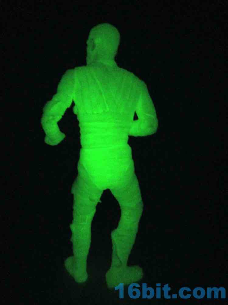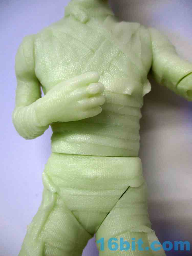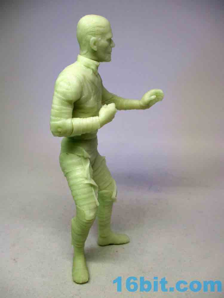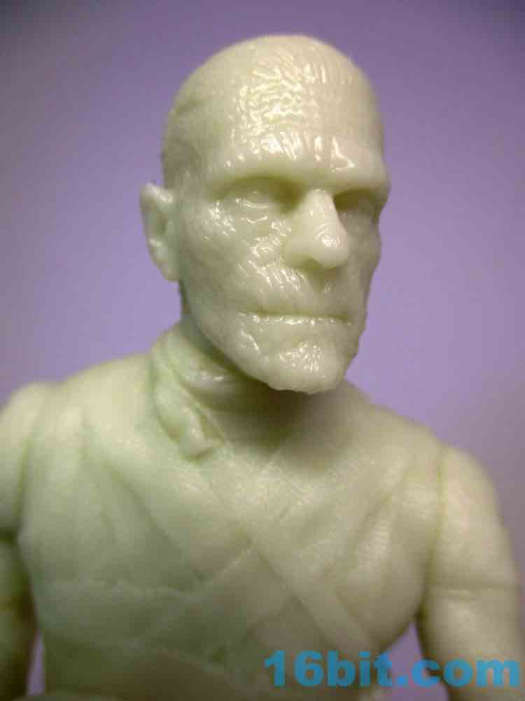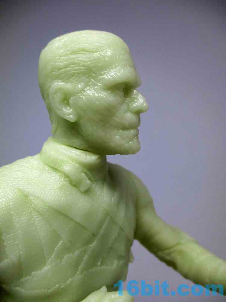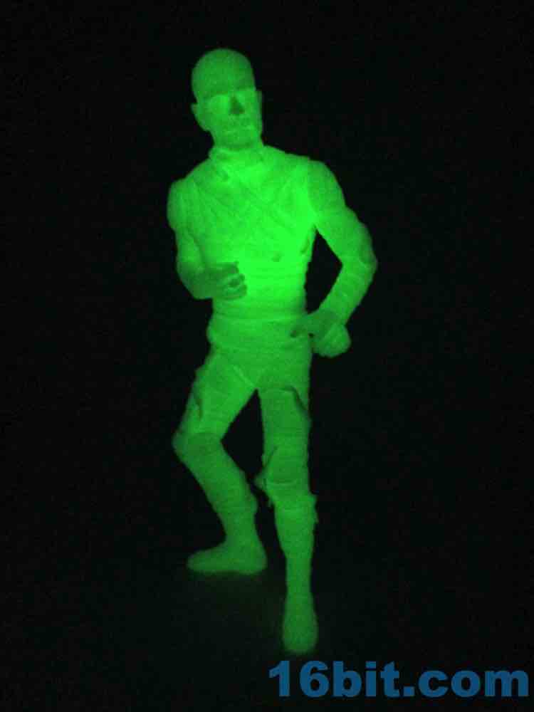 I don't know if it's age or dumb luck, but it's hard to keep him standing - his center of gravity is off. The figure's sculpting foreshadows Sideshow Collectibles' legendary attention to detail with some of the best work in the business of the figure's era, but glow in the dark plastic sucks up the light pretty well. You have to get in close to see the wrappings' texture, the wrinkled skin, the decrepit hair, and the pained, hunched-over pose. The Mummy's glow color lends itself well to mummy wraps, and there are quite a few joints on here too.