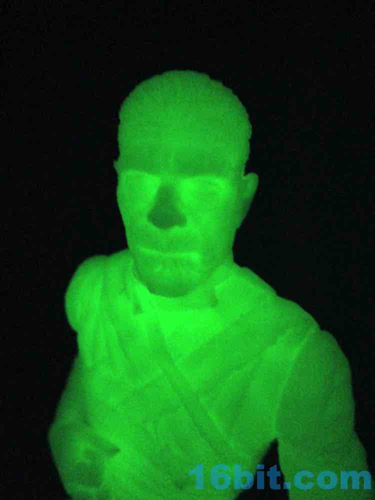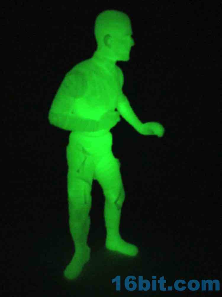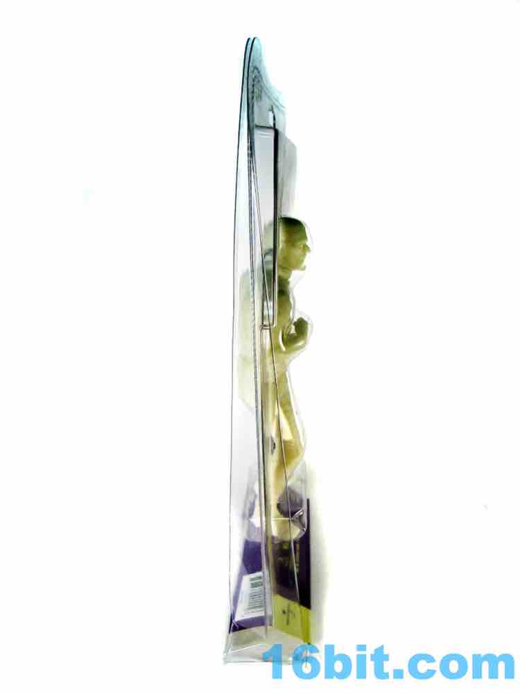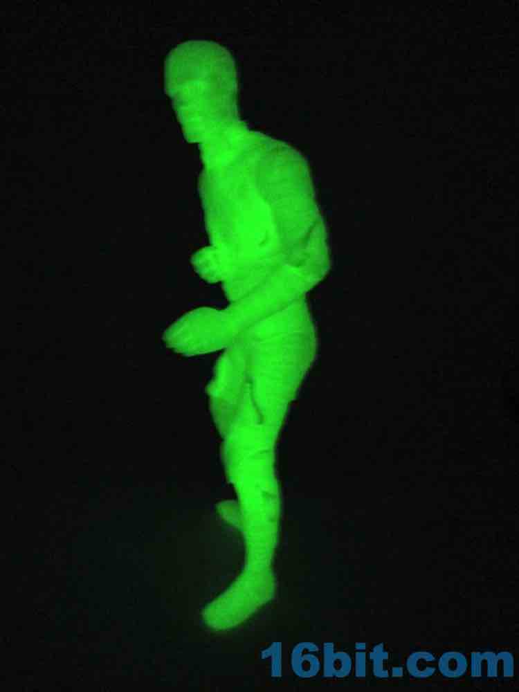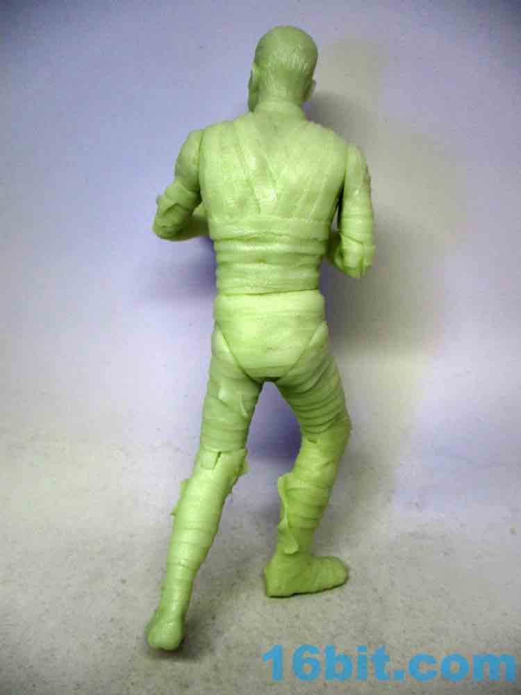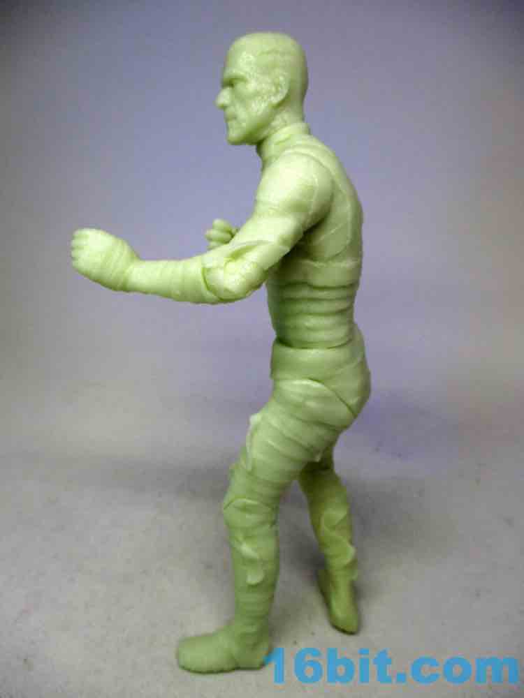 I don't know if it's age or dumb luck, but it's hard to keep him standing - his center of gravity is off. The figure's sculpting foreshadows Sideshow Collectibles' legendary attention to detail with some of the best work in the business of the figure's era, but glow in the dark plastic sucks up the light pretty well. You have to get in close to see the wrappings' texture, the wrinkled skin, the decrepit hair, and the pained, hunched-over pose. The Mummy's glow color lends itself well to mummy wraps, and there are quite a few joints on here too.