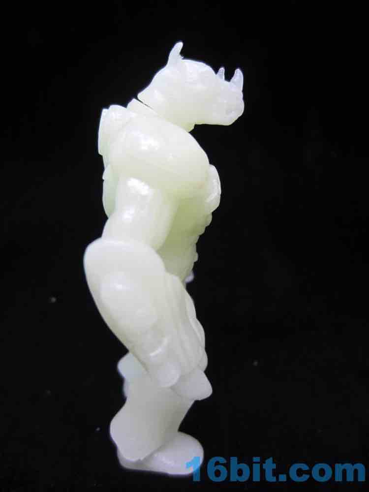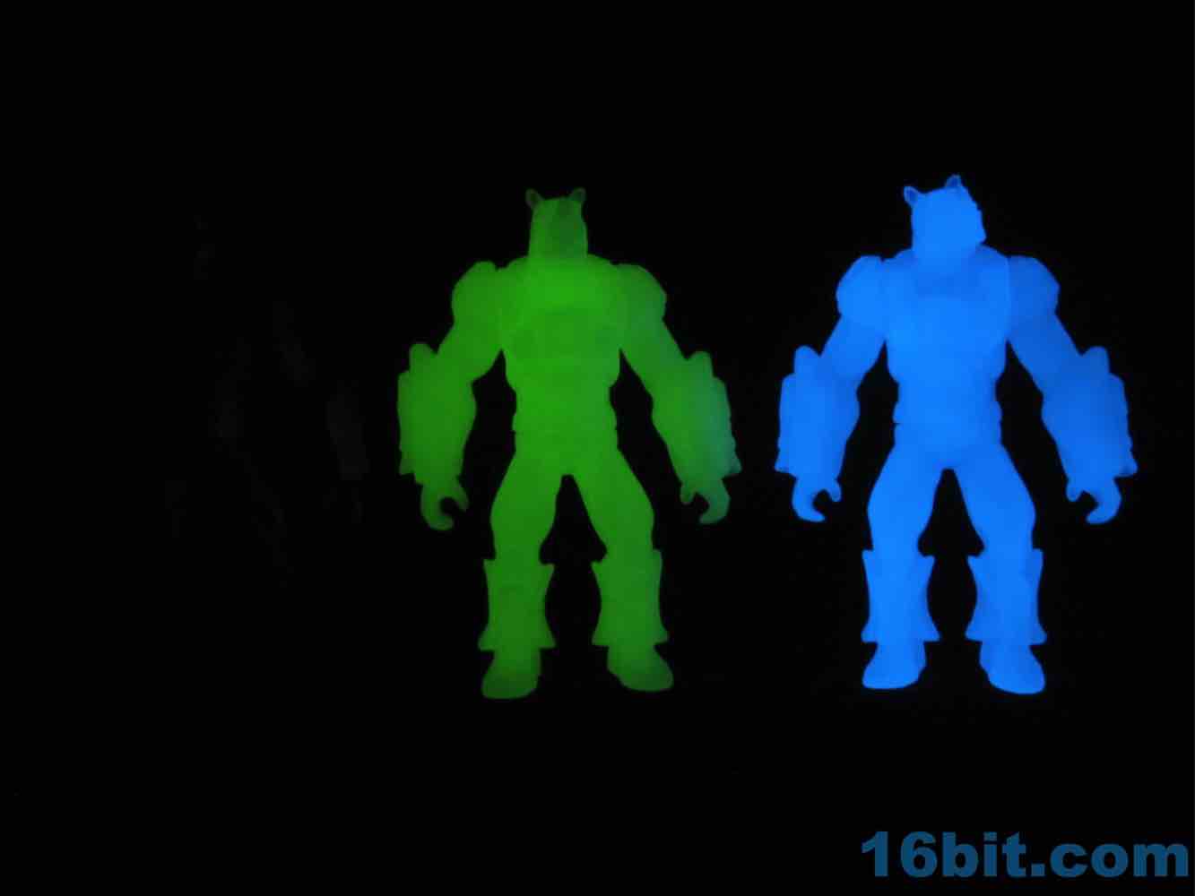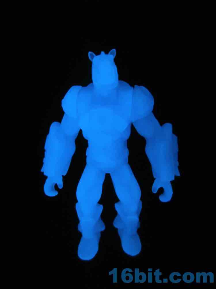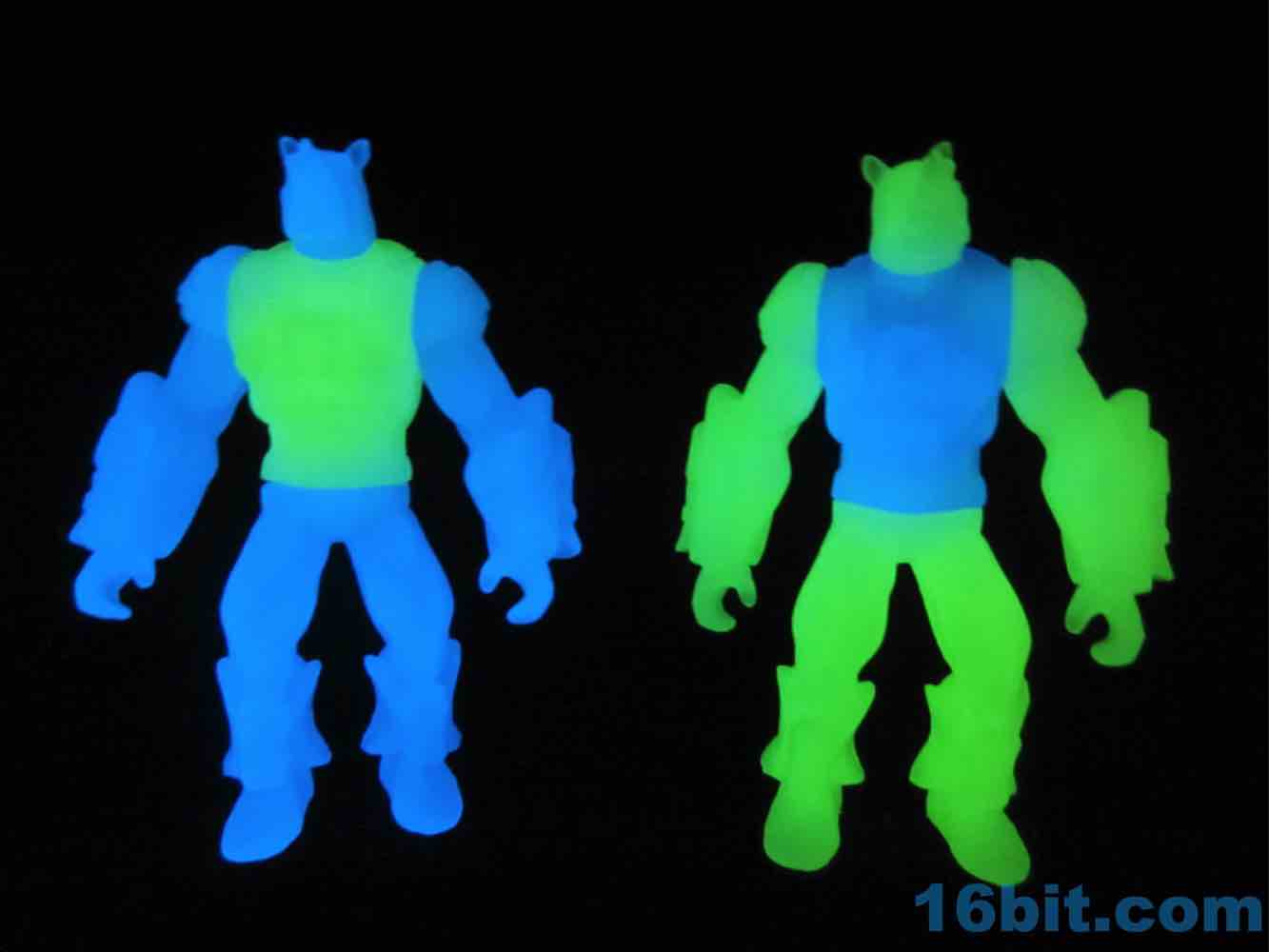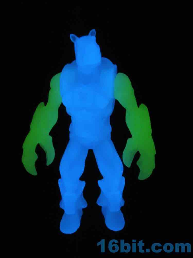 The molds are the same as you may have bought five years ago, with four points of articulation on the Rhino and a fifth for the Scorpion's tails. The heads pop off, as do the arms, as do the legs as a single unit at the waist. The modernized Battle Beasts-ish figure has the same detail as before, but most glow plastic tend to such out the detail thanks to the properties of glowing PVC. It's a little translucent, a little milky, and the light doesn't reflect off as well as on opaque or painted figures. As such, you're basically buying this figure because it's going to glow in an impressive way.