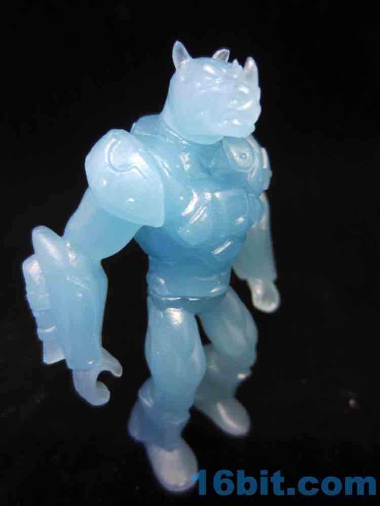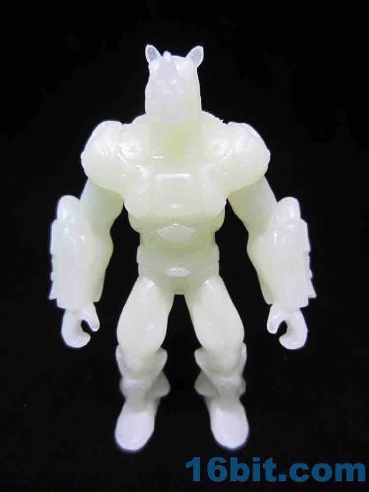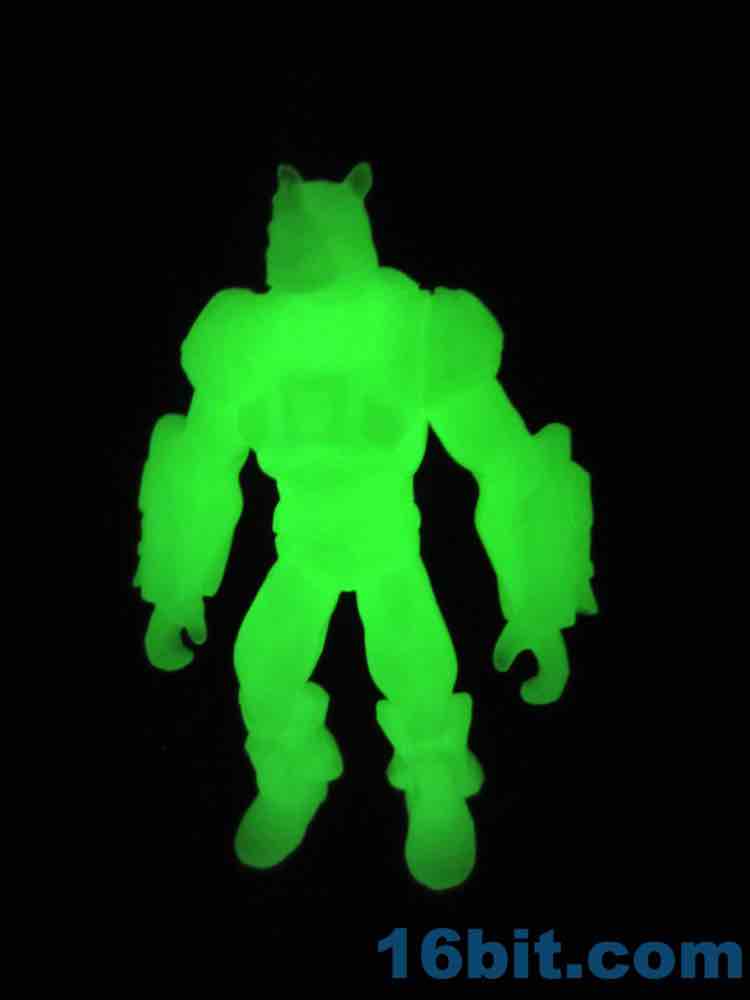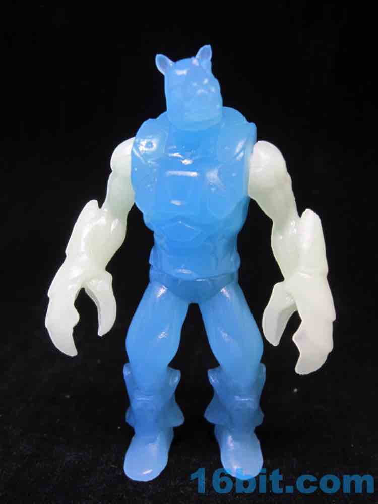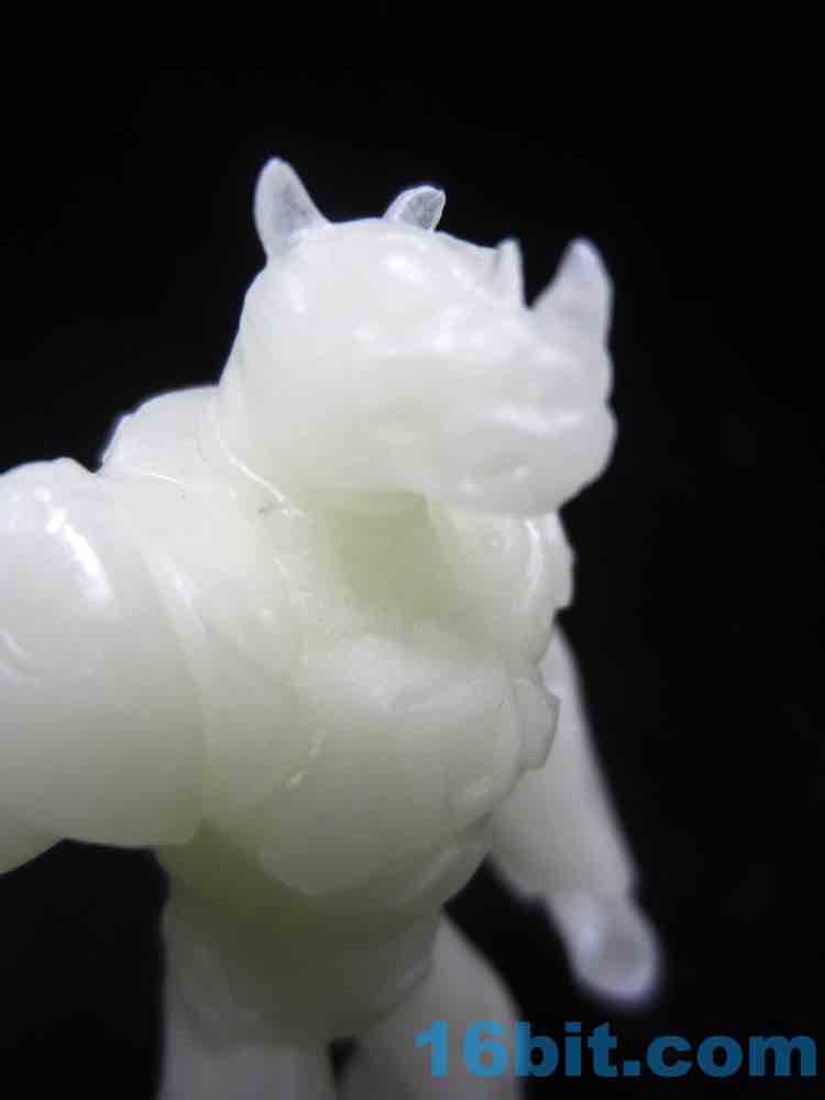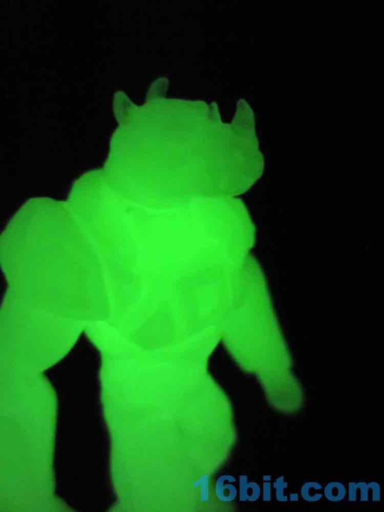 The molds are the same as you may have bought five years ago, with four points of articulation on the Rhino and a fifth for the Scorpion's tails. The heads pop off, as do the arms, as do the legs as a single unit at the waist. The modernized Battle Beasts-ish figure has the same detail as before, but most glow plastic tend to such out the detail thanks to the properties of glowing PVC. It's a little translucent, a little milky, and the light doesn't reflect off as well as on opaque or painted figures. As such, you're basically buying this figure because it's going to glow in an impressive way.