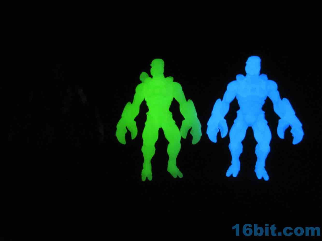 For best results, you want to use your black light or direct sunlight to activate the blue glow figures. In normal indoor light they do glow a bit, but the effect is much more pronounced with extremely bright direct light or the UV light bulb I assume you got cheap from Walmart. It shines nicely in the right conditions, with the blue figures glowing overnight (no kidding) and the green ones lasting up to a couple of hours. They charge well.