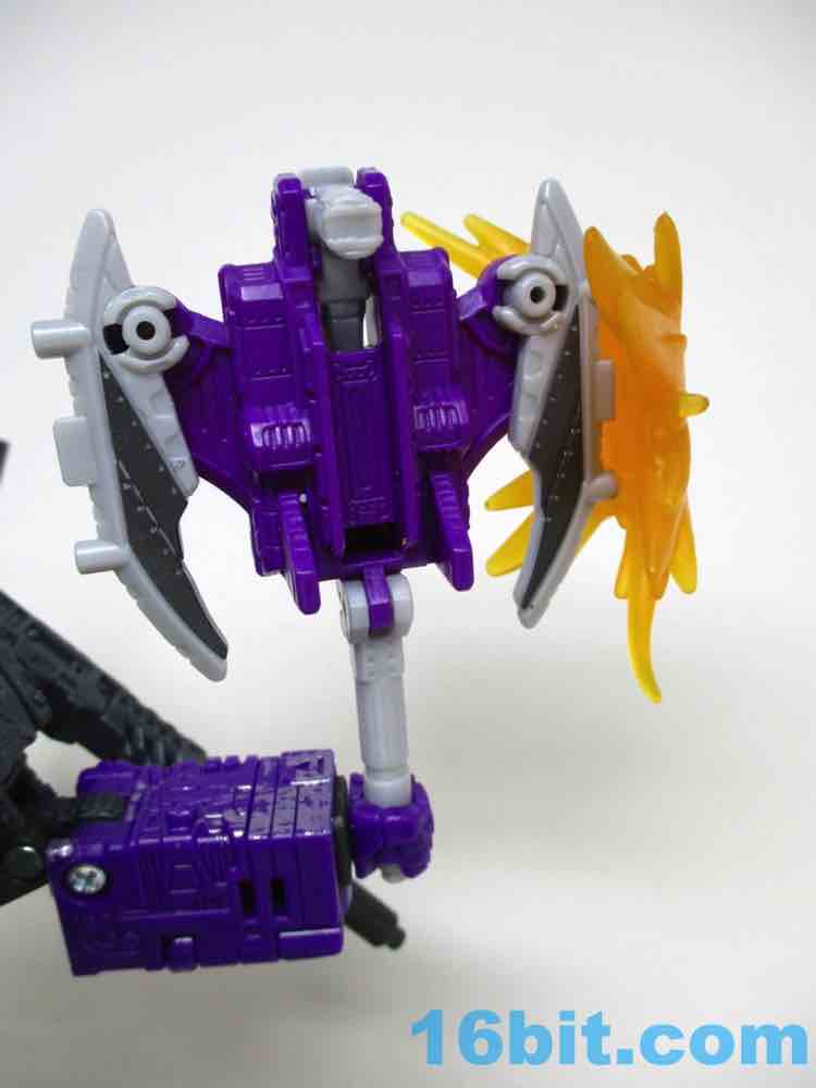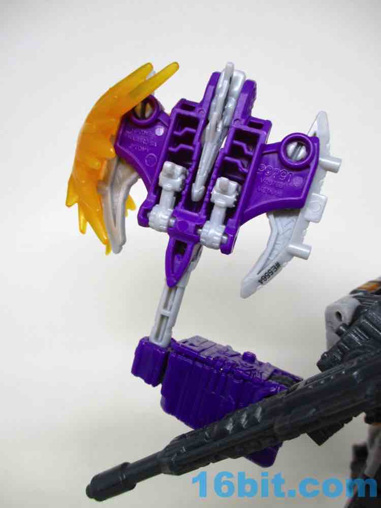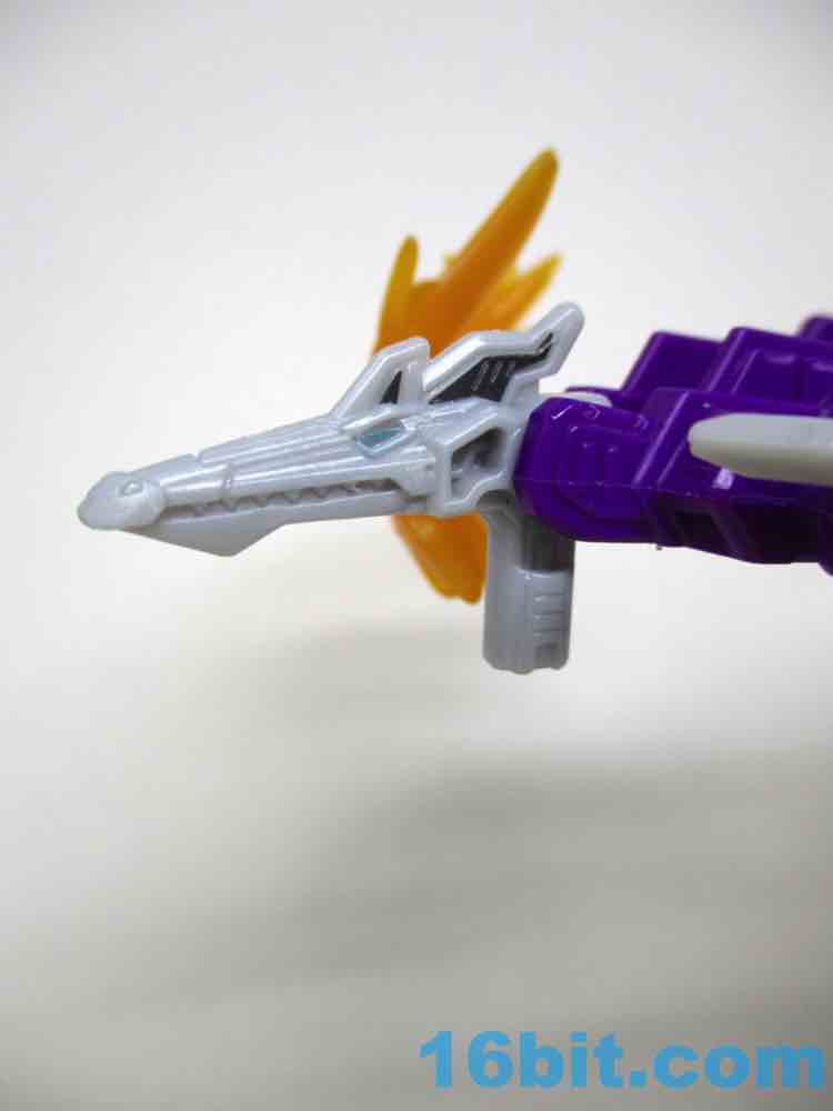 Rounding out the set is Terror-Daxtyl, an ax pterosaur. This take on him is purple and grey, as opposed to the green and black Pteraxodon. There's an impact blast in orange, and mine came a little bent out of shape in the tray. It fits nicely, and it's a perfectly acceptable axe - but the form isn't as strong as a blaster Mercifully, it's easy to contort the mold into a makeshift blaster that looks perfectly nice. It's wildly different in color, and that's a big plus - the articulated wings and feet help the prehistoric robot creature mode stand or look like it's "flying." It's versatile, Hasbro and Takara-Tomy did a good job with the original mold and the redeco, too.