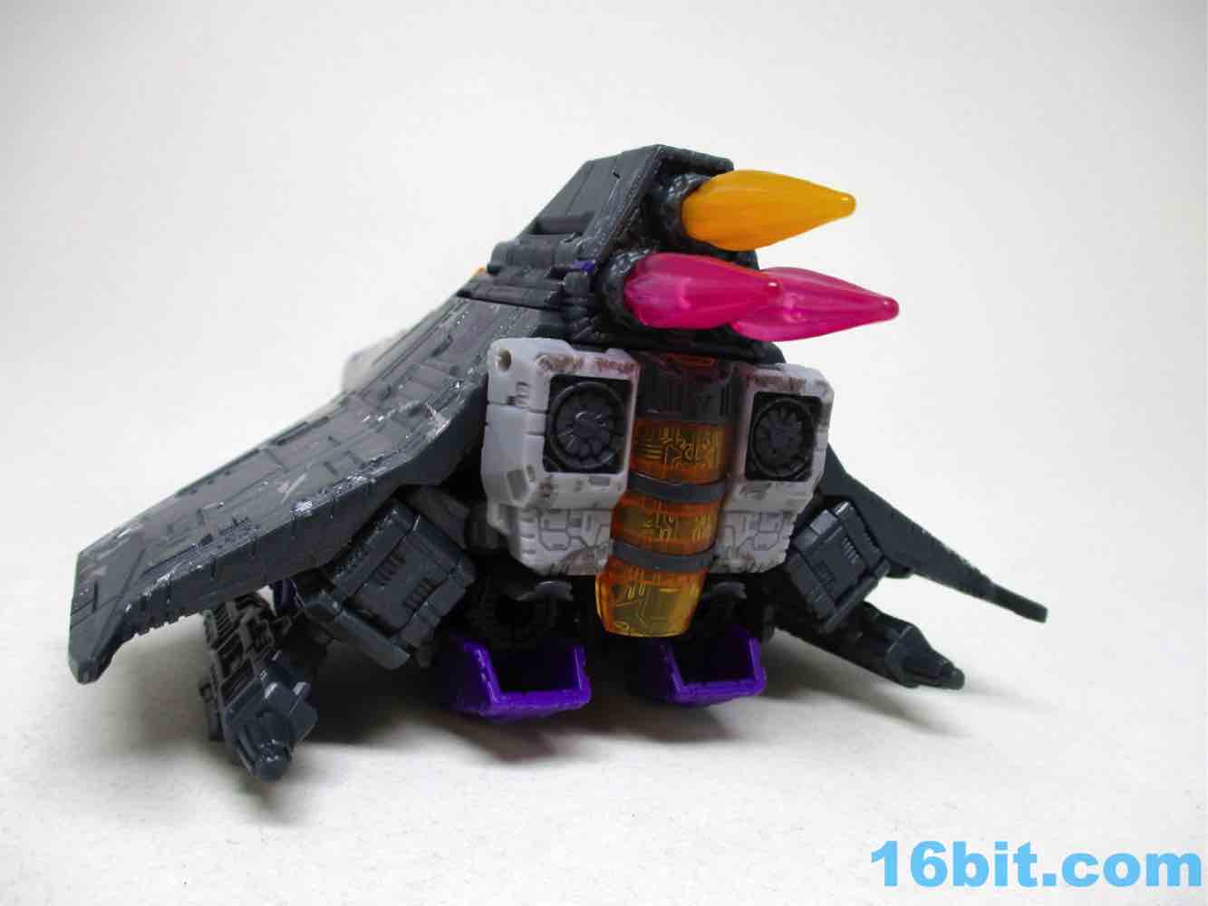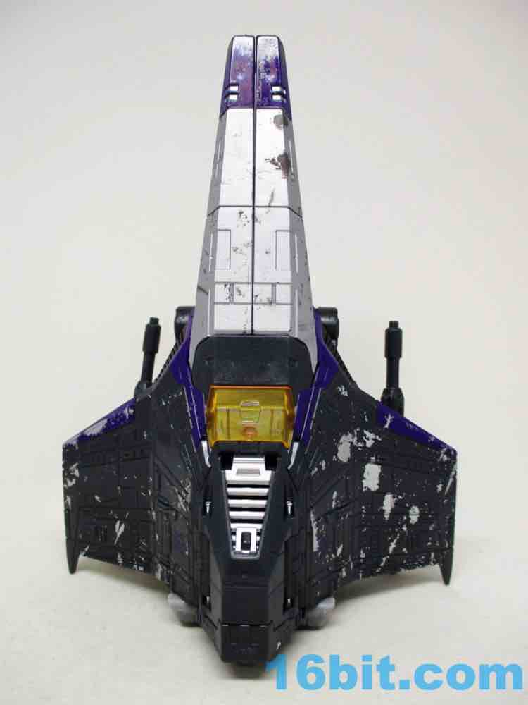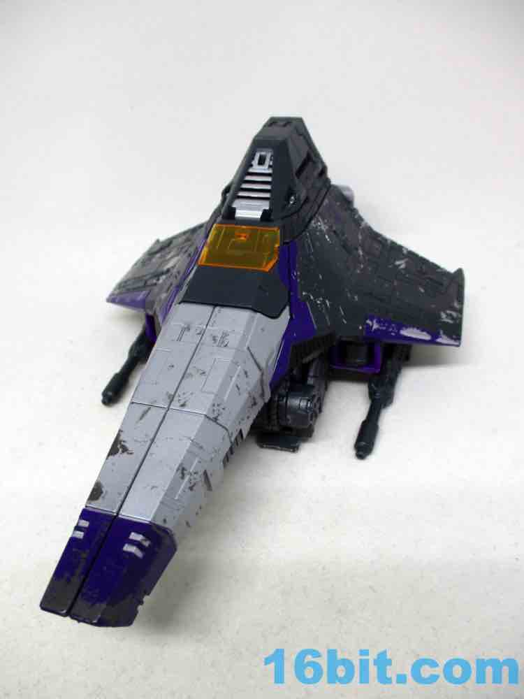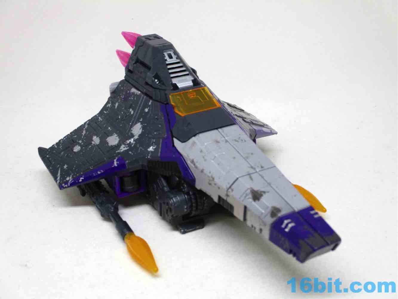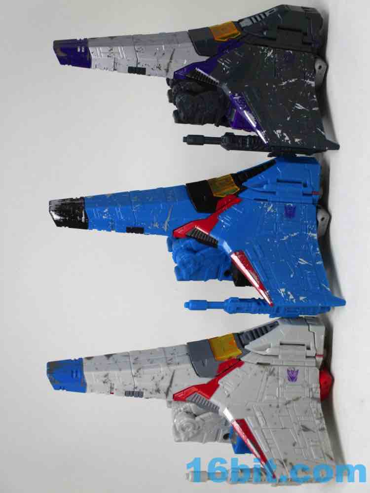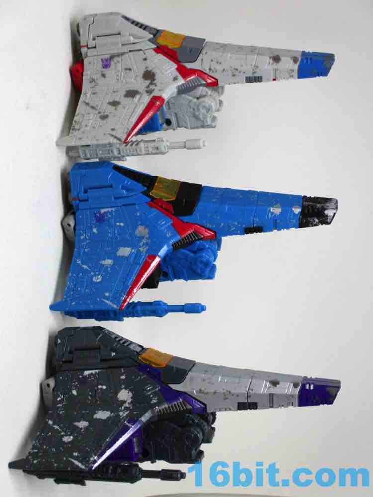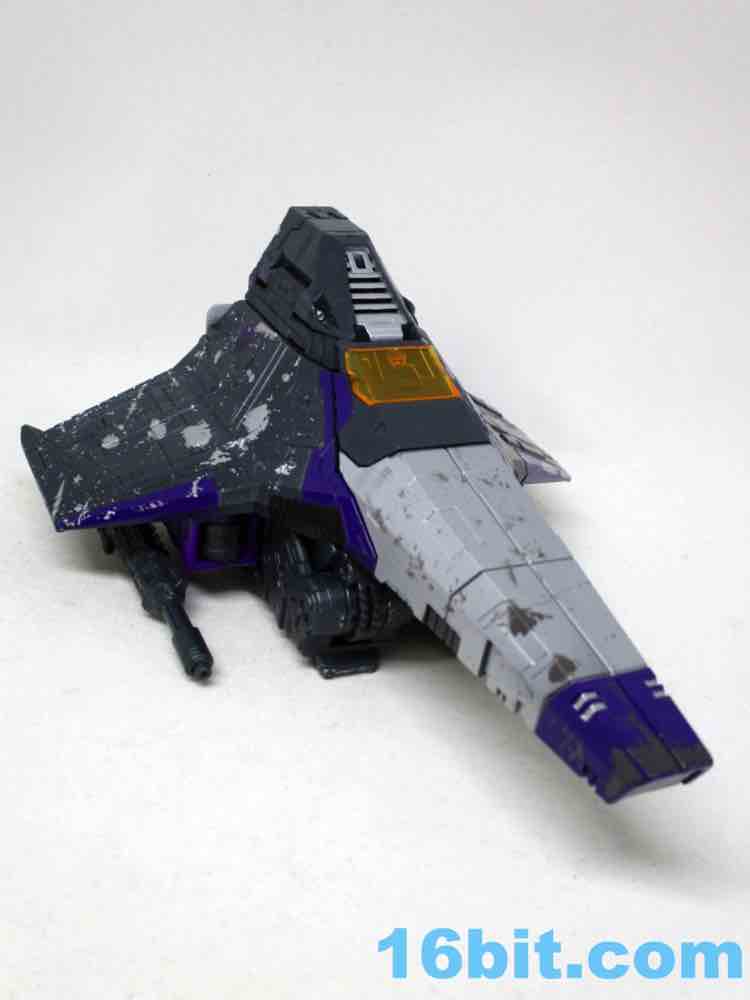 Skywarp is why you'll buy this set - Hasbro and Takara-Tomy had a good eye for detail here, giving the starfighter mode a lot of extra silver paint. This matches the tetrajet decoration in "More Than Meets The Eye," the debut of the character on The Transformers cartoon. It's not quite black either, but rather a dark grey charcoal color. There is a bit more going on here than most of the other Siege Seekers molds, but most of the paint is placed in the same exact place as the other toys. The scrapes, the stripes, the sigils, most of it is identical. I'm amazed that the various scrapes and damage do look different enough when rendered in a new color, but the same color in the same place across multiple molds does start to look like someone was asleep at the deco wheel. The black glitter vents painted on the dark grey charcoal plastic was also dubious, but it looks cool. The quality is there in this single figure, but across the line some elements look less than thrilling.