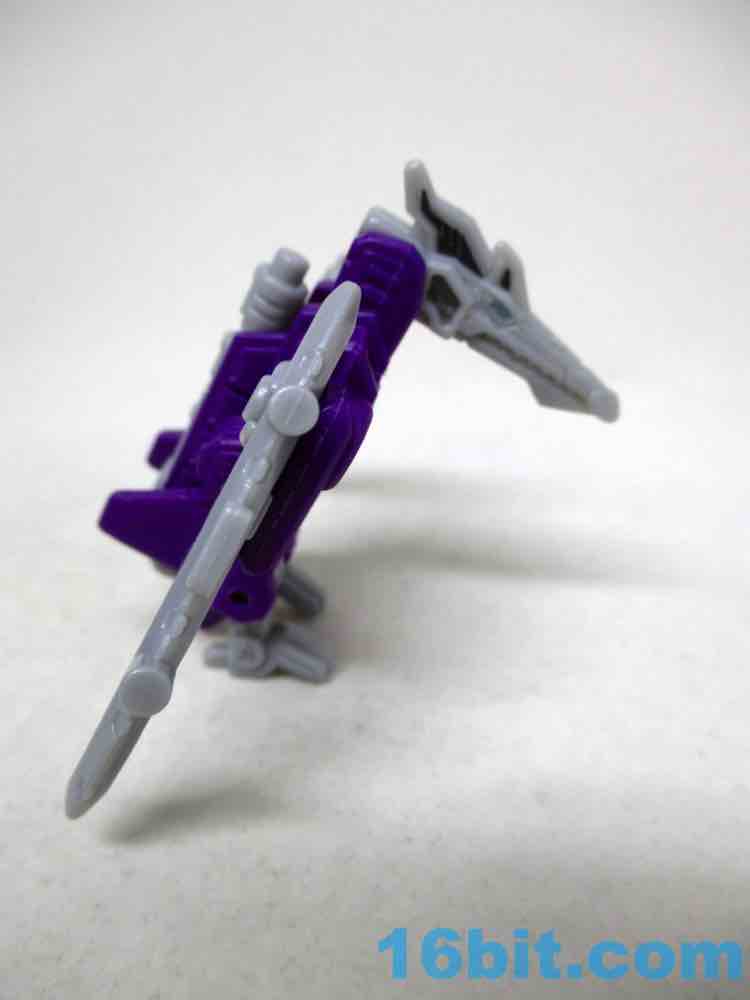 The Skywarp robot is great. He's got tons of articulation so he can push you down the stairs, along with purple fists and forearms with matching feet. The figure's color layout looks close enough to the idealized G1 artwork we've seen on and off for decades that it will scratch the itch of classic-ness, but those who need true rich black plastic won't find it here. Maybe next time! I appreciate that it deviates from the norm as Skywarp goes, but that means we don't have a traditional black repaint here and that seems odd. Maybe that's coming later. (Probably not.) Skywarp's chest doesn't pop off as easily as Starscream [FOTD #2,081], so it seems they improved parts tolerances as the mold aged. Good on them.