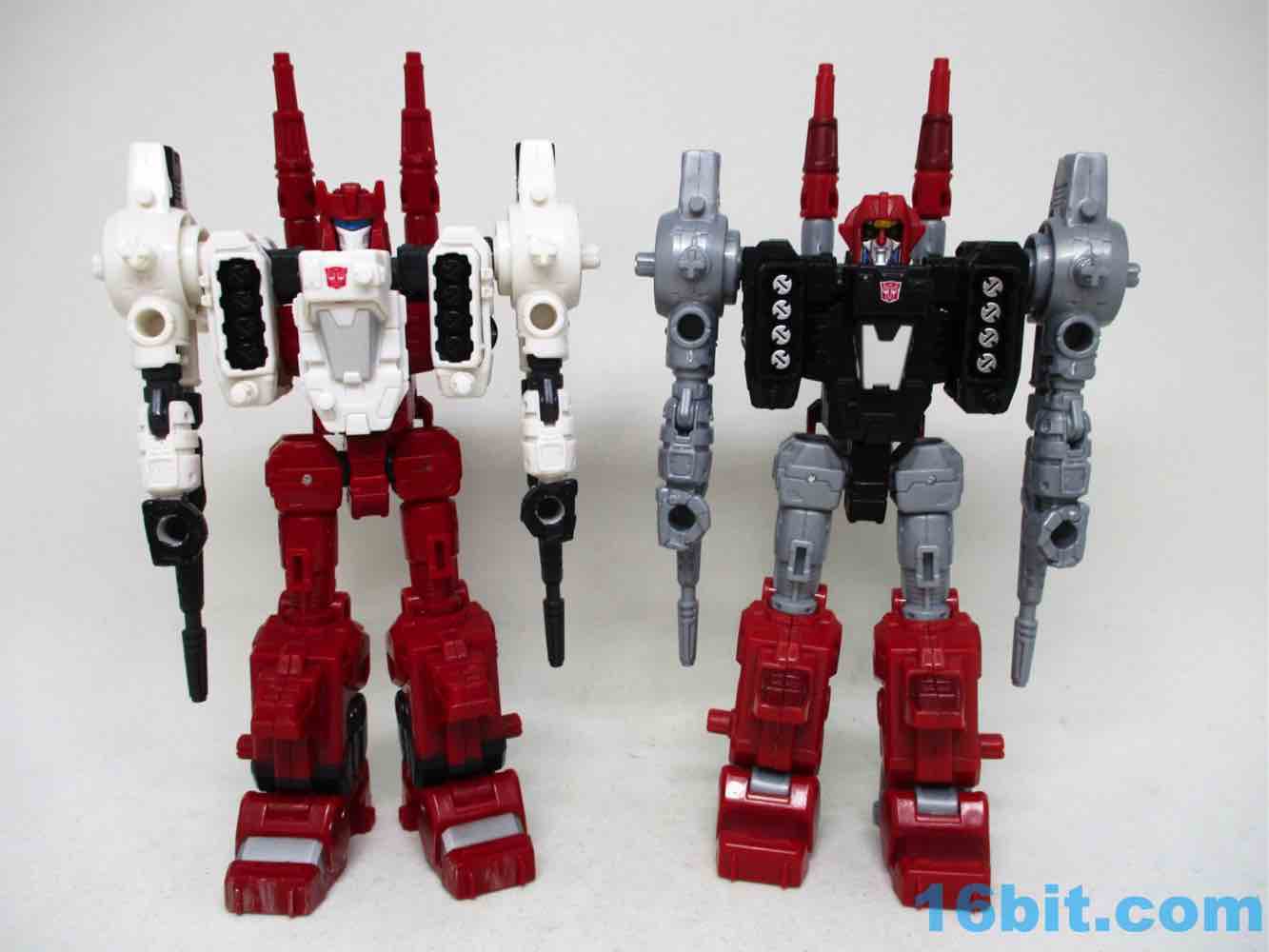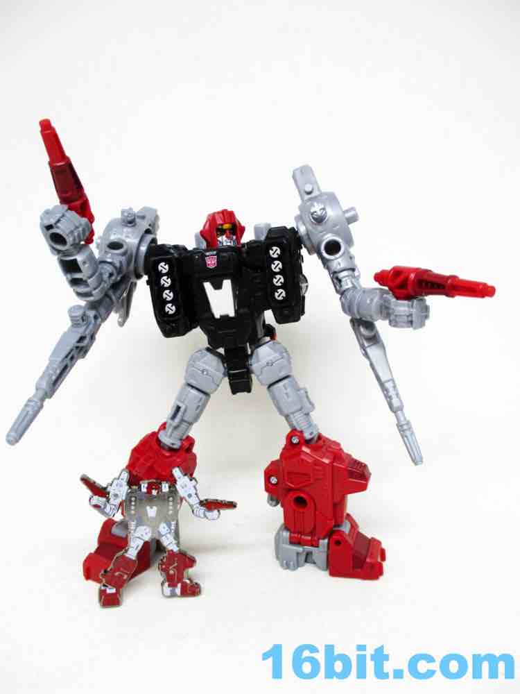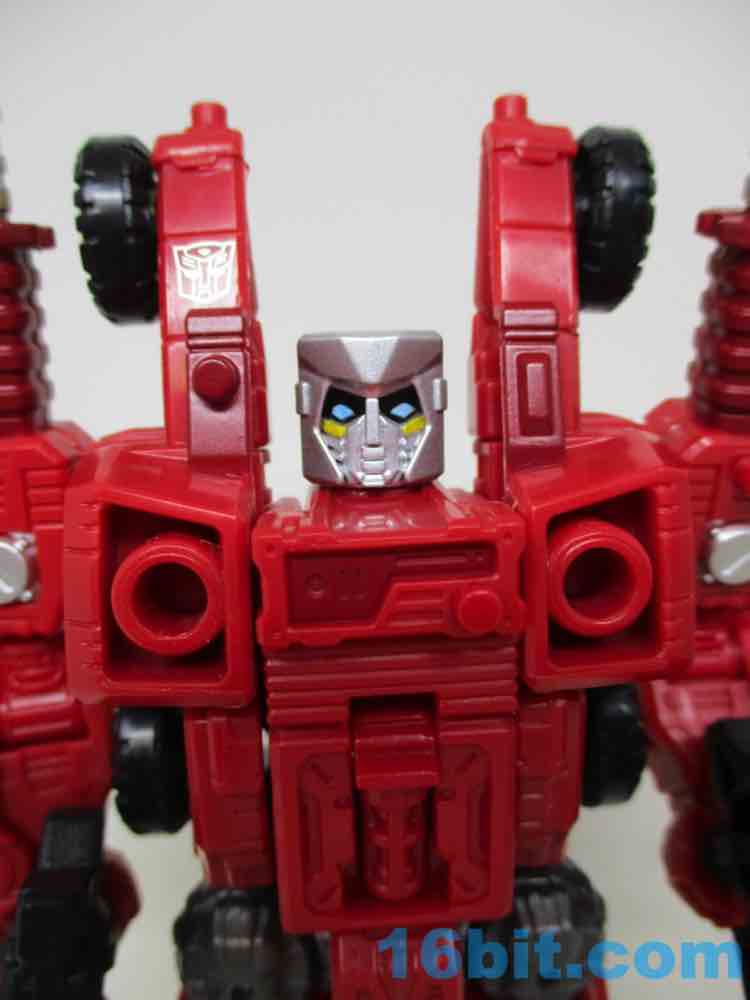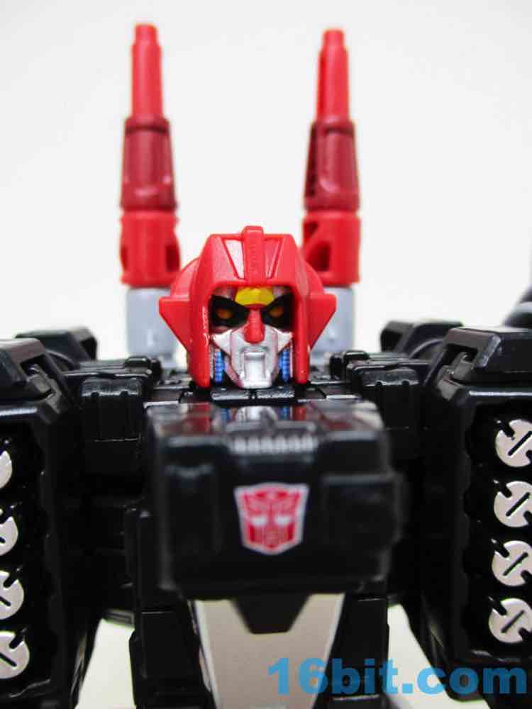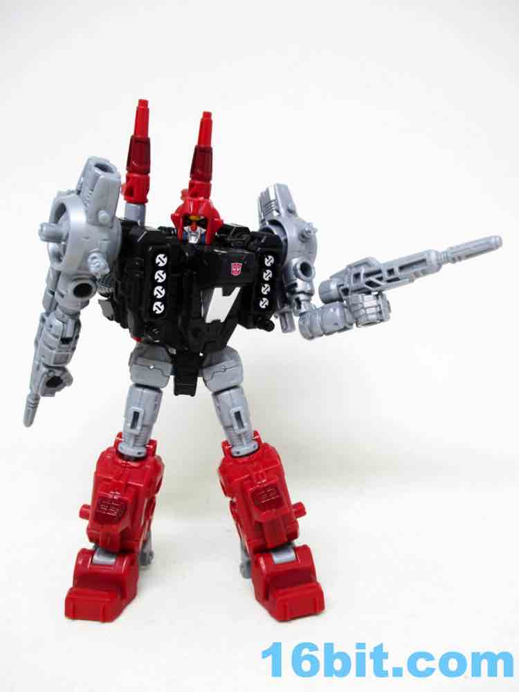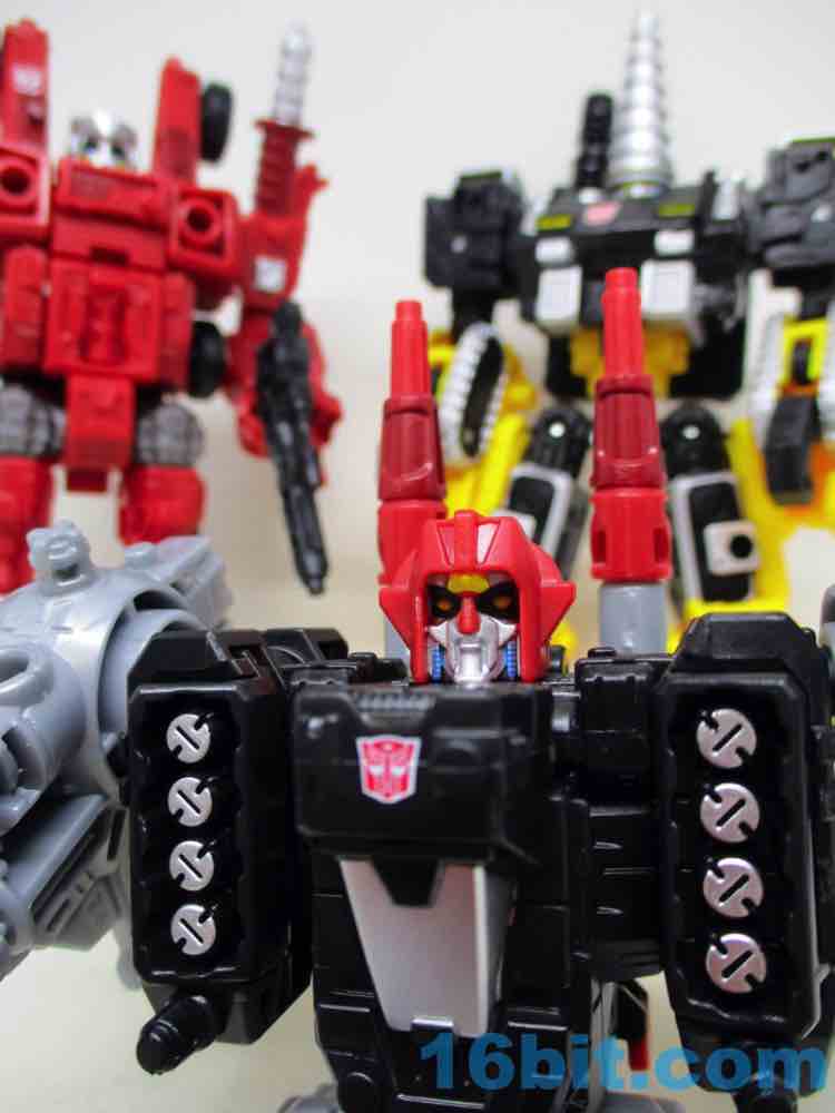 Part of what I love about these new Powerdashers is that the heads seem a little alien in the world of Transformers. Most of the toys from the 1984 line were generally a silver face with a color of eyes and maybe different plastic around the head as a sort of helmet. Cromar adds a big red nose as well as quasi Alice Coper eyes in the silver - just like the original toy. This one also has ears, which is an unusual feature for the era. The figure itself lacks the chrome of the original, but at least it looks cool and has a bit more "zing" than the original thanks to silver painted details on the chest and tons of extra weapons. Articulation is pretty good, but he and the other Powerdashers/Weaponizers/whatever lack things like swivel wrists and some of the nicer added parts from the other Siege toys. But you can take them apart, which is fun.