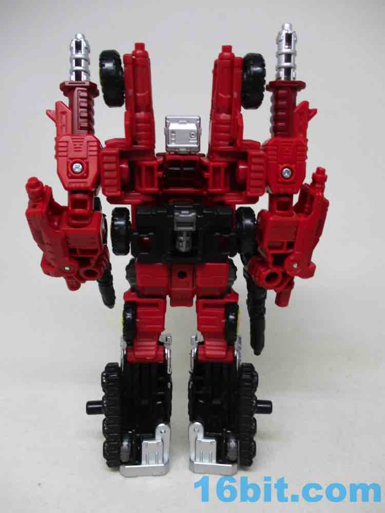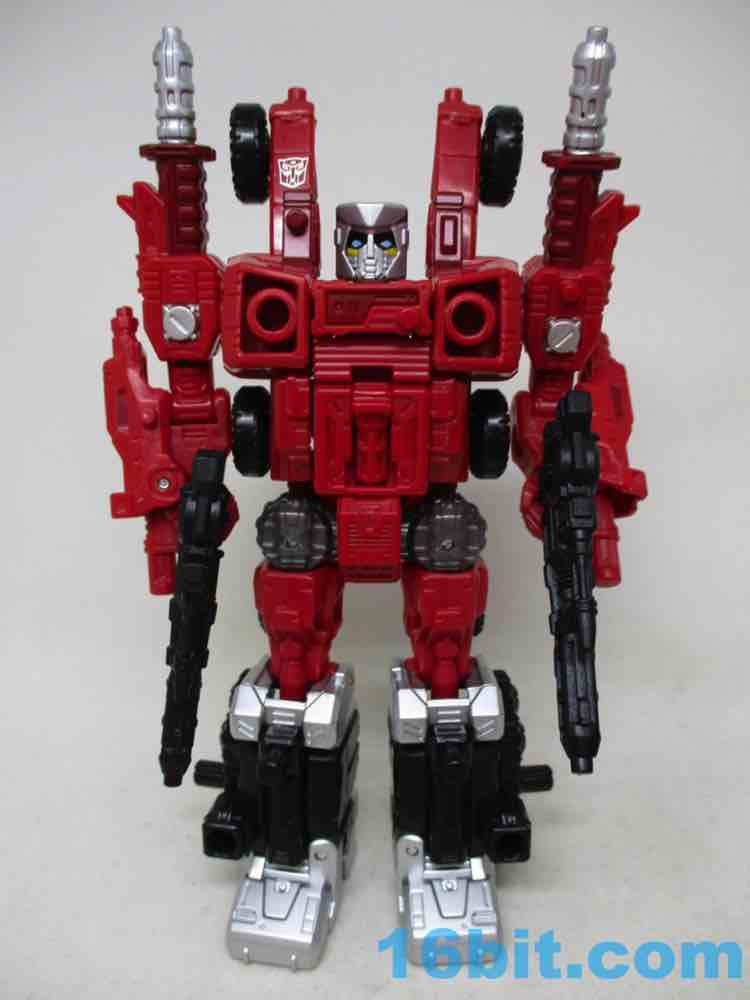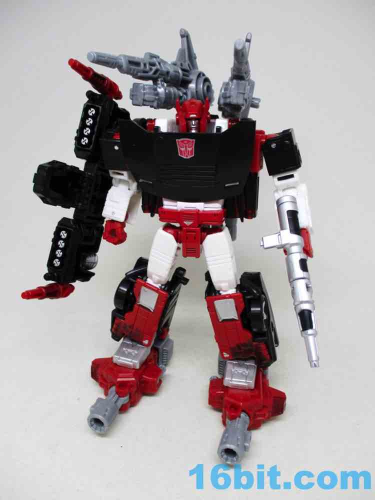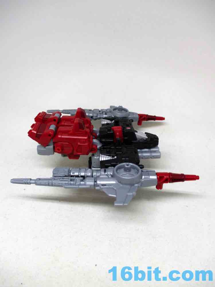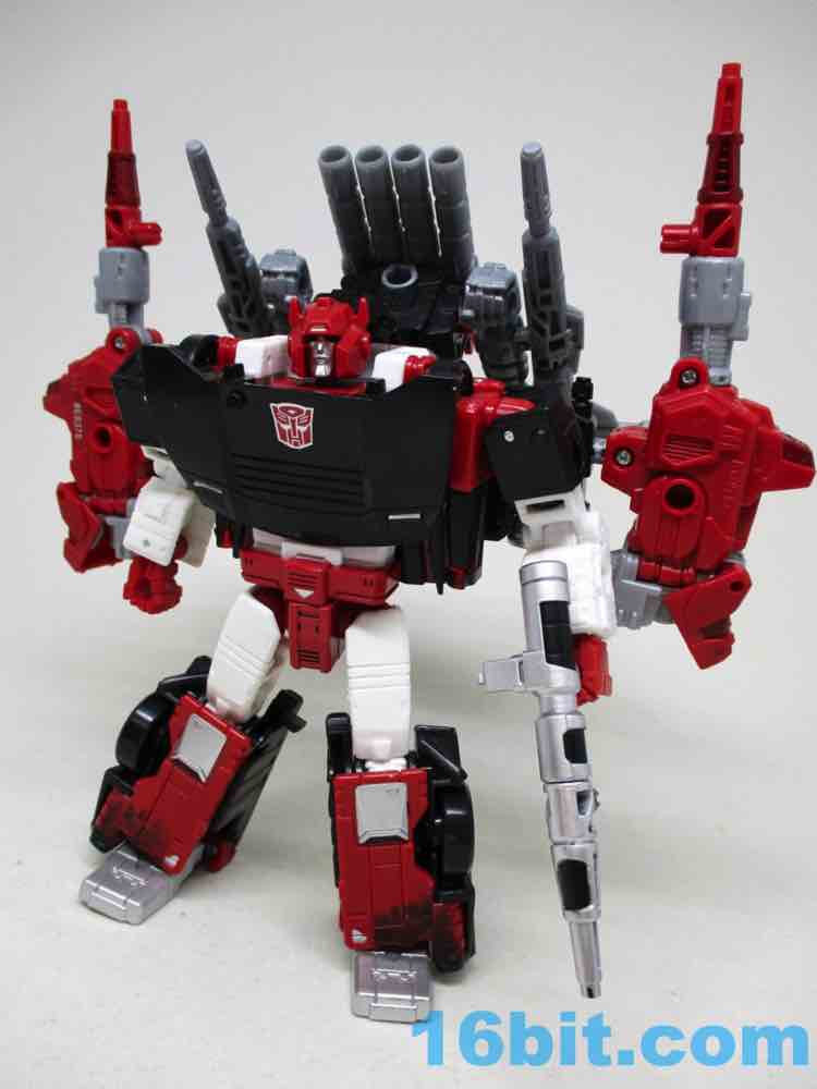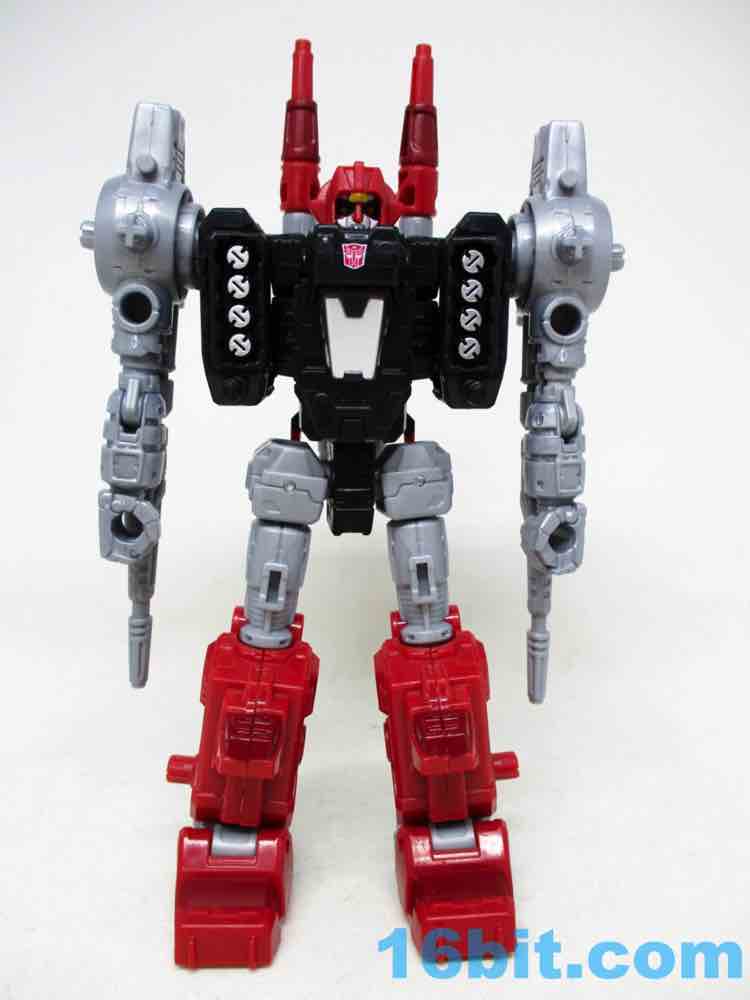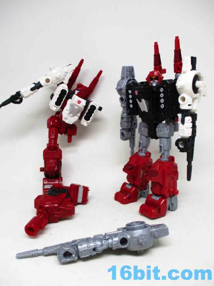Part of what I love about these new Powerdashers is that the heads seem a little alien in the world of Transformers. Most of the toys from the 1984 line were generally a silver face with a color of eyes and maybe different plastic around the head as a sort of helmet. Cromar adds a big red nose as well as quasi Alice Coper eyes in the silver - just like the original toy. This one also has ears, which is an unusual feature for the era. The figure itself lacks the chrome of the original, but at least it looks cool and has a bit more "zing" than the original thanks to silver painted details on the chest and tons of extra weapons. Articulation is pretty good, but he and the other Powerdashers/Weaponizers/whatever lack things like swivel wrists and some of the nicer added parts from the other Siege toys. But you can take them apart, which is fun.