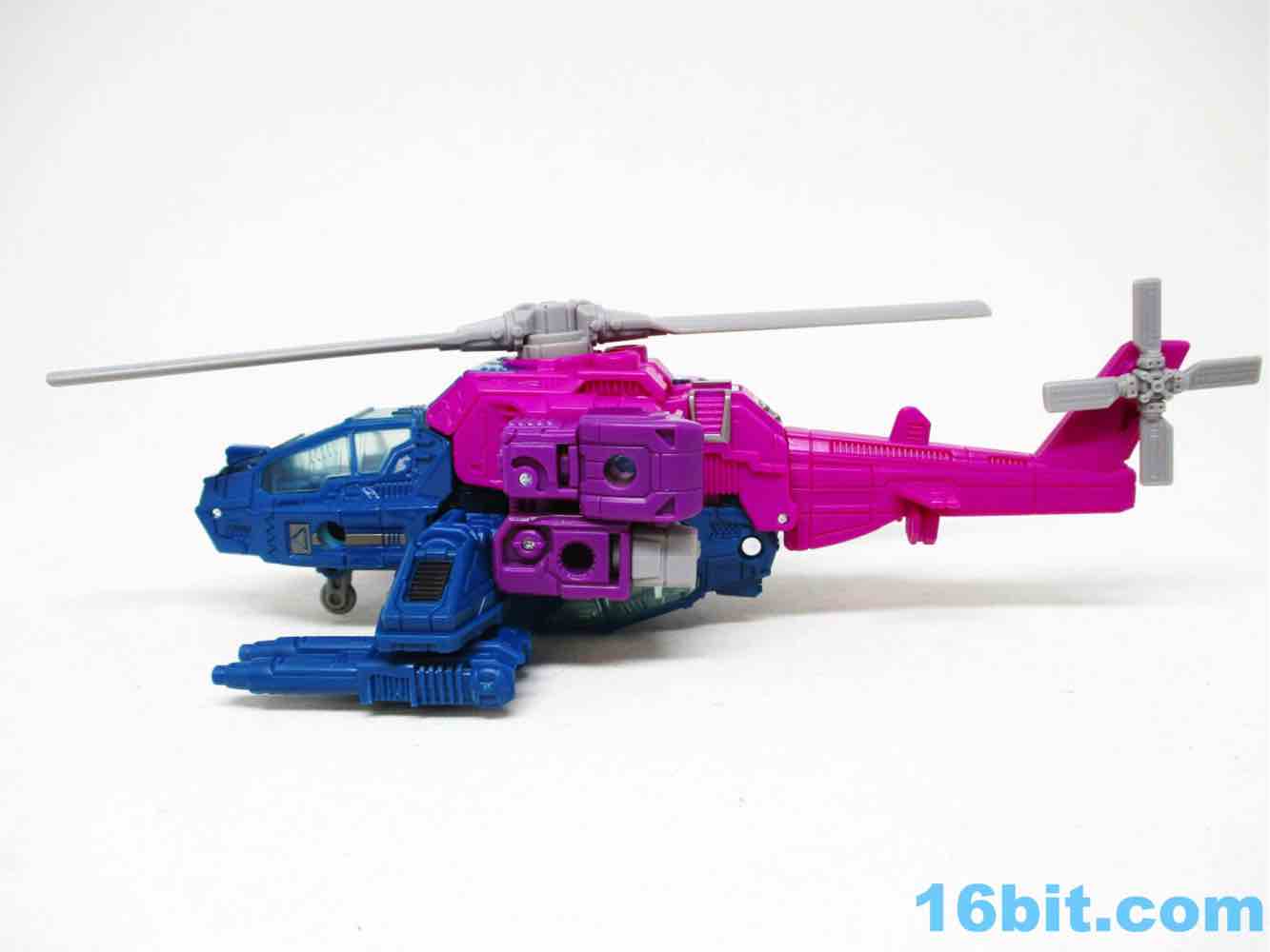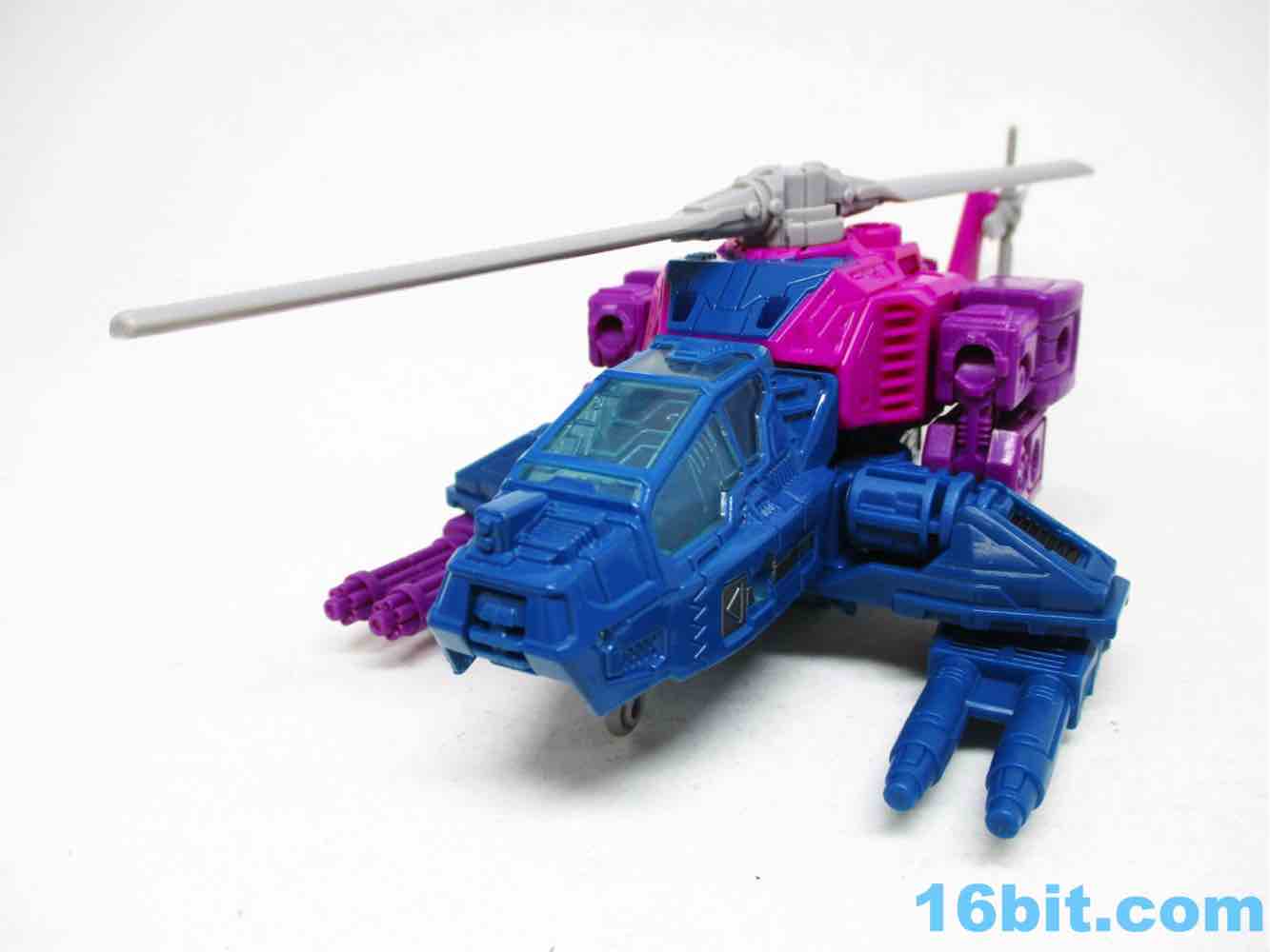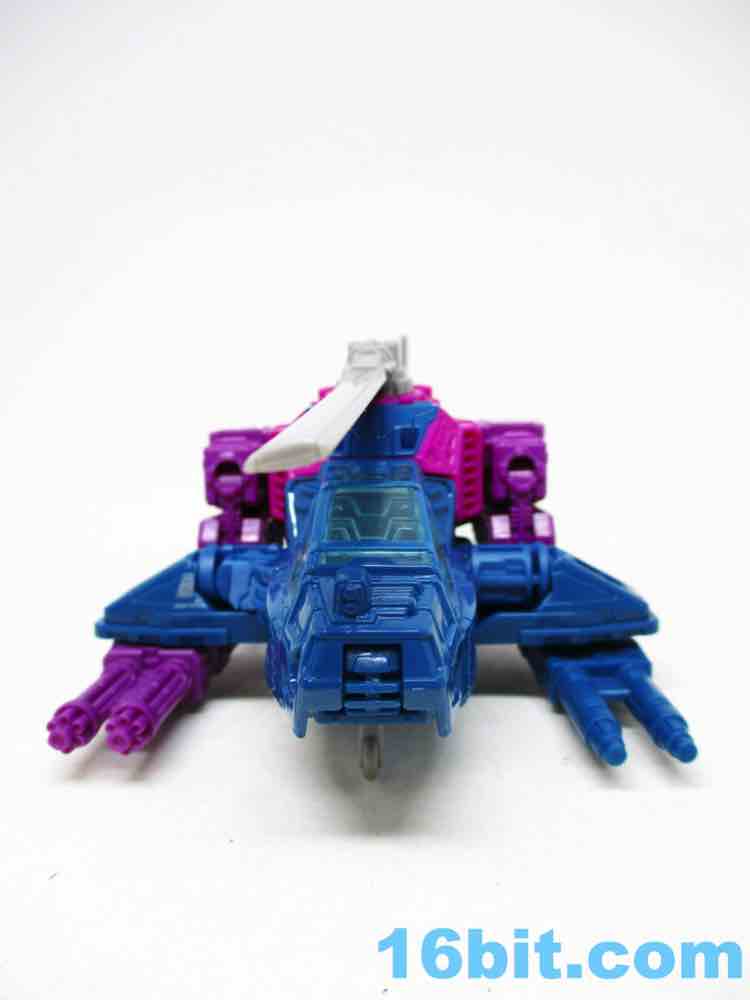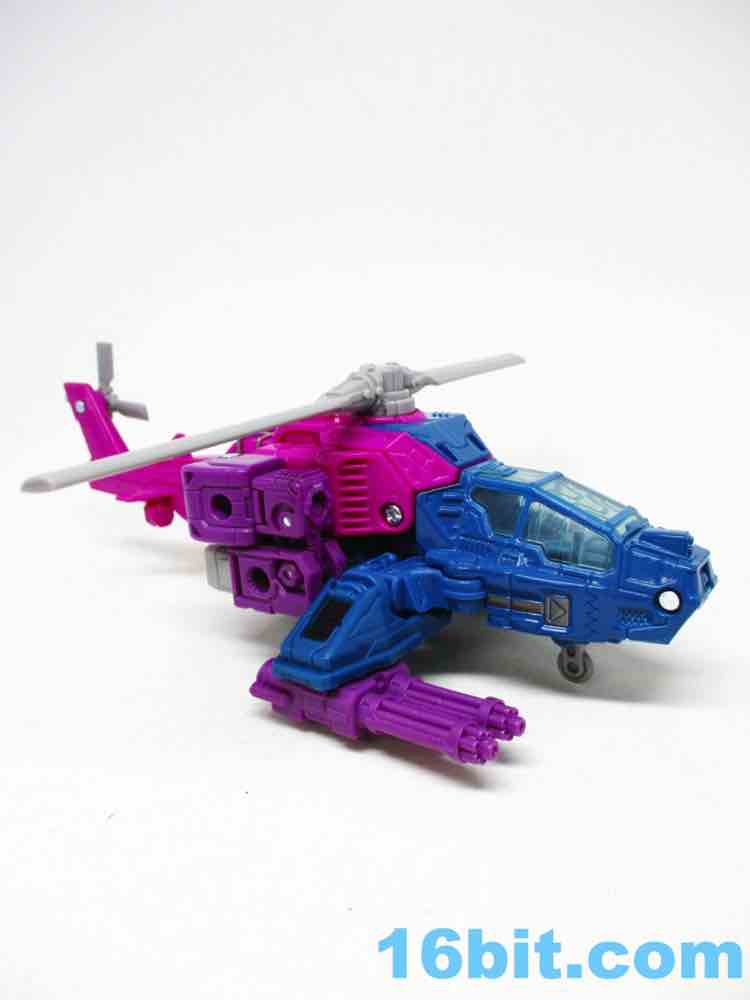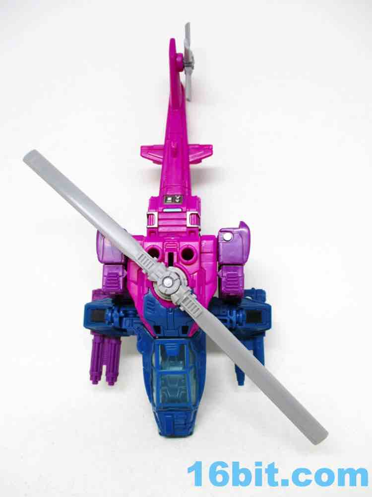 The helicopter is, unsurprisingly, a helicopter. Aside from the landing skid and spinning propellers, it doesn't do much that is likely to count as an action feature. It looks cool, the transformation is interesting, and it doesn't have much interesting battle damage paint to speak of - but you get a clear canopy, and that's nifty. With ample detailing, the figure isn't going to disappoint you with any flat, under-sculpted surfaces - but there's not much I can point to as being a fascinating landmark. It's bright, it's weird, I like it.