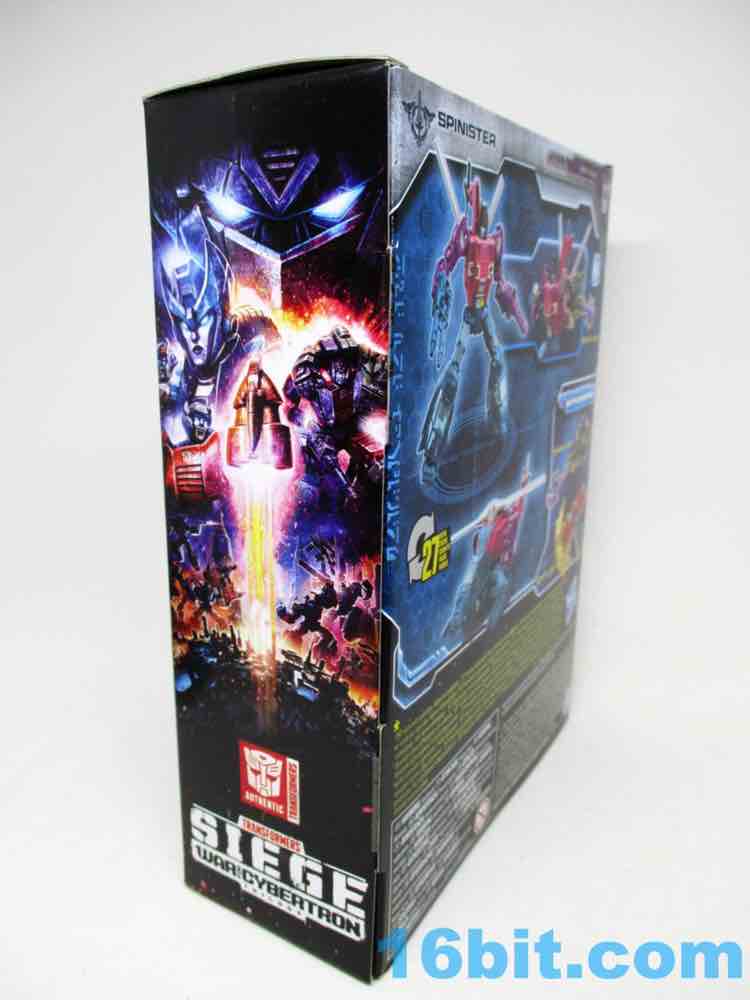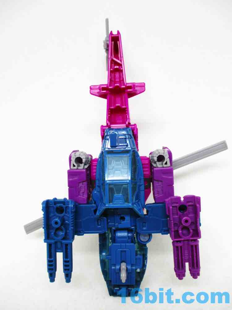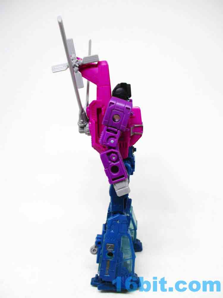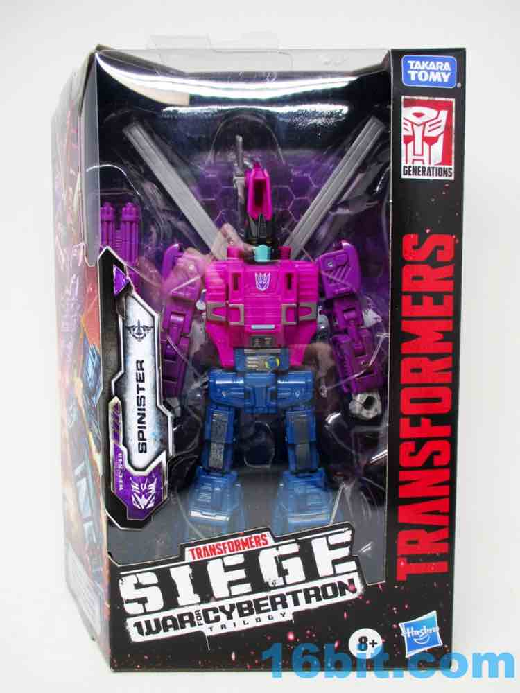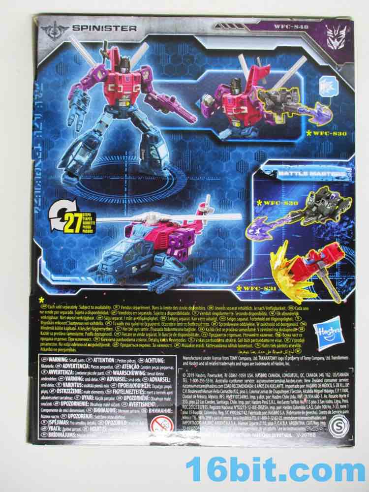 With double-jointed elbows needed for transformation, Spinister is no slouch. You get rocker ankles under a fake cockpit for one of his legs, excellent leg movement, and a range of movement that's close to one of those prestige 6-inch human figures from Marvel or Star Wars. Well... maybe not quite that good, but very close. The detail sculpted in the figure isn't as overwhelming as earlier Siege toys, but looks advanced enough to remind you it's no longer the 1980s - despite how his colors may look. I will say the blades on the back are a little wobbly, but the "V" position stays in place surprisingly well. Takara-Tomy and Hasbro did a fine job engineering this figure, and I'm so glad they did so I can not regret having missed the TFSS Combiner figure a few years ago.