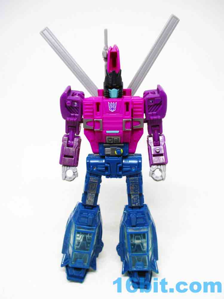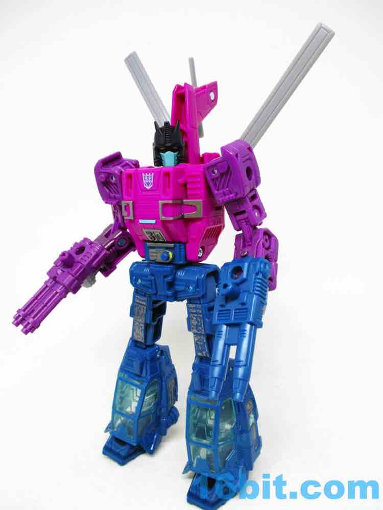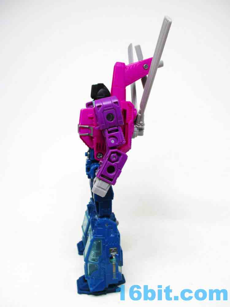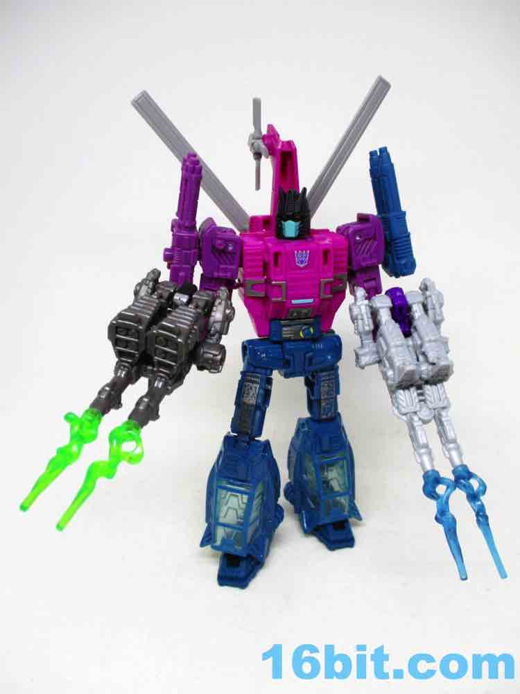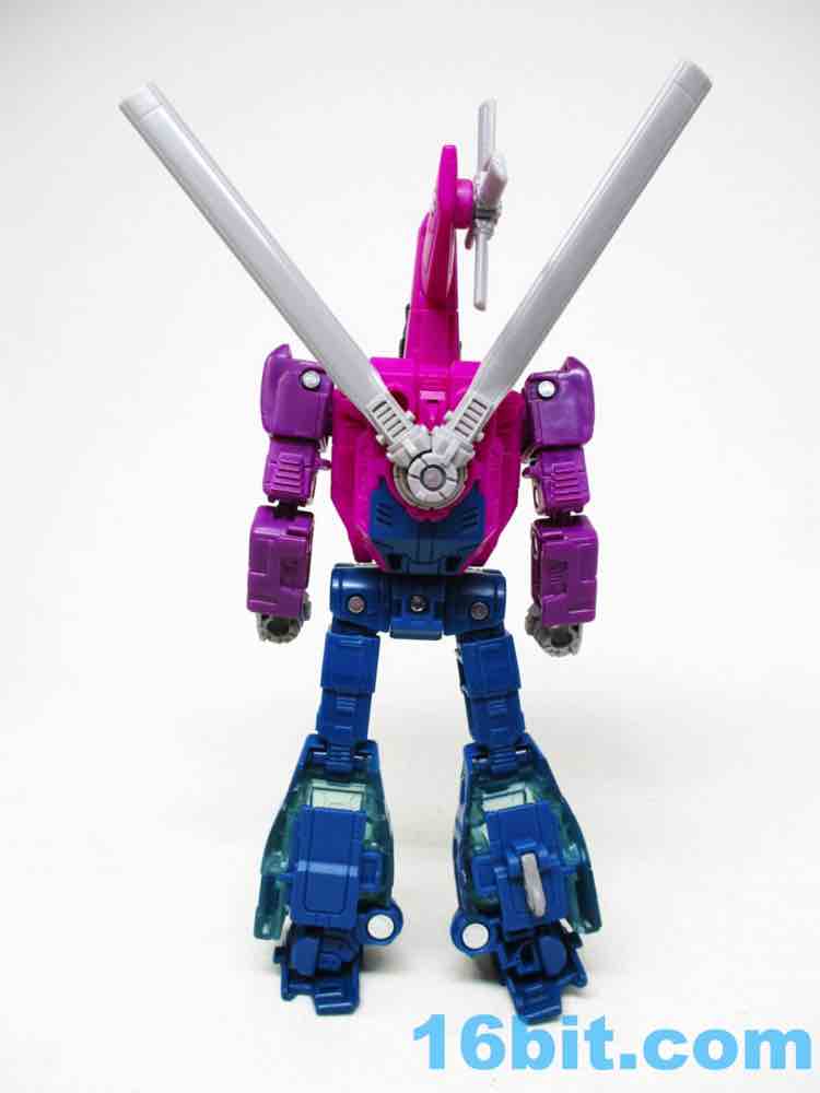 I have good news and bad news about Spinister, which you no doubt know. This exquisitely jointed figure makes up for old times when the figure was largely without articulation, but Hasbro packaged it with two blasters rather than two Targetmaster partners this time. The good news is that those missing partners are available elsewhere - Shrute [Hairsplitter, FOTD #2,147] is in the Phantomstrike Squadron set at Amazon while Singe is sold individually for six bucks. If you need Targetmasters, you can get them - but the coloring is a little different this time out. But we're here to talk about Spinister, which is an excellent purple/blue/pink robot standing about 6-inches tall at the top of the head. And you should get it if you see it, at least to mess with its strange transformation.