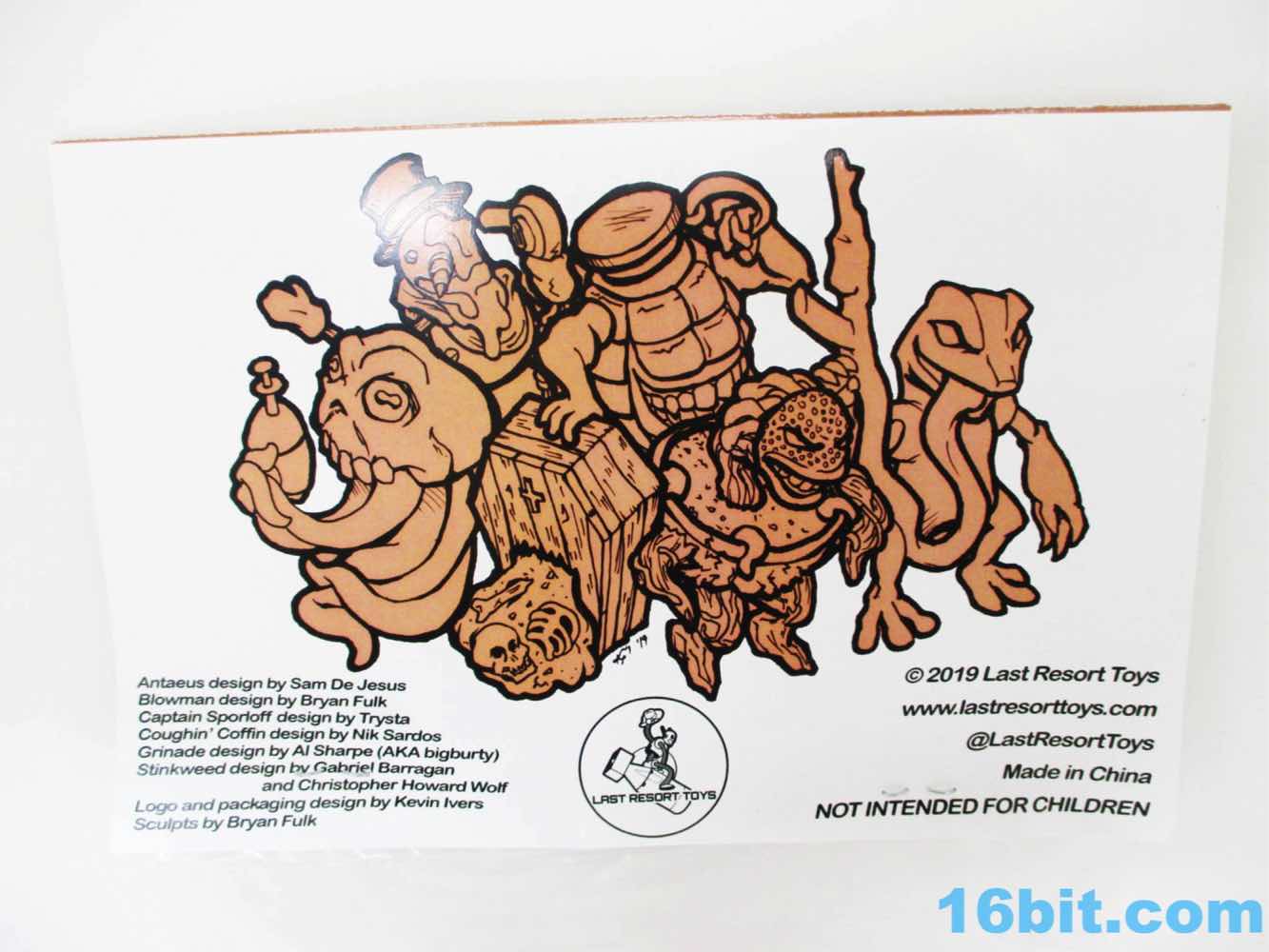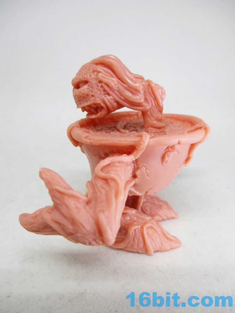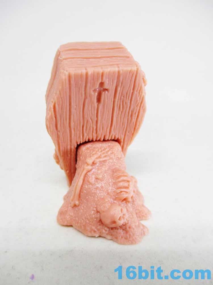 Coughin' Coffin (Nik Sardos) and Stinkweed (Gabriel Barragan and Christopher Howard Wolf) round out the collection. I remember seeing Nik's coffin design years ago when voting took place on the October Toys forums for previous series of O.M.F.G., and I was always disappointed it didn't win. It's an excellent design - much like Puke Knight, the barf is a separate element. Unlike Puke Knight, there's significantly more detail to enjoy here - every piece is textured on every side. The base of the coffin is textured like wood, and there are barfy details under the puke pile too. The coffin itself has a tongue that holds the spew in place quite nicely, while also connecting to a tongue-shaped imprint in the bottom. Coughin' Coffin is loaded with interior mouth detail too, plus you can see bones and a skull inside the pile of dirt. I'm tempted to buy one of the clear sets just to see this in clear blue or clear red. This feels like the design that got the most attention by the sculptor, and is arguably the set's most remarkable figure. Your mileage may vary.