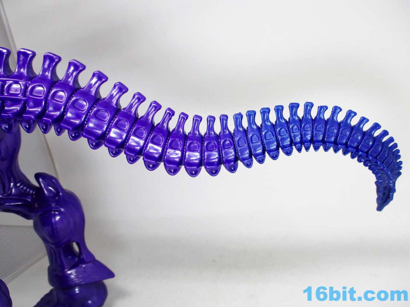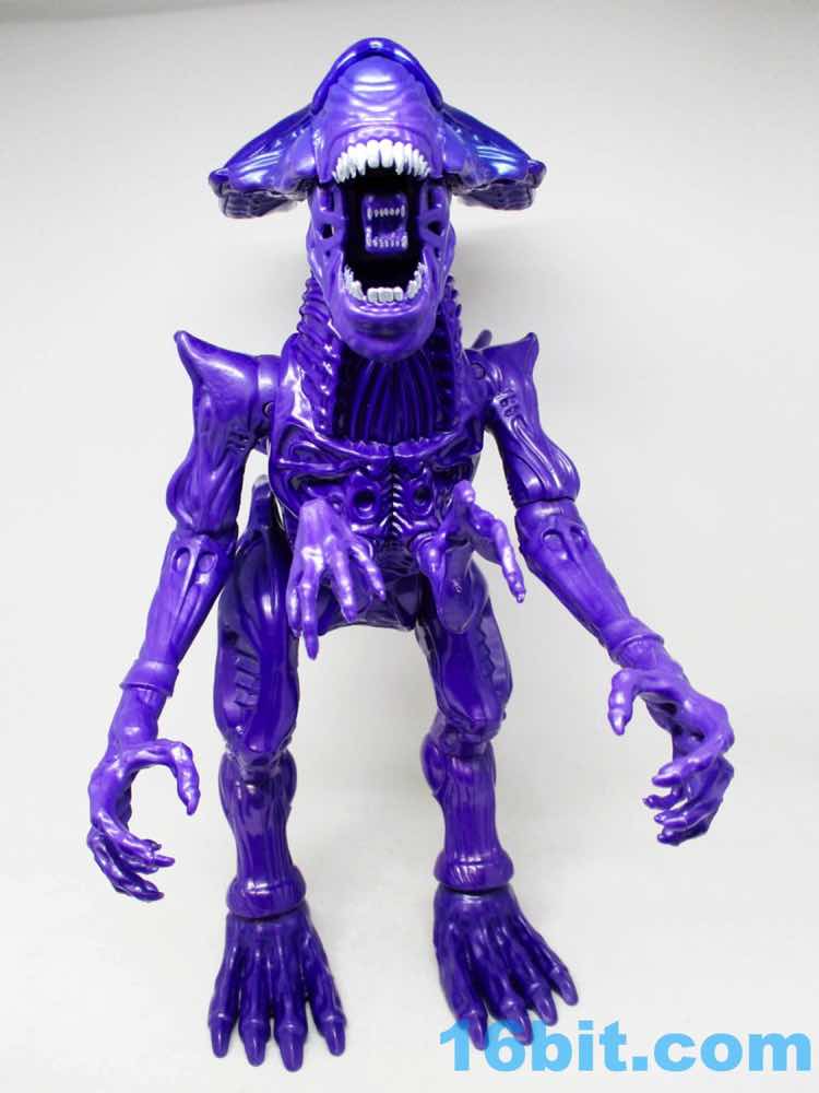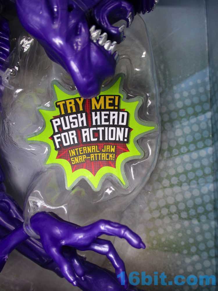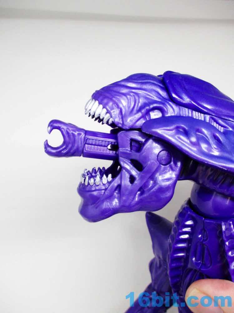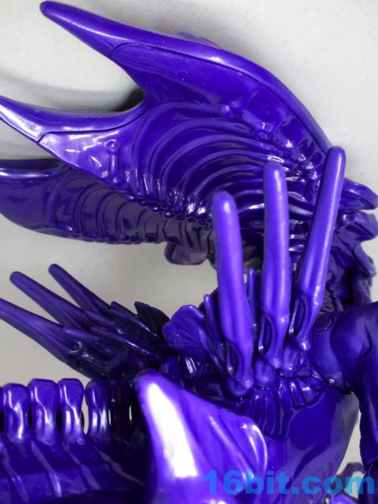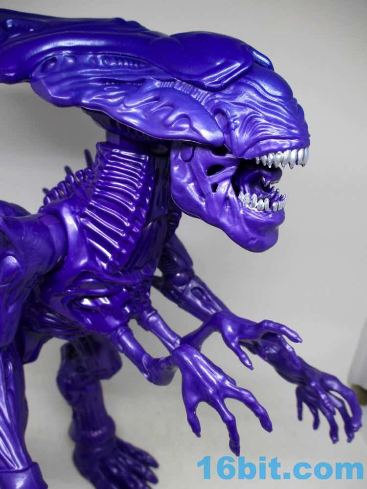 In terms of proportions, it seems she's a cross between Kenner's Alien Queen - a bit deformed and off-model - and what we see in the movies. The head feels a bit closer to Kenner's interpretation, but with a few really nice features. The jaw can open and close, with retractable jaws in the mouth that shoot out when the jaw is open and the head is tilted back. Her teeth are painted a dark silver color, which brings the figure to life - otherwise she's purple with metallic purple highlights on the head and tail.
