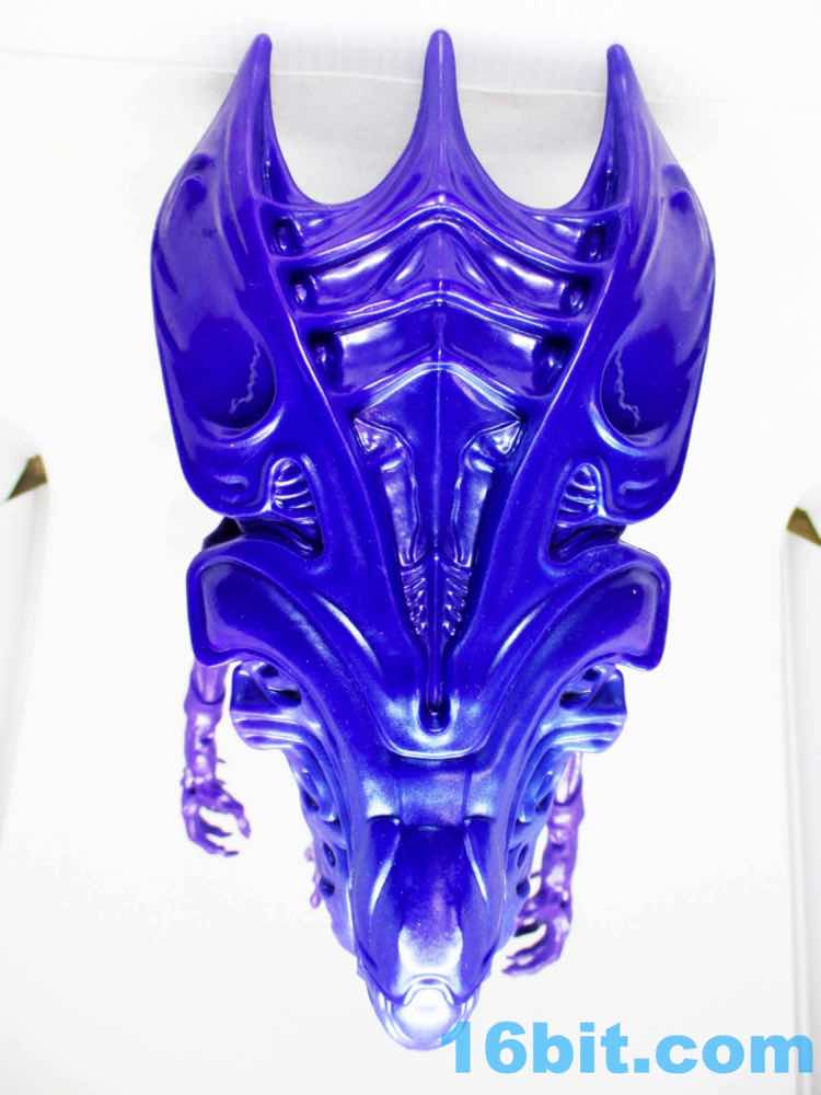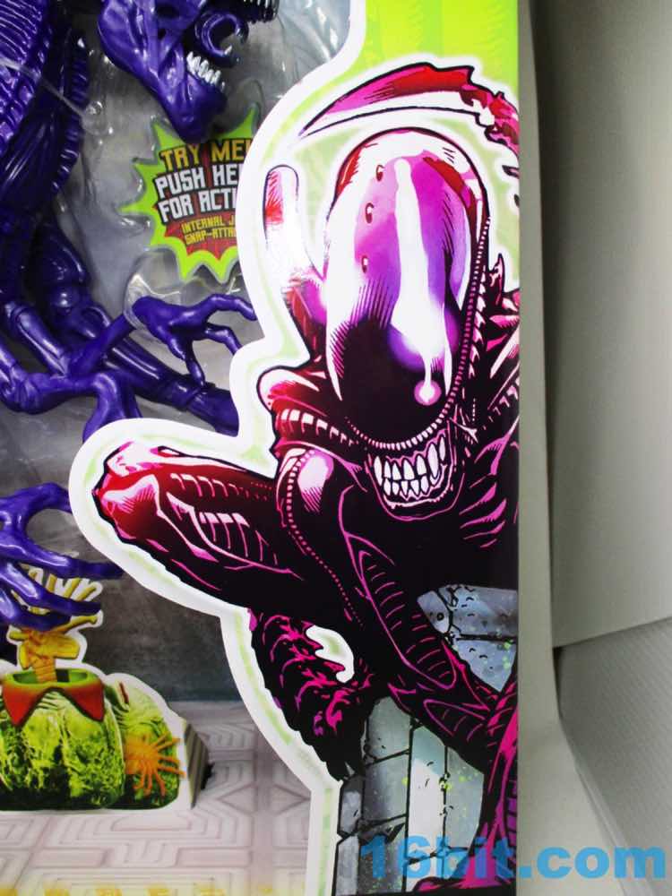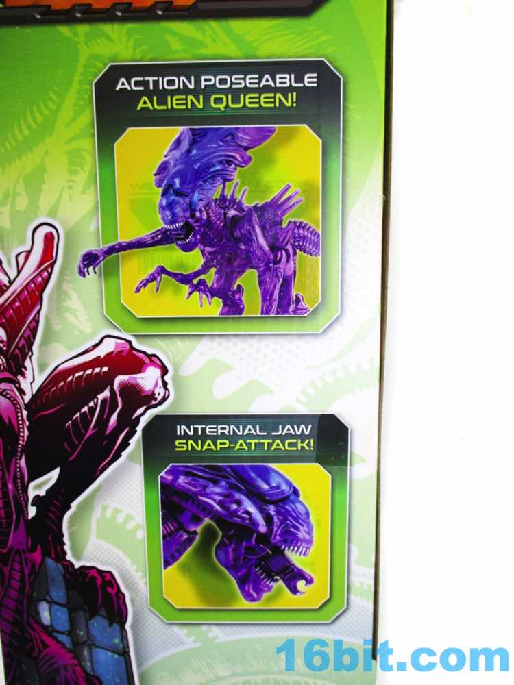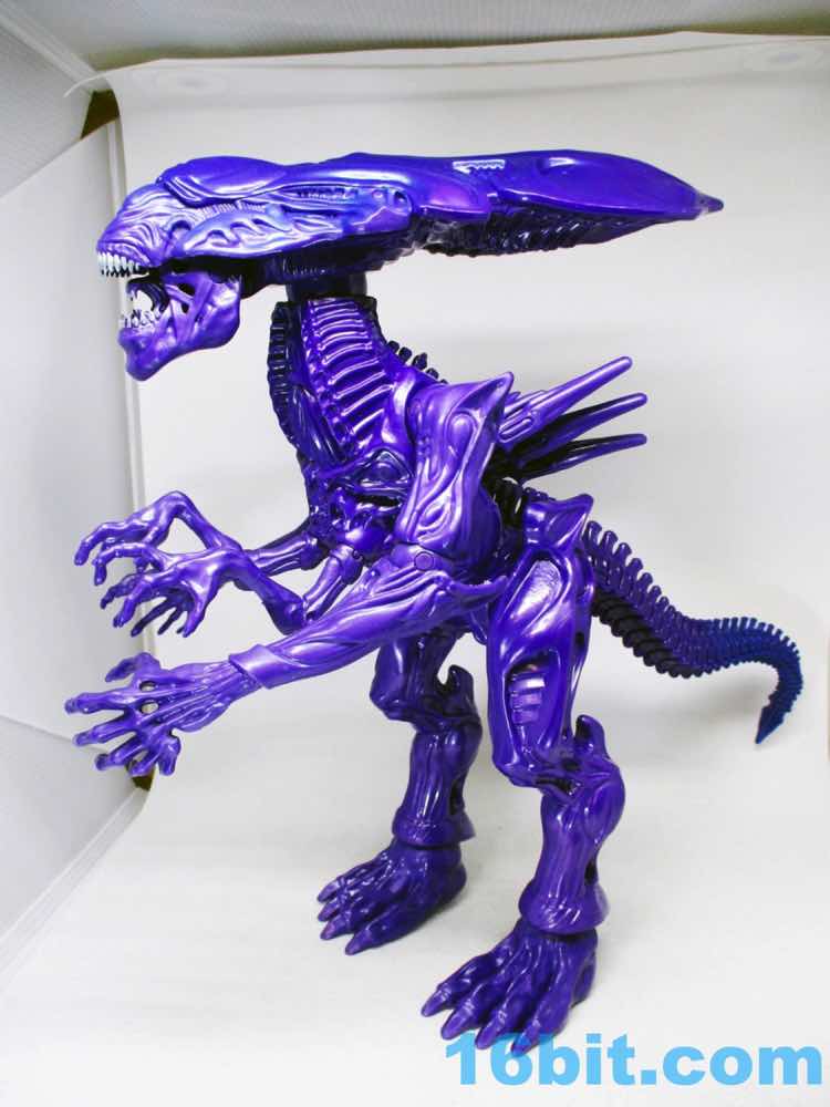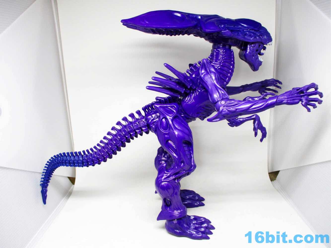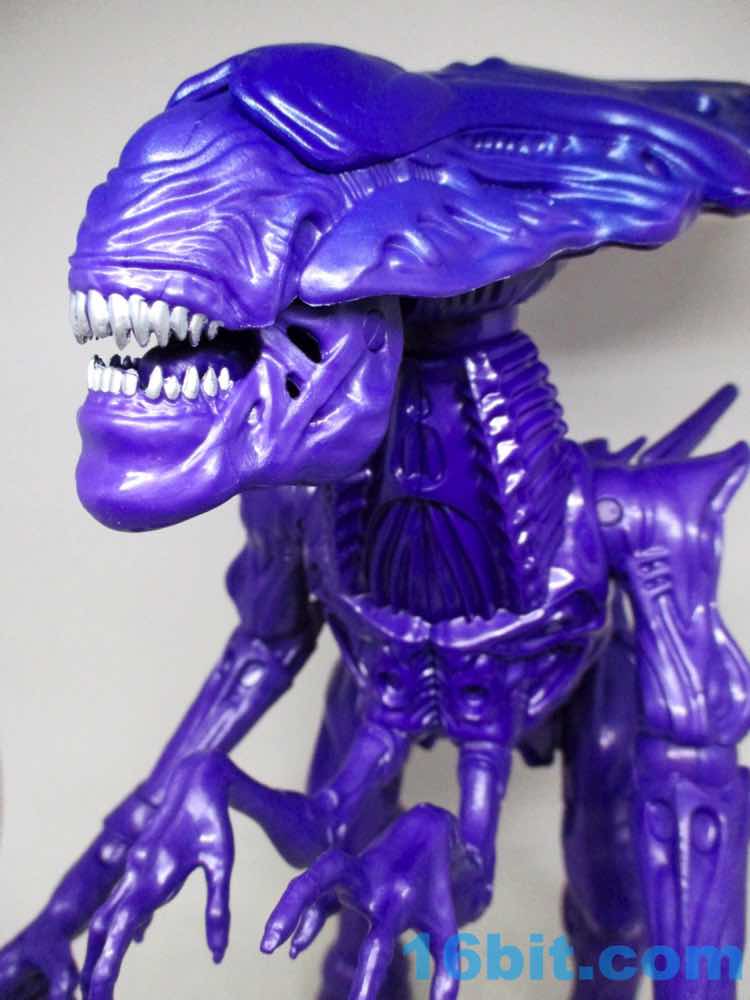 In terms of proportions, it seems she's a cross between Kenner's Alien Queen - a bit deformed and off-model - and what we see in the movies. The head feels a bit closer to Kenner's interpretation, but with a few really nice features. The jaw can open and close, with retractable jaws in the mouth that shoot out when the jaw is open and the head is tilted back. Her teeth are painted a dark silver color, which brings the figure to life - otherwise she's purple with metallic purple highlights on the head and tail.