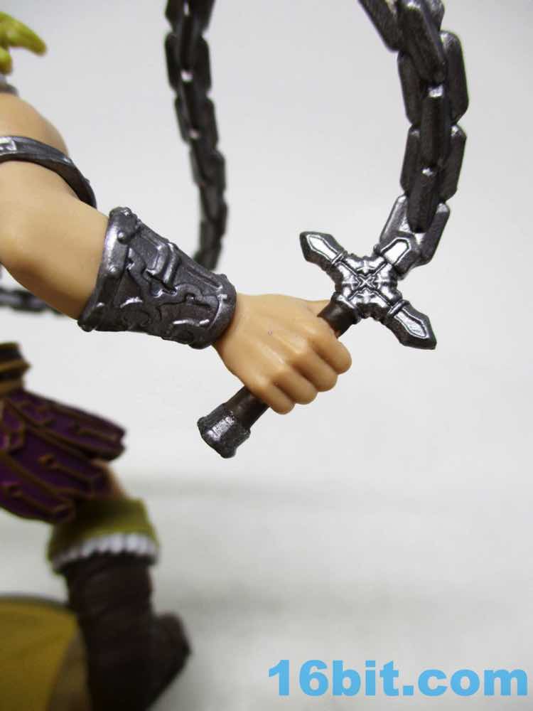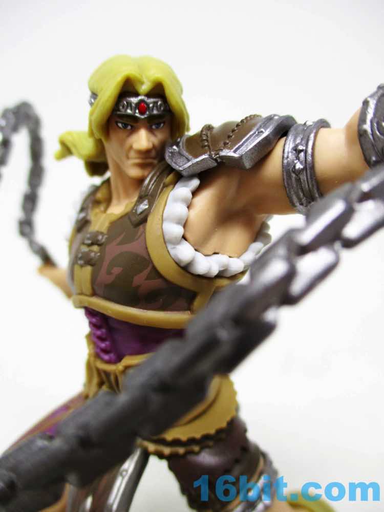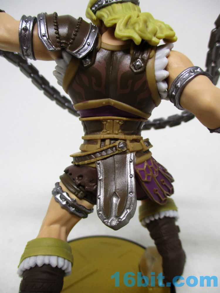 His whip appears to be fully powered-up, molded in a twisting pattern and fused to the bottom of his arm. The little statue is made of multiple pieces of plastic molded in different colors with light paintwork on them, but what amazed me the most about the figure was the strange pose. His feet are hanging off the base, and to fudge it they're connected to clear blocks. This allows the figure to maintain a certain sense of scale with the rest of the line while keeping the base a consistent size. It's weird. It's clearly an intentional decision to showcase the figure a this particular size with his arms extended, his hair flowing, and his thighs positively huge.
