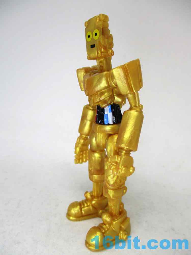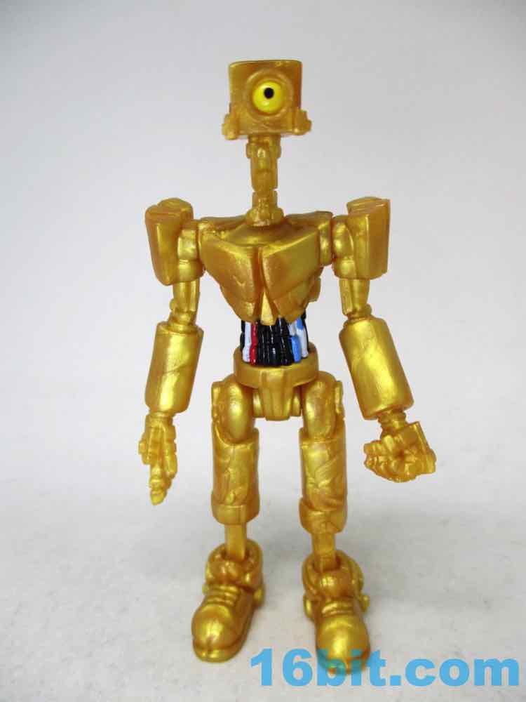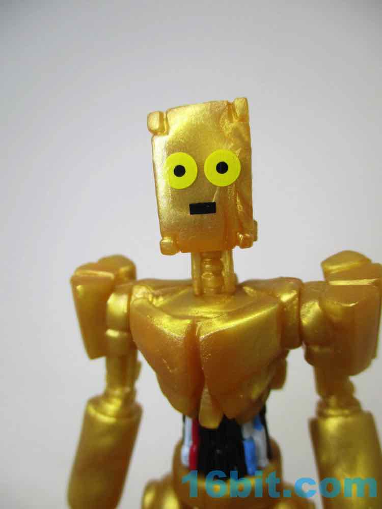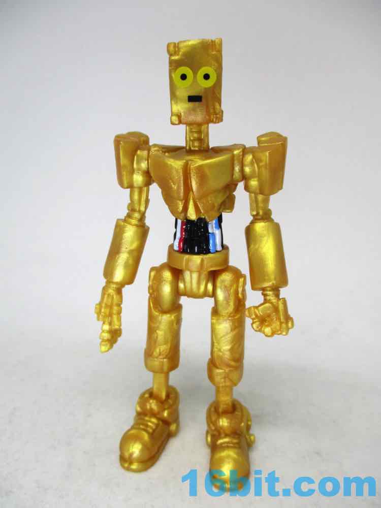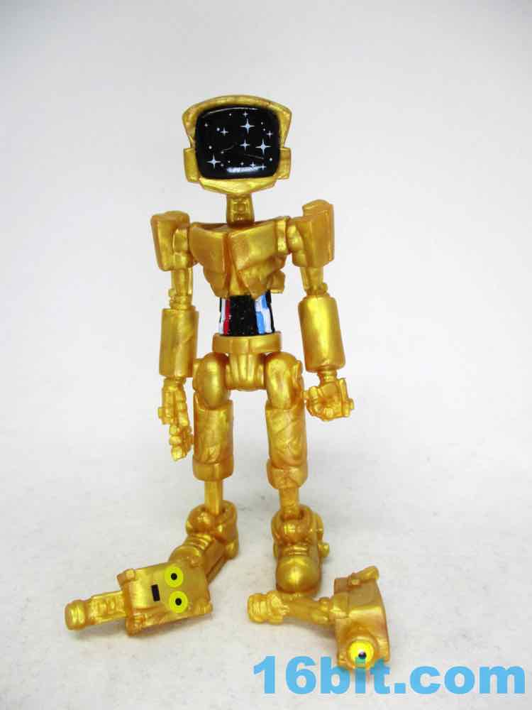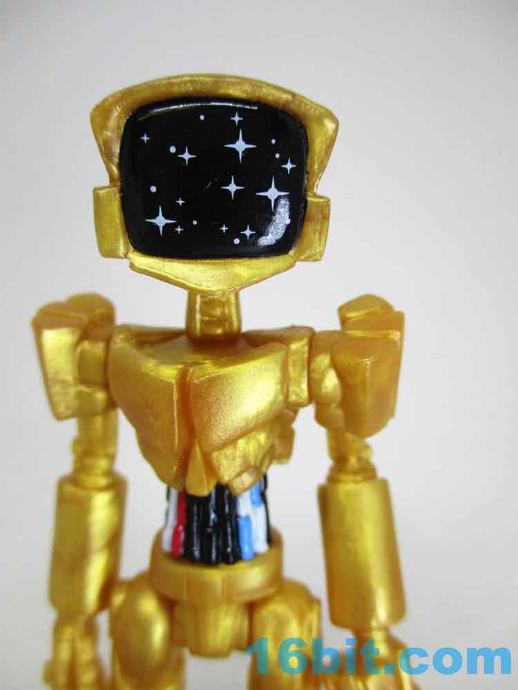 The 3 1/4-inch figure has a monitor head by default, and this time around it's covered in stars. It can also be removed and replaced on an alternate peg, giving a second face to your droid. Another head looks like a golden surveillance camera - complete with eye - while the last head is basically a flat surface with a smiley face on it. It just happens to remind people of C-3PO, while not even resembling the form - it's amazing what a little color can do!