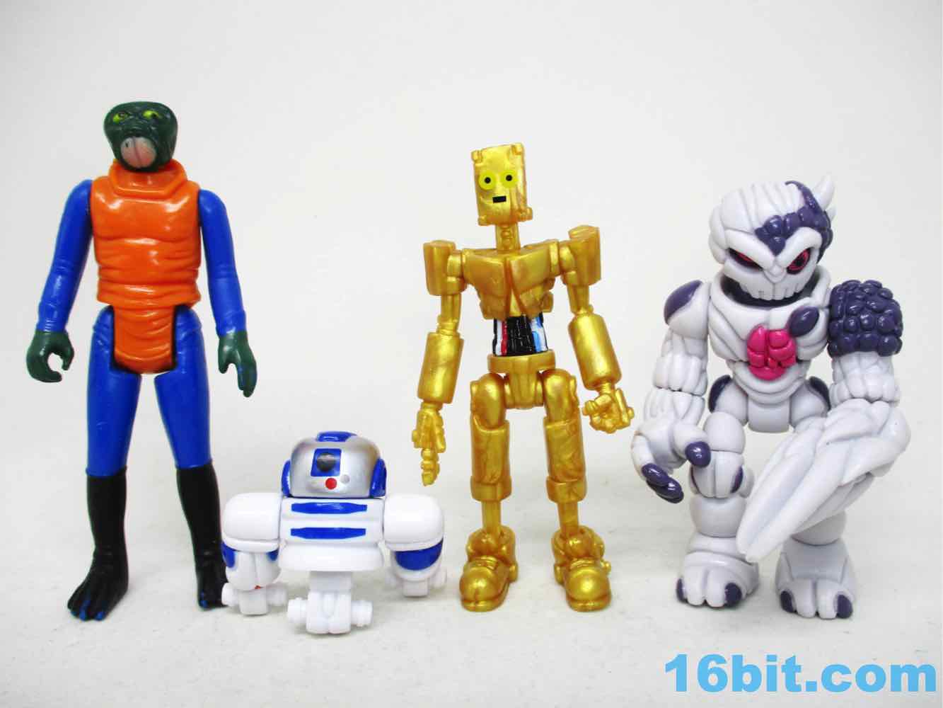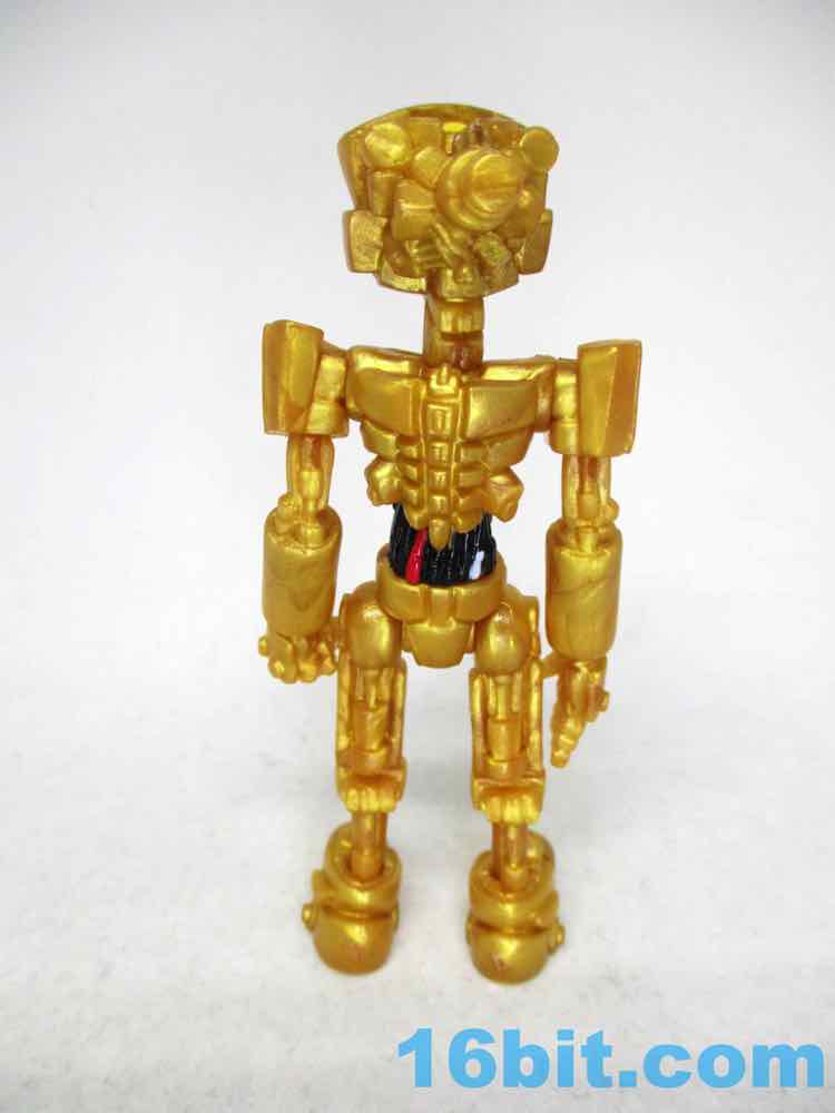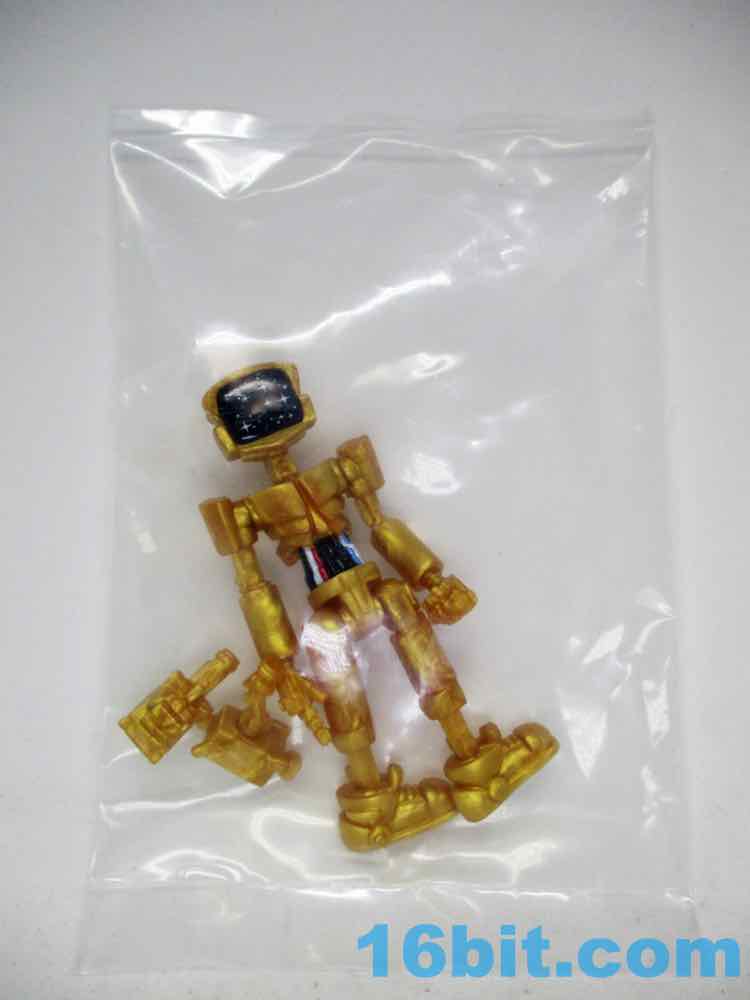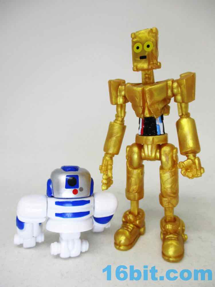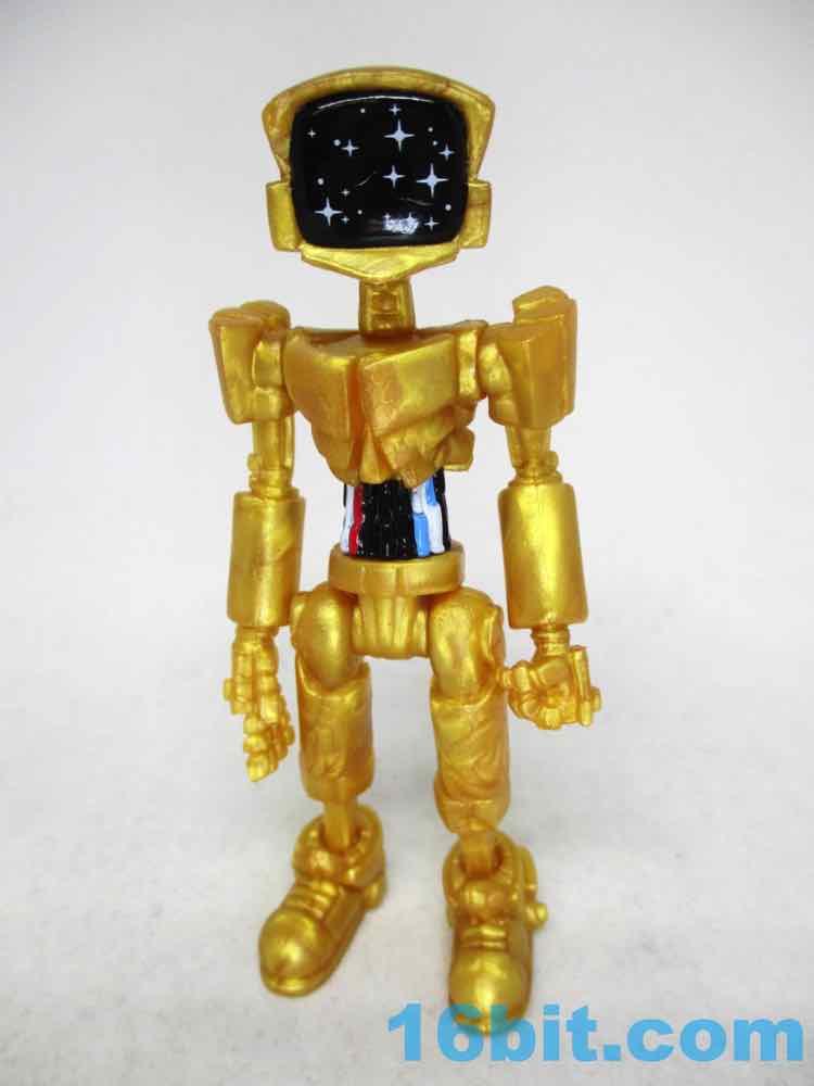 The 3 1/4-inch figure has a monitor head by default, and this time around it's covered in stars. It can also be removed and replaced on an alternate peg, giving a second face to your droid. Another head looks like a golden surveillance camera - complete with eye - while the last head is basically a flat surface with a smiley face on it. It just happens to remind people of C-3PO, while not even resembling the form - it's amazing what a little color can do!